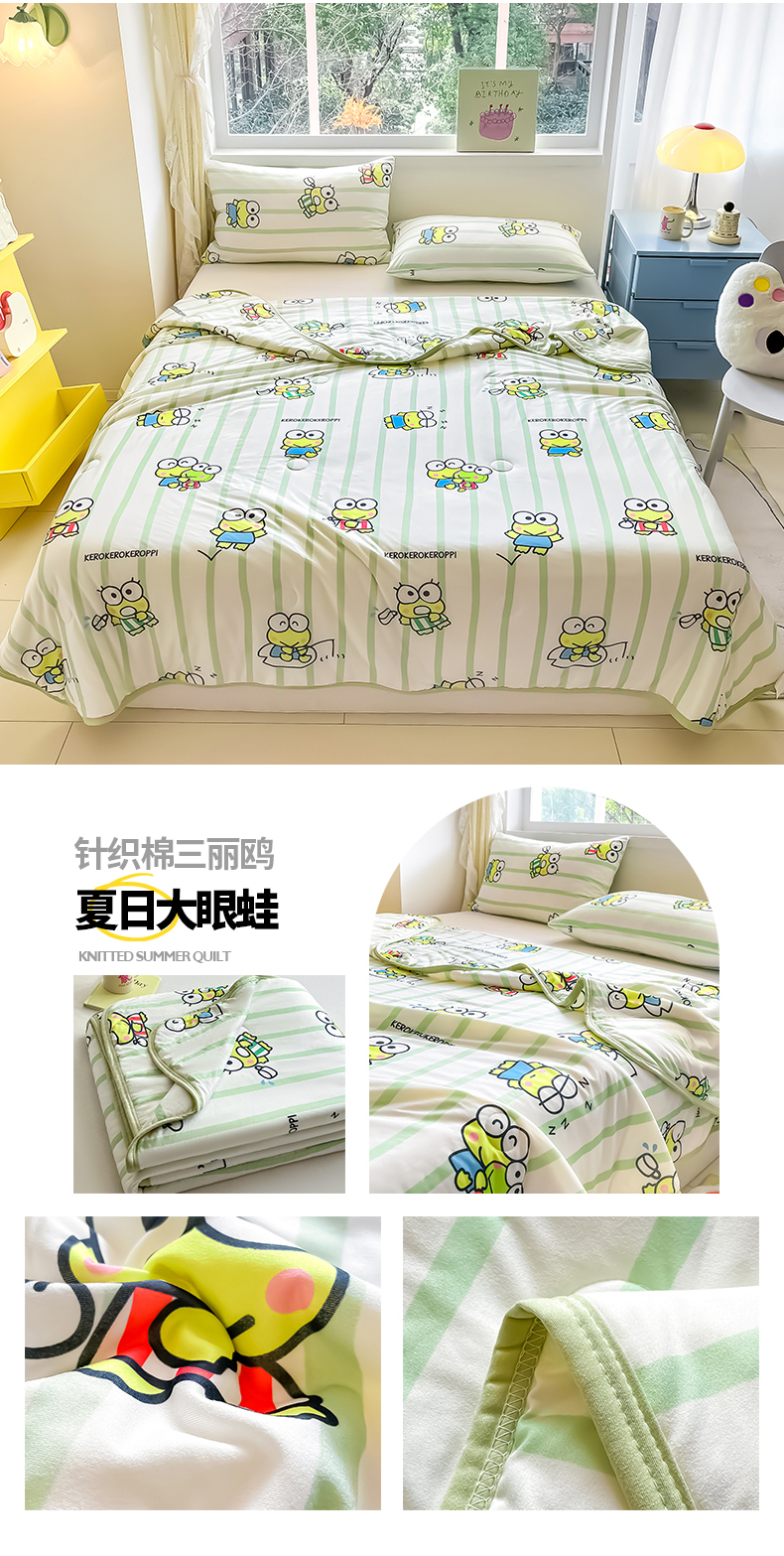 • 91家纺网 家纺一手货源 找家纺 金爱家2025新款A类三丽鸥正版授权高品质牛奶丝软糯针织棉大豆夏被系列详情 针织棉三丽鸥-夏日大眼蛙