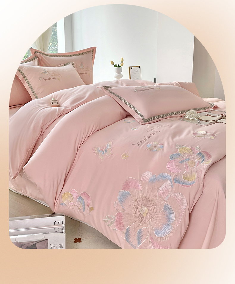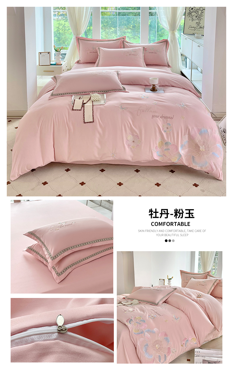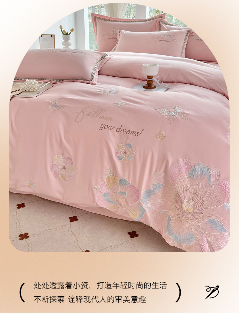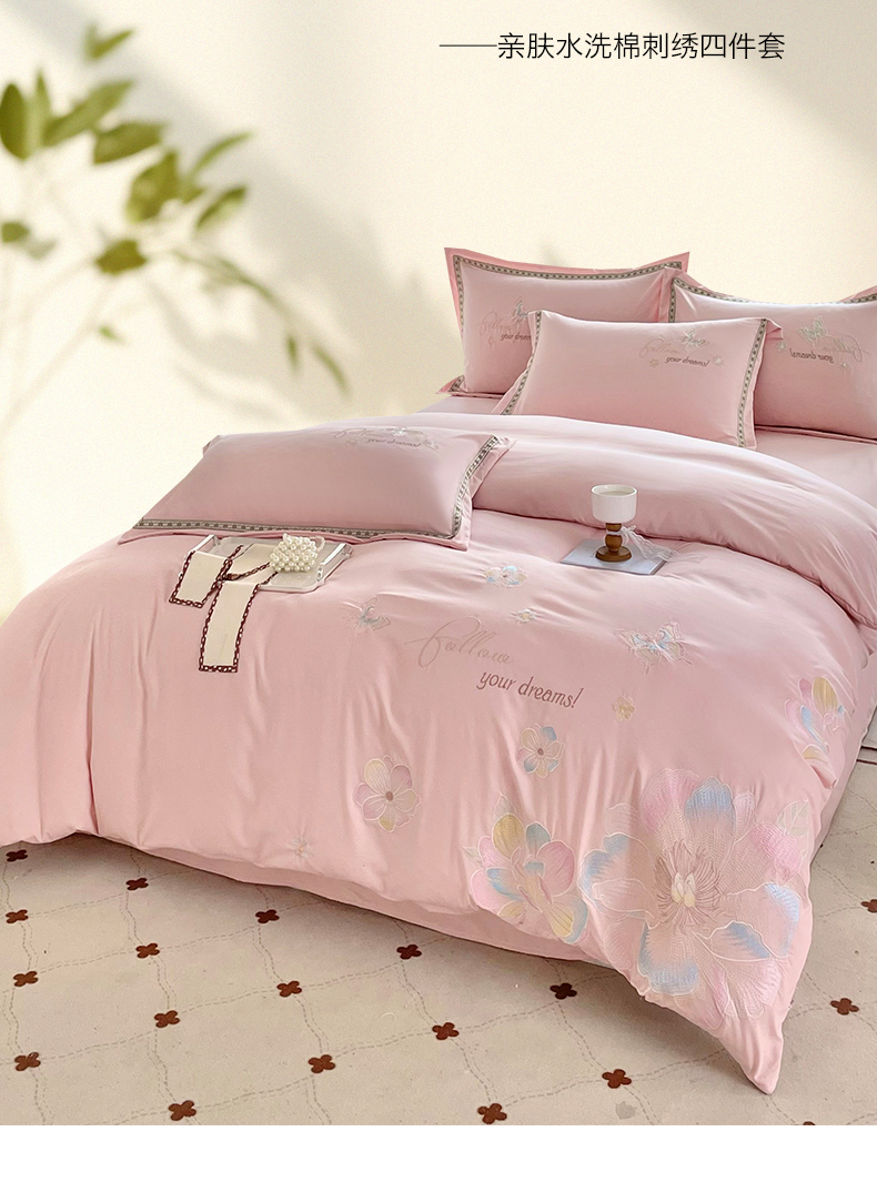 (总)佳宇轩 2025爆款水洗棉五彩刺绣四件套简约轻奢织带绣花床单床笠被罩4件套-牡丹