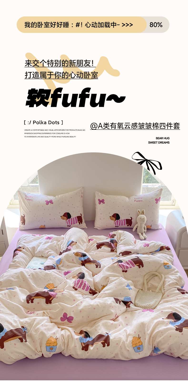 (总)【提供买家秀】2025直播云感皱皱棉四件套水洗棉简约风小碎花被套床笠三件套-叠拍图,一帘幽梦,波点白,蛋糕熊,繁花兔,繁华,馥芮白,馥芮蓝,好事橙双,玫瑰庄园,叛逃小狗,蜻蜓点水,同心结,童话森林,小桃糯糯,幸运狗,组合