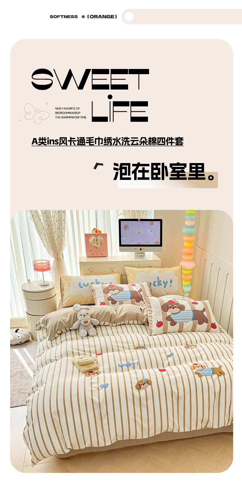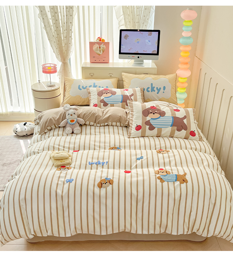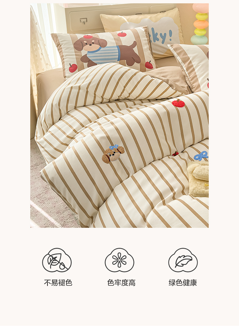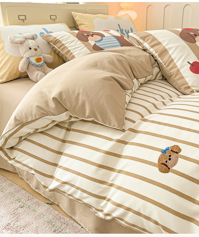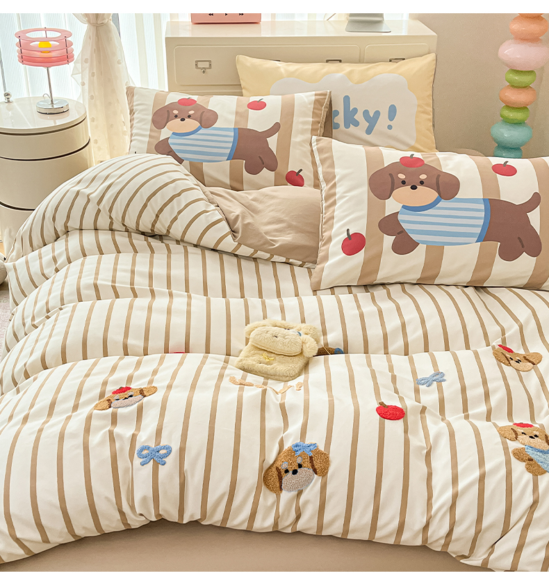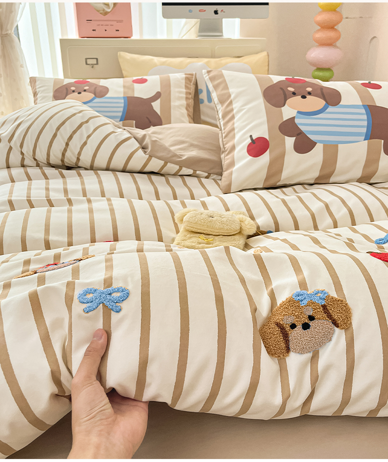 商品名称:如一 2025新款A类数码枕套卡通毛巾绣水洗棉四件套 条纹狗