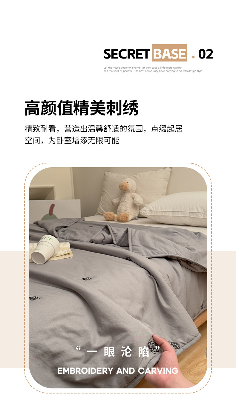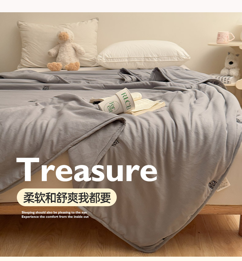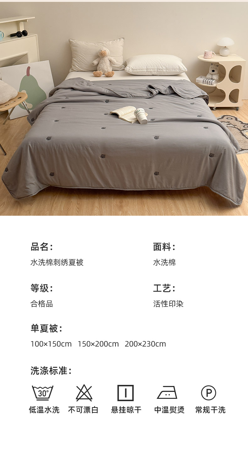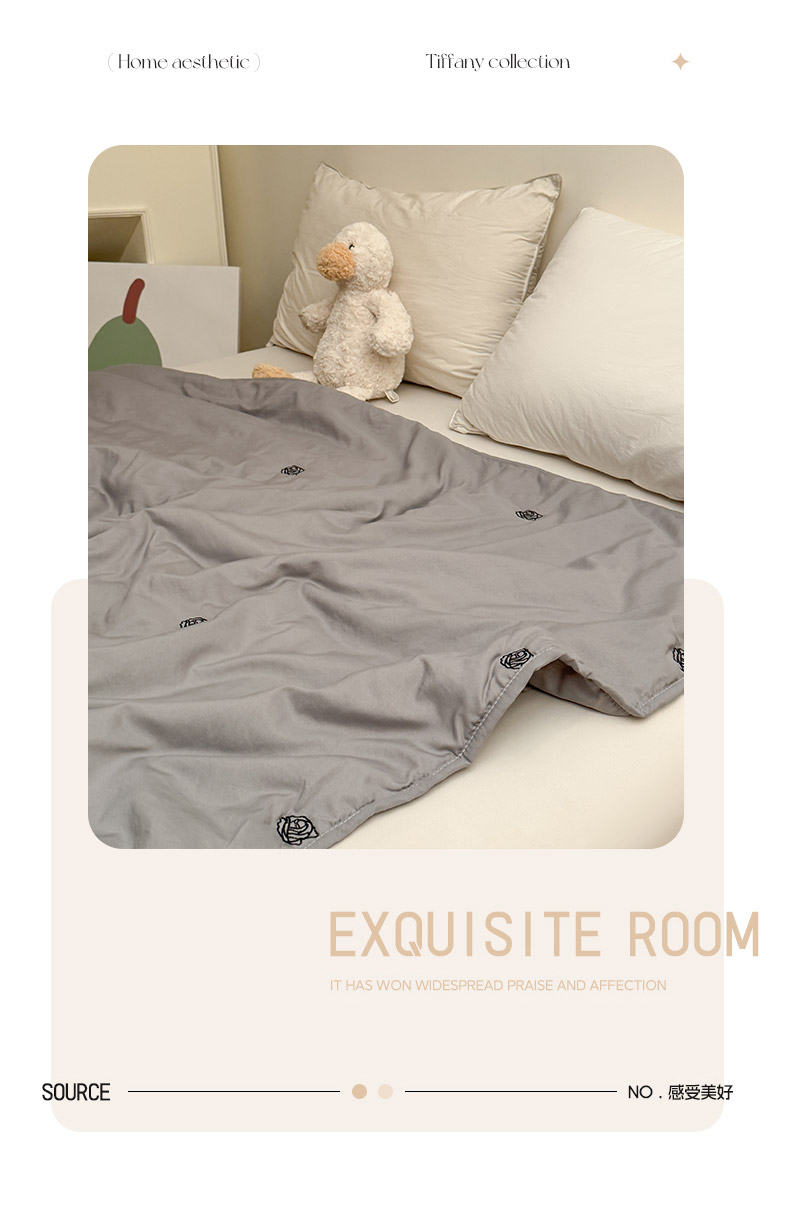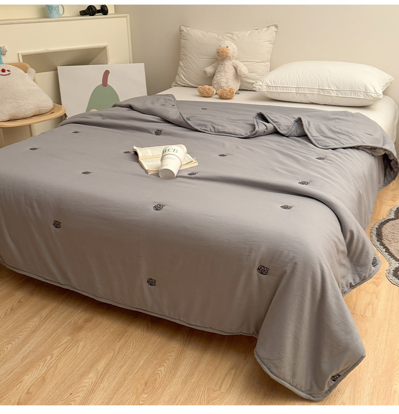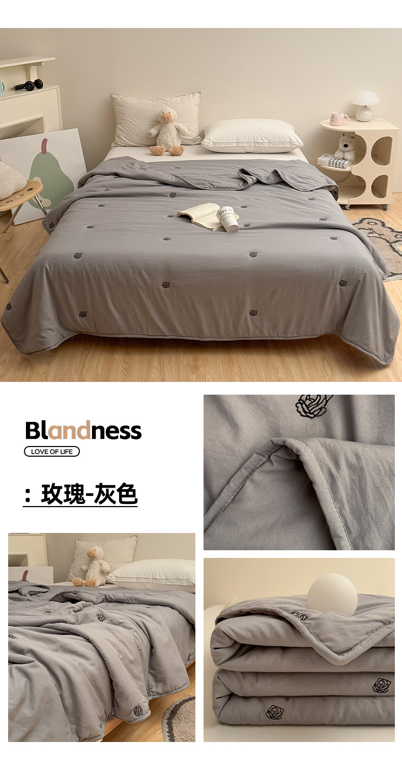 商品名称:推推家纺2025新款简约系列水洗棉刺绣夏被 玫瑰-灰色