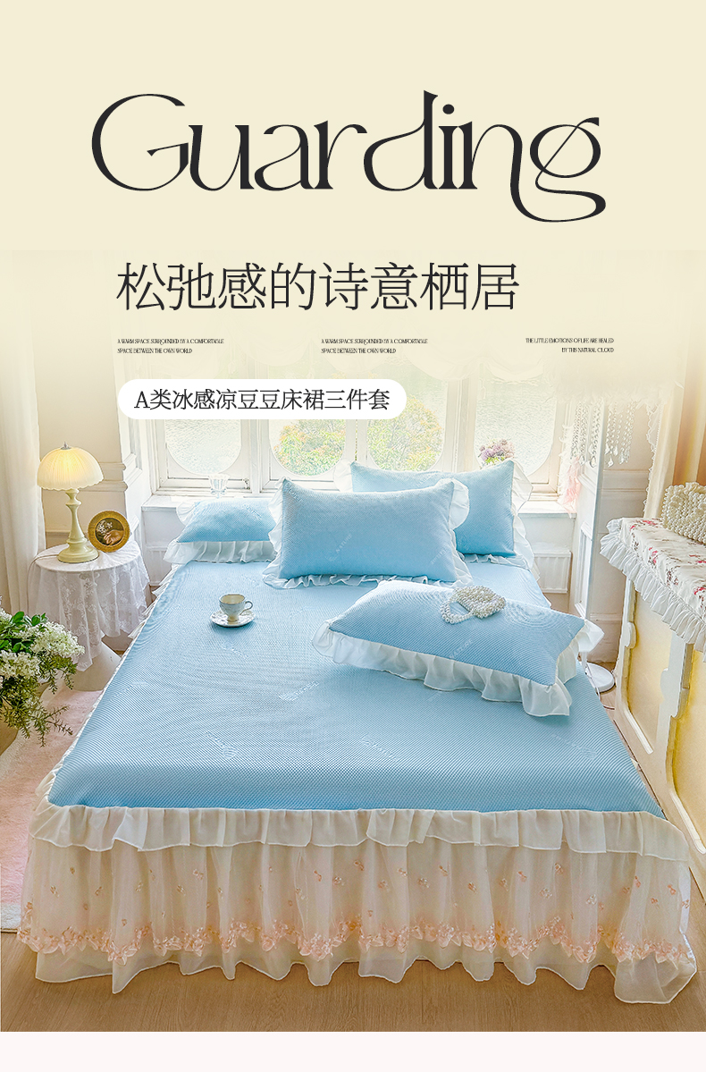 (总)虹星家纺 2024新款A类冰感凉豆豆可拆卸床裙席三件套,静谧灰,宝石蓝,冰川蓝,梦幻粉,青果绿,珍珠灰