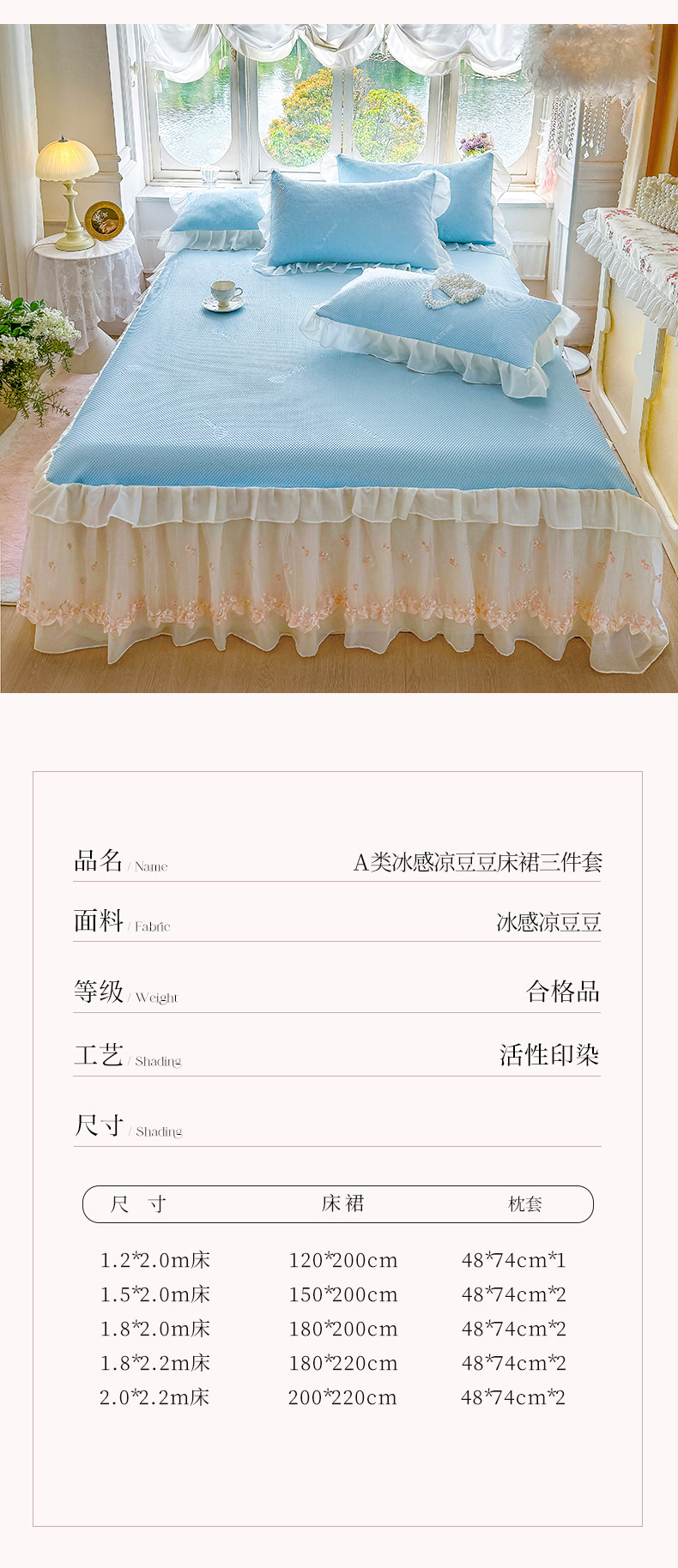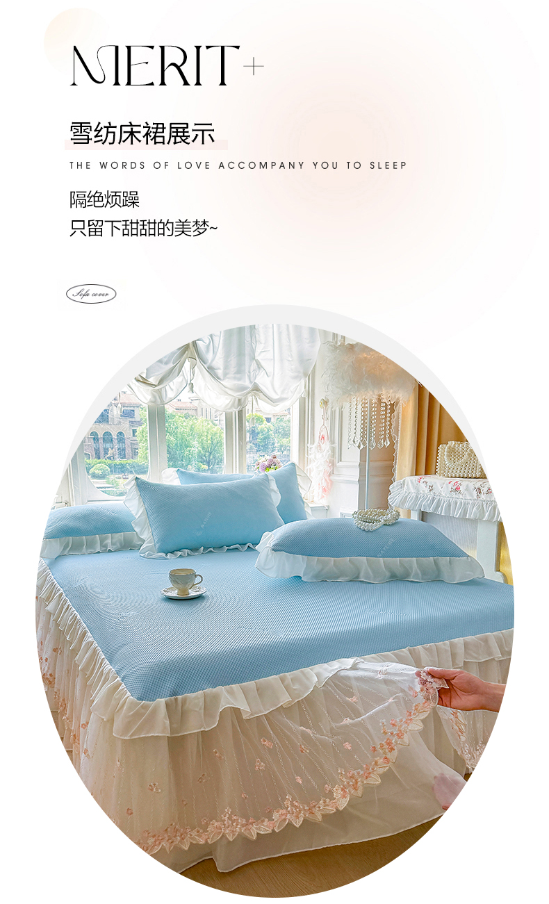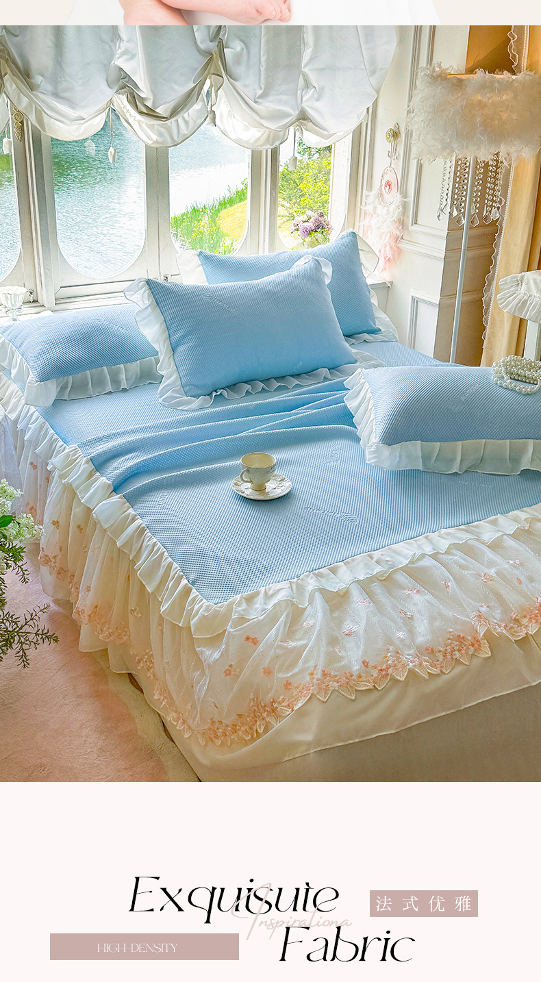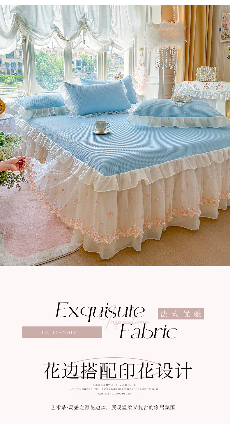 商品名称:虹星家纺 2025新款A类冰感凉豆豆床裙席三件套-素夏 素夏-天空蓝