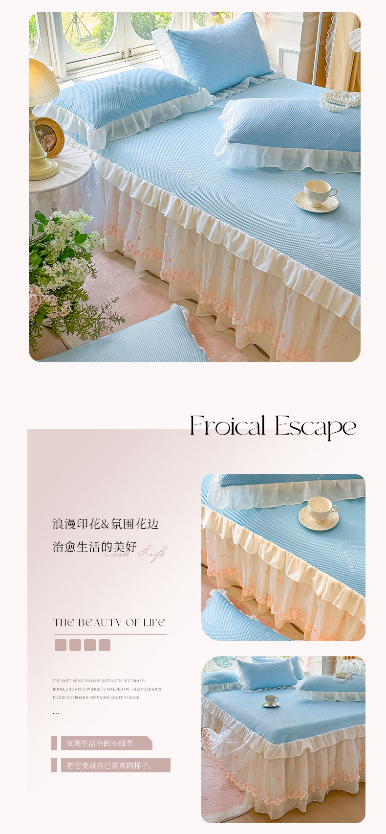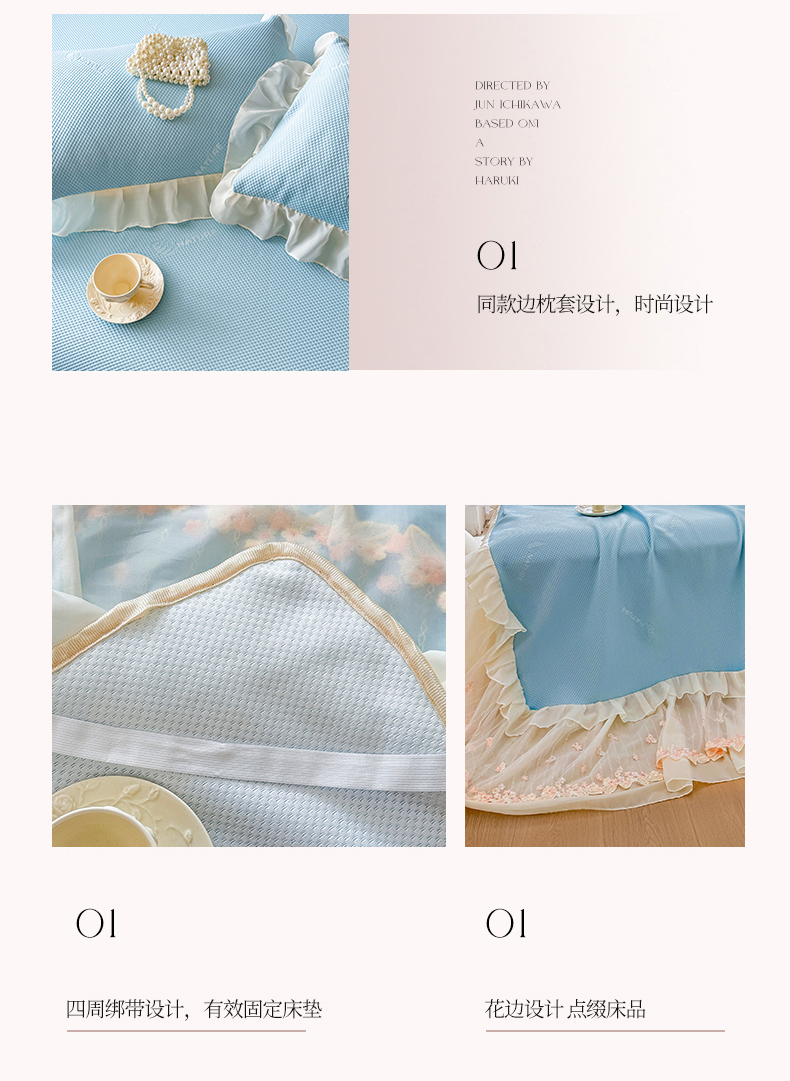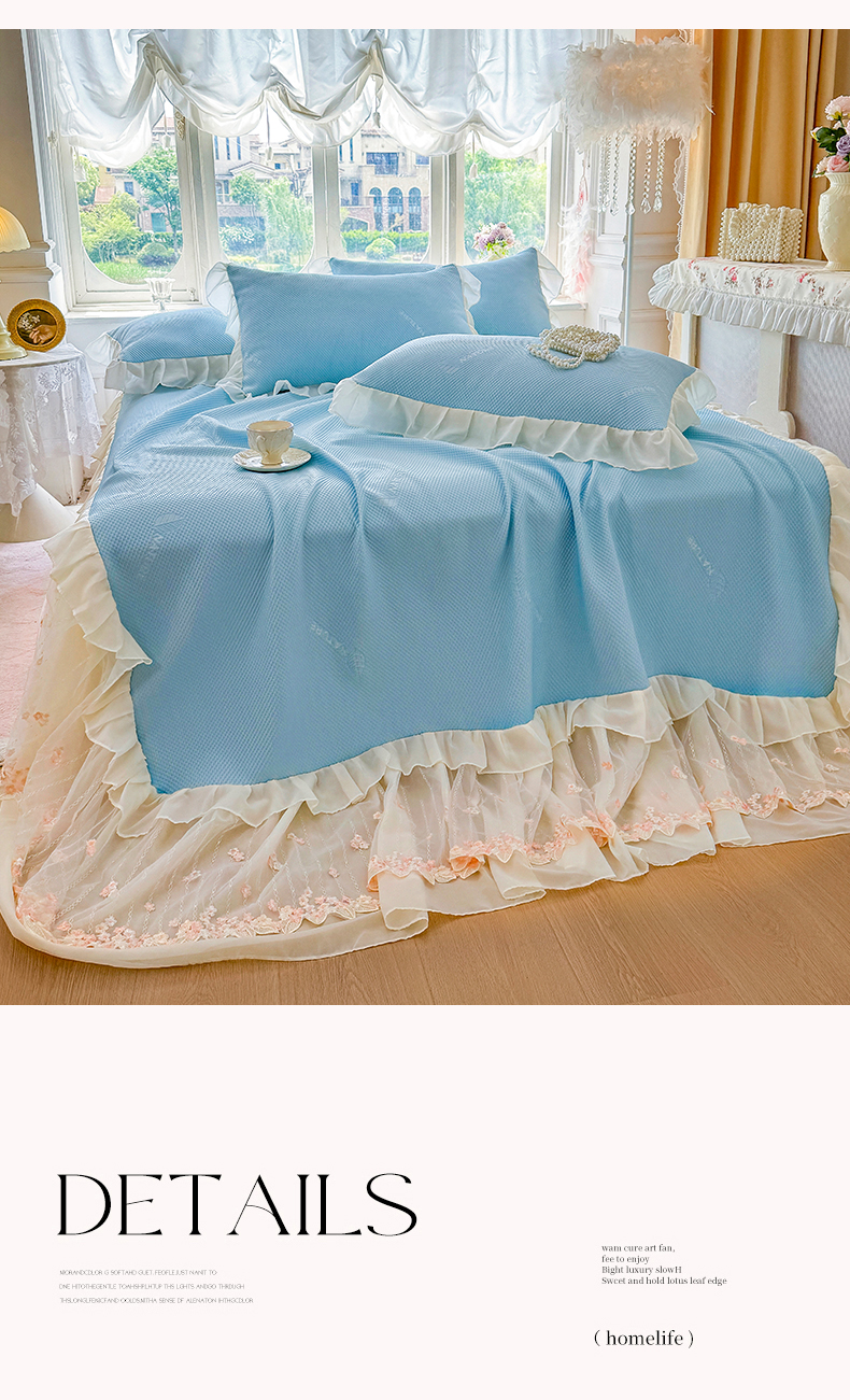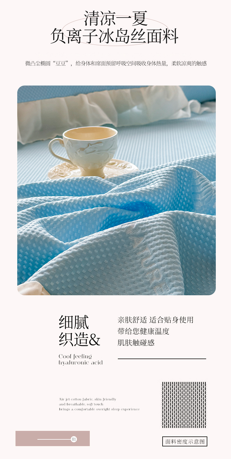 商品名称:虹星家纺 2025新款A类冰感凉豆豆床裙席三件套-素夏 素夏-天空蓝