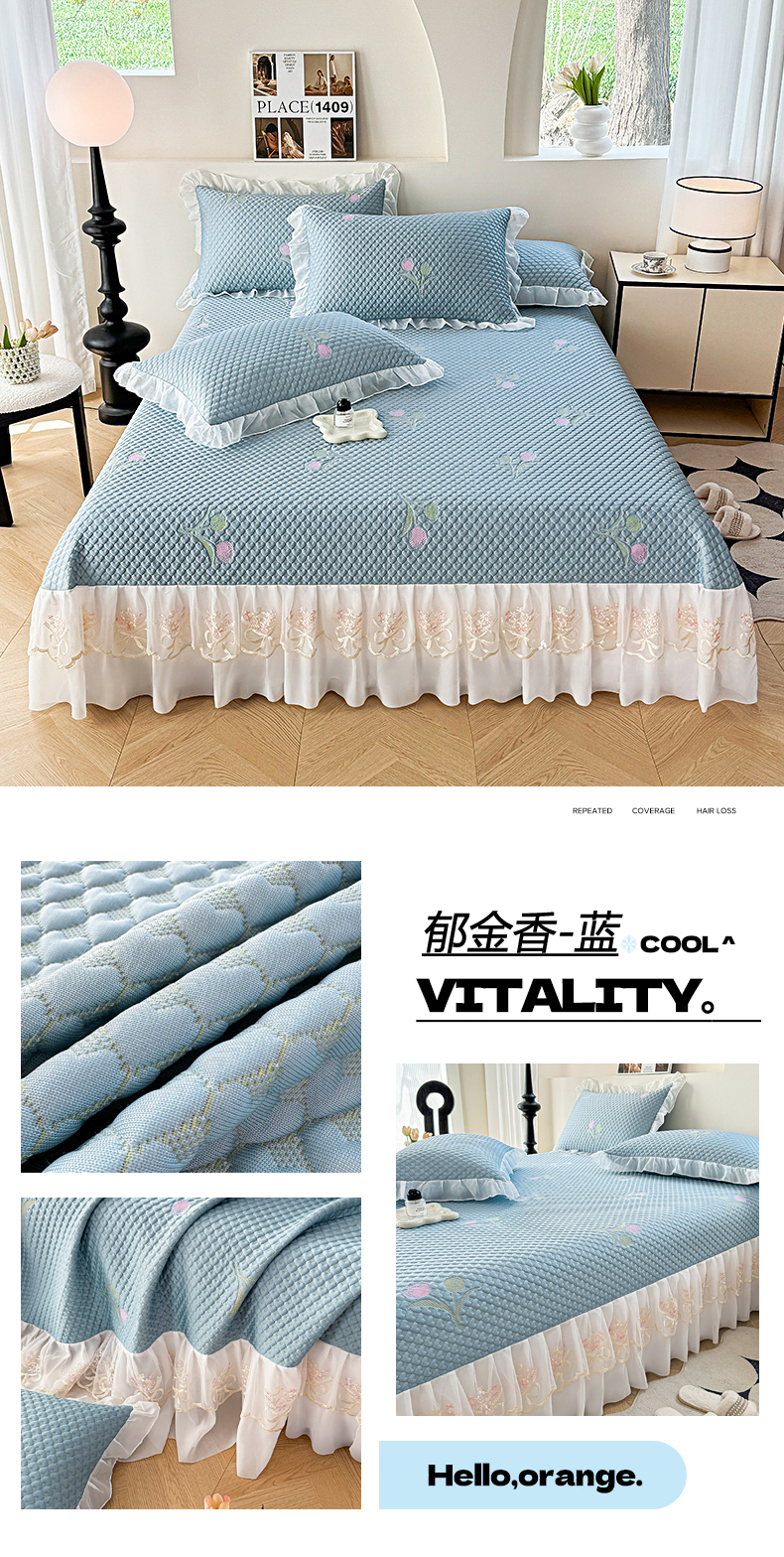 商品名称:提花大世界 2025新款A类PE乙纶冰丝凉感三色织550克冰豆豆凉席床裙软凉席 郁金香—PE蓝