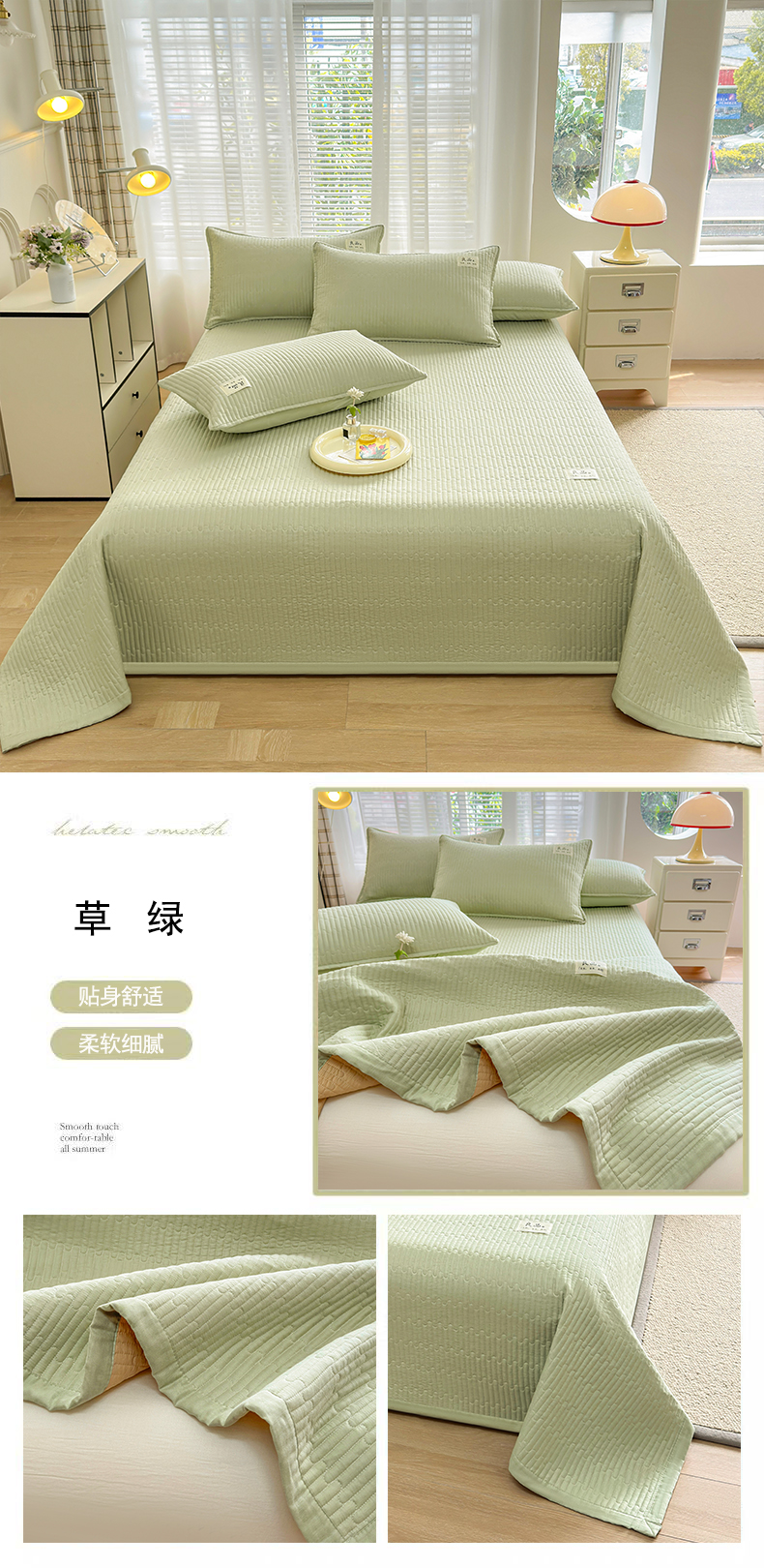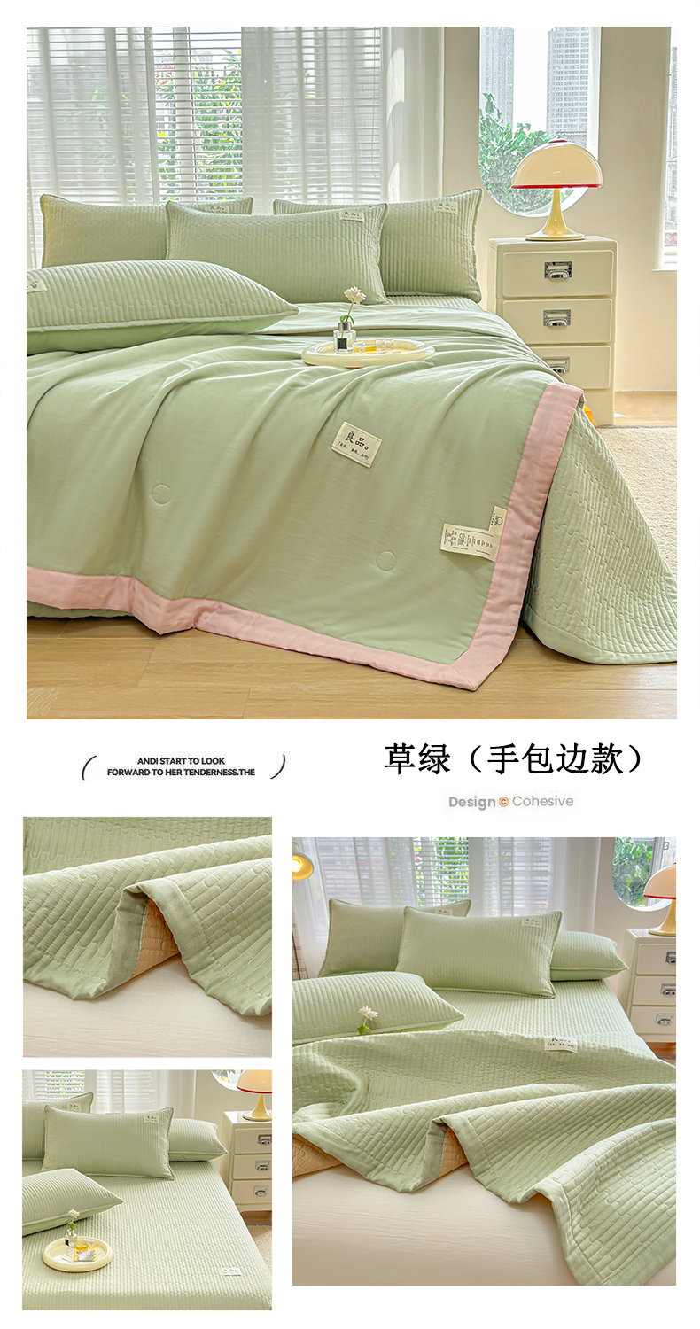 • 91家纺网 家纺一手货源 找家纺 金艾草2025款新款纯棉双层纱床盖三件套床盖夏被四件套 草绿(手包边款)