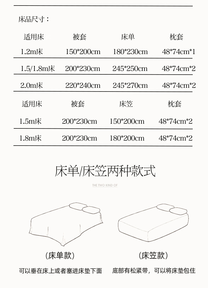 1.3床单款三件套小号:被套150*200,床单180*230,枕套48*74*1