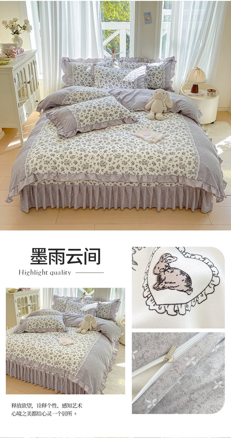 商品名称:皇谱家纺 2025新款A类有氧木棉床裙四件套 墨雨云间