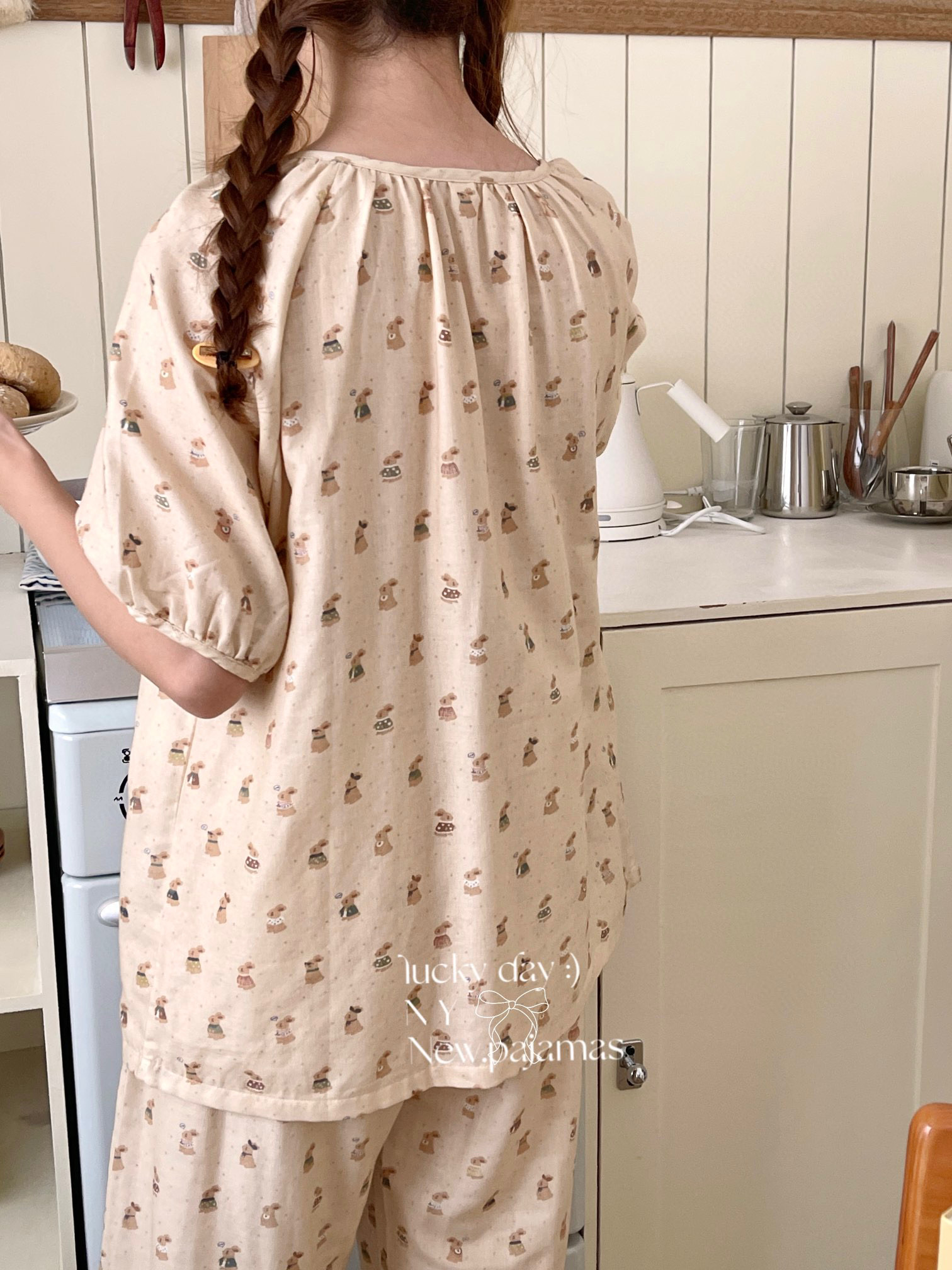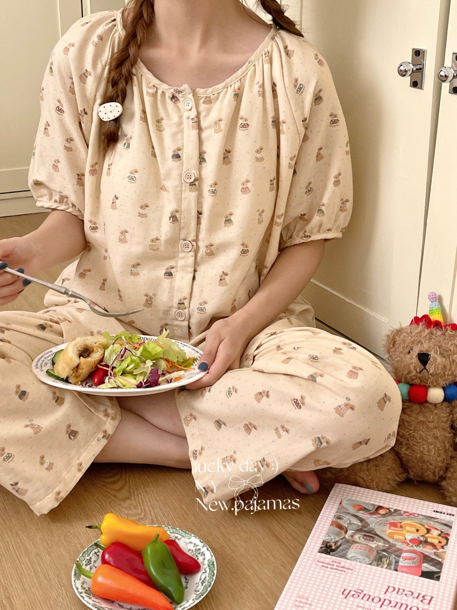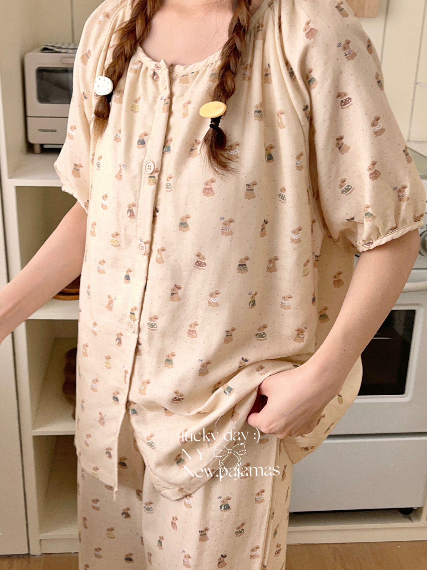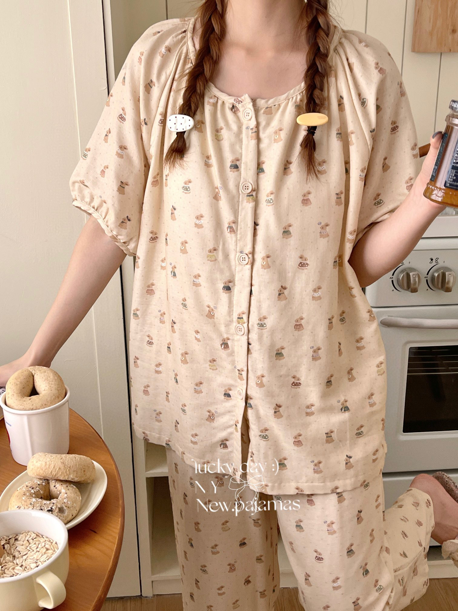 当前位置: 91家纺网 > 商品网购 > 居家日用 > 睡衣/家居服套装 > 纽约生活 有氧纱韩系家居服圆领短袖长裤自带胸垫套装 兔叽酱