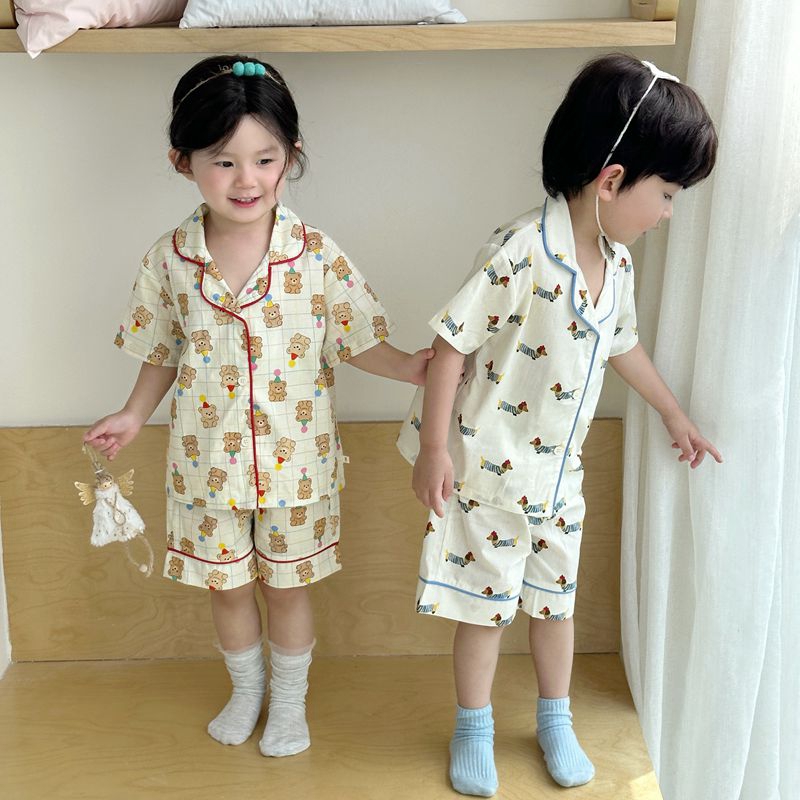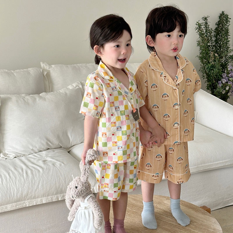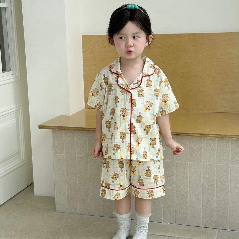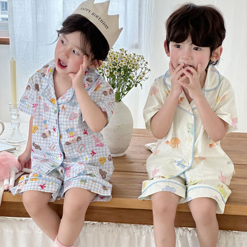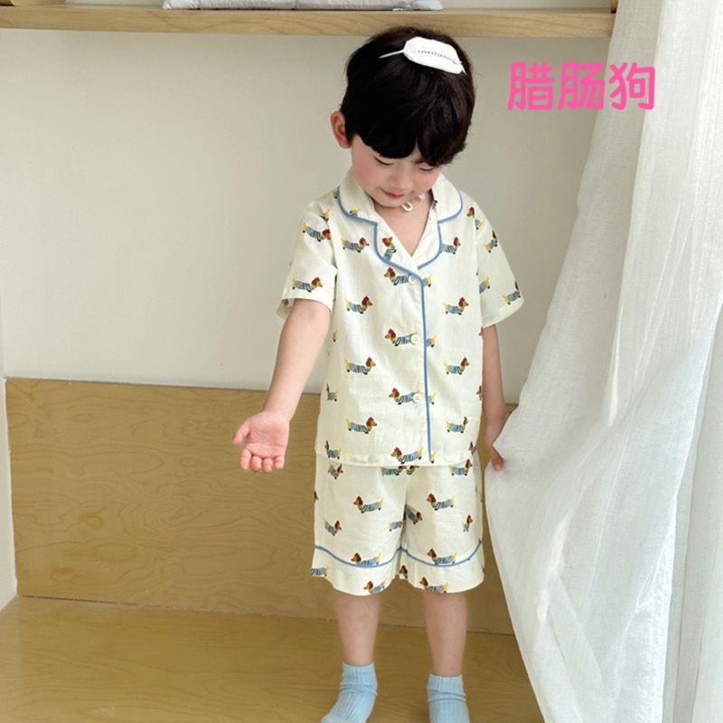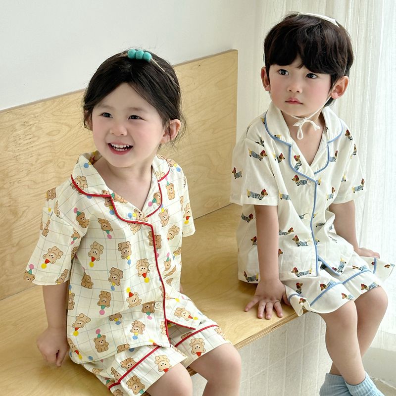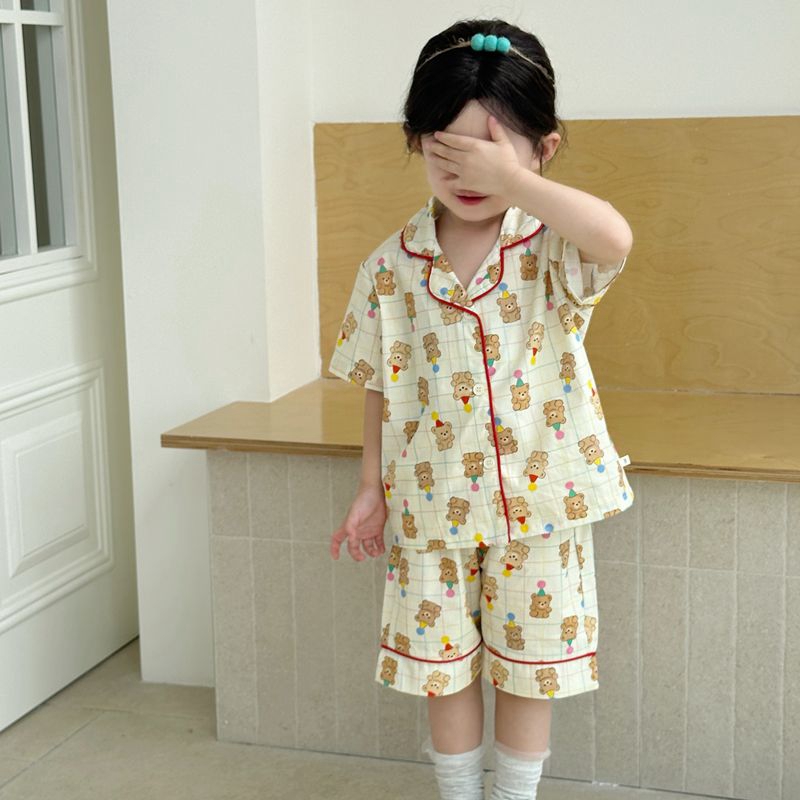 (总)妍景家居生活馆 2025新款儿童翻领斜纹棉夏季短袖套装