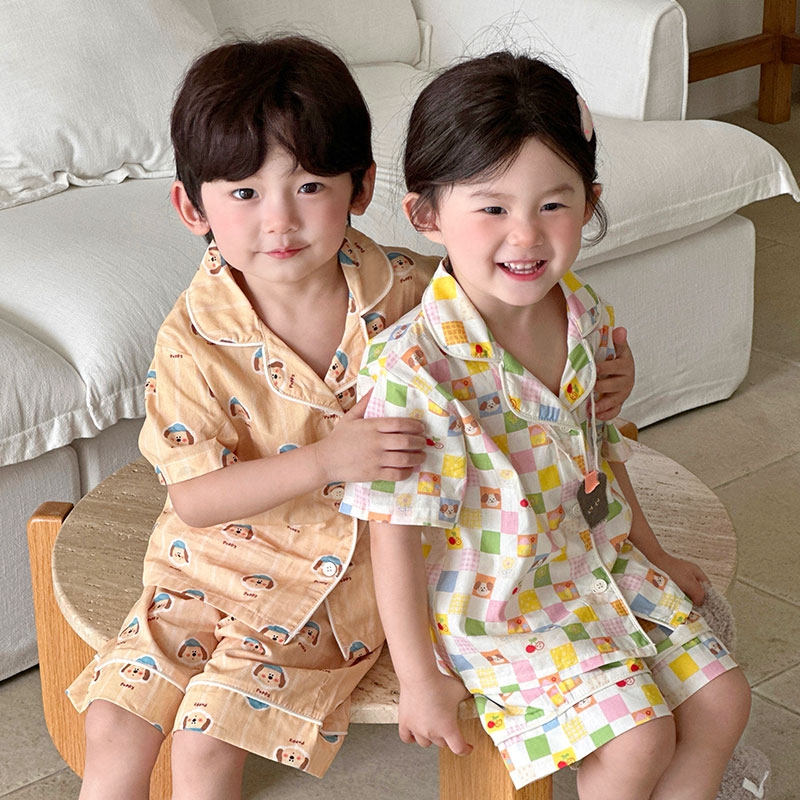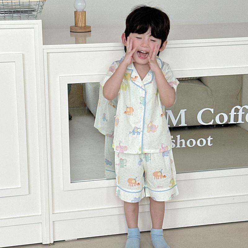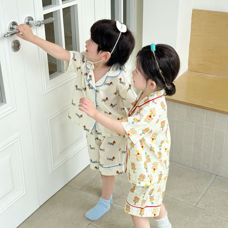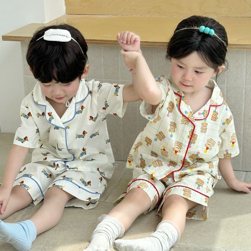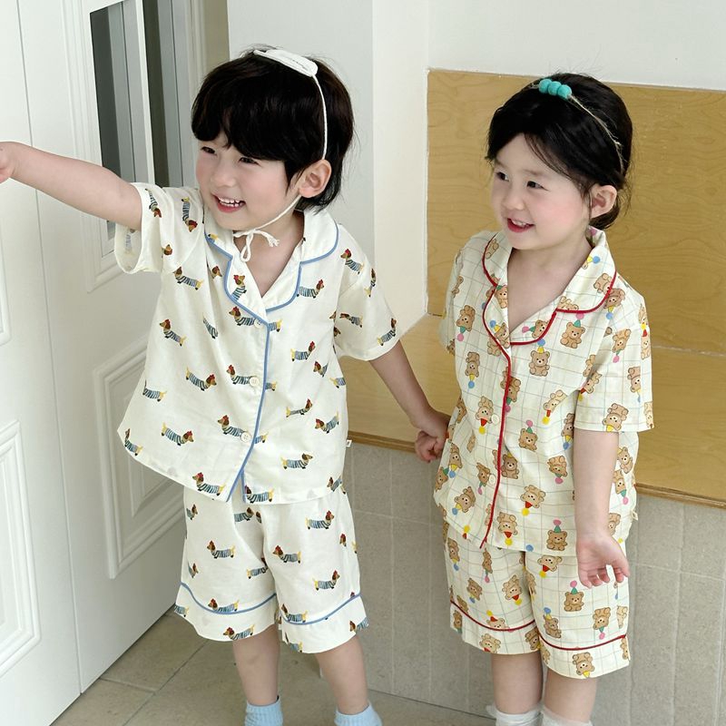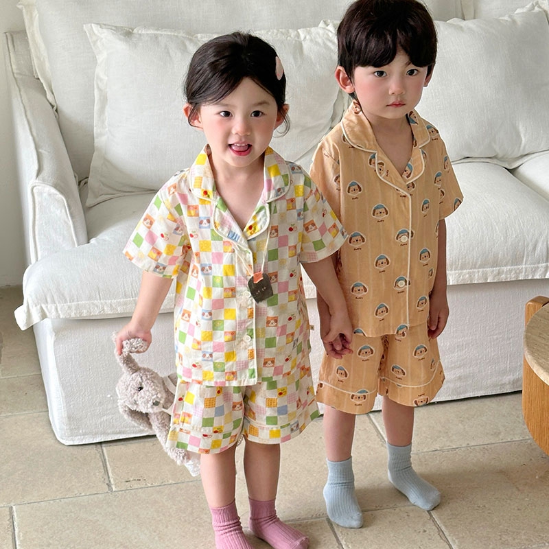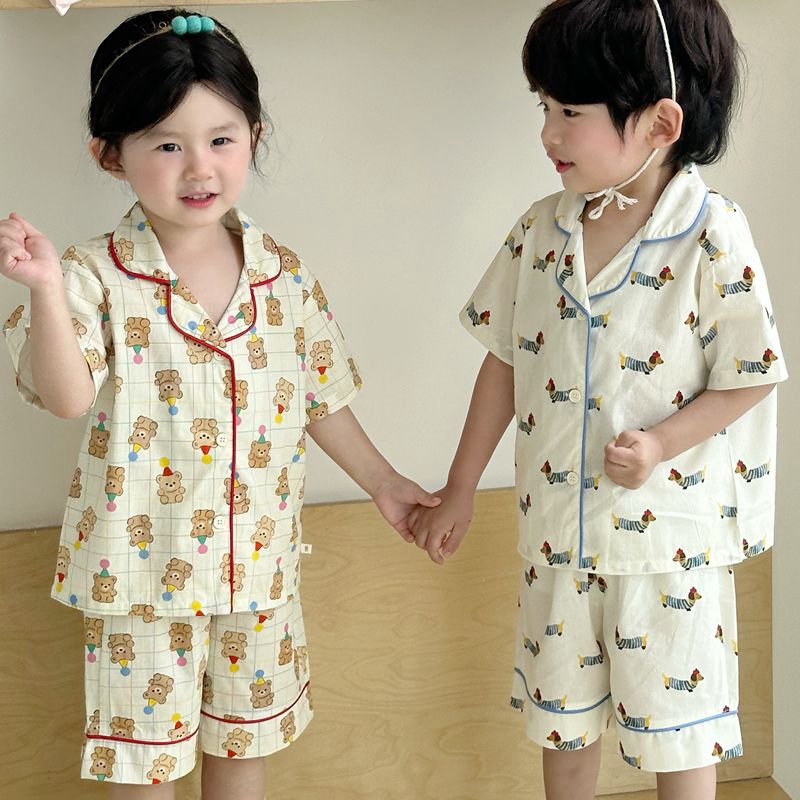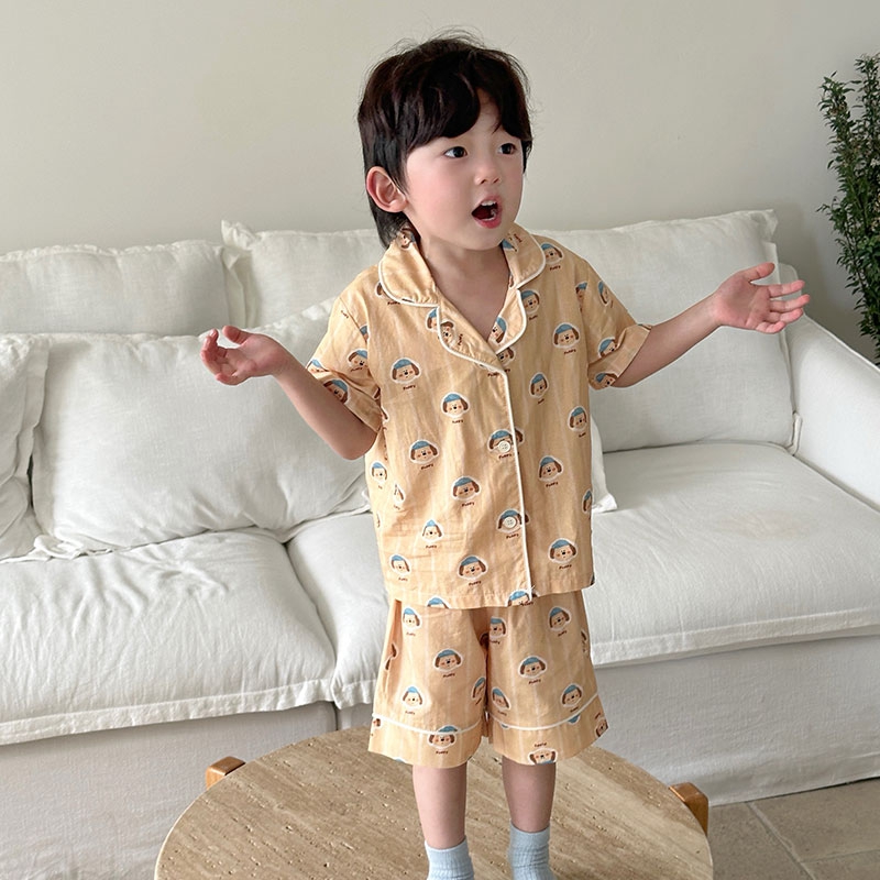 (总)妍景家居生活馆 2025新款儿童翻领斜纹棉夏季短袖套装