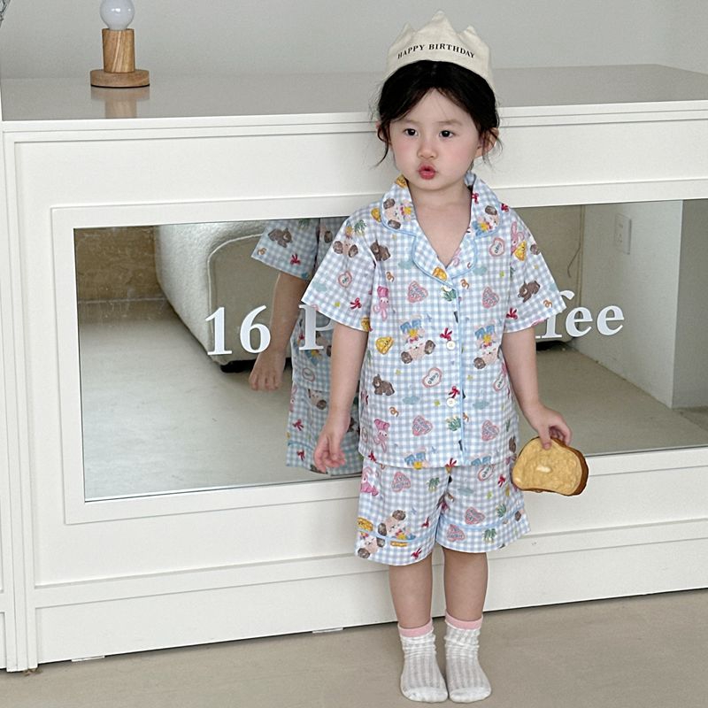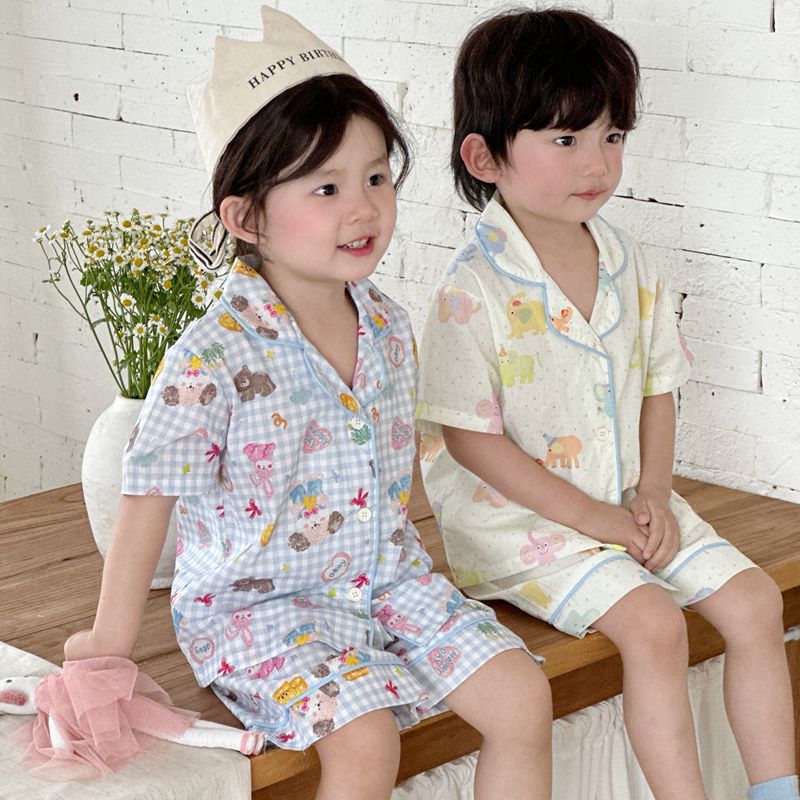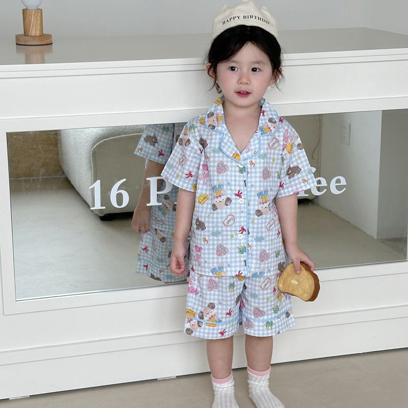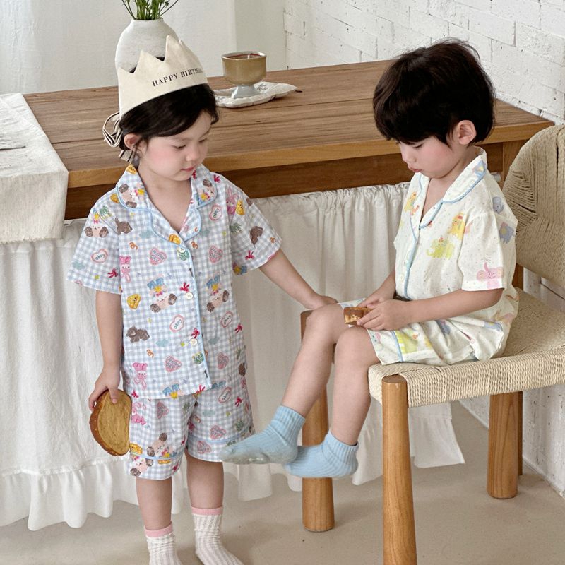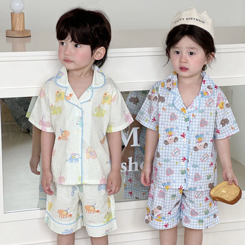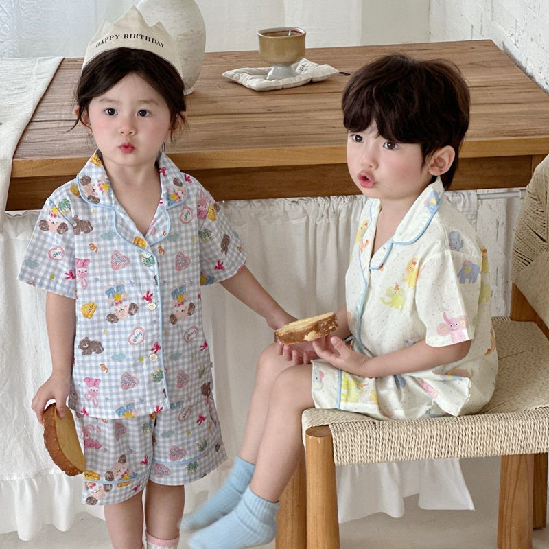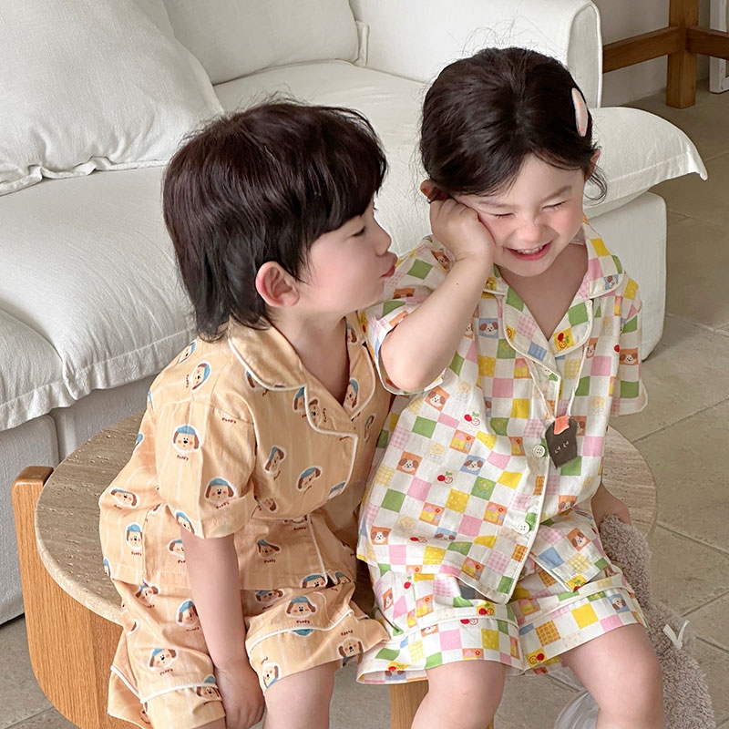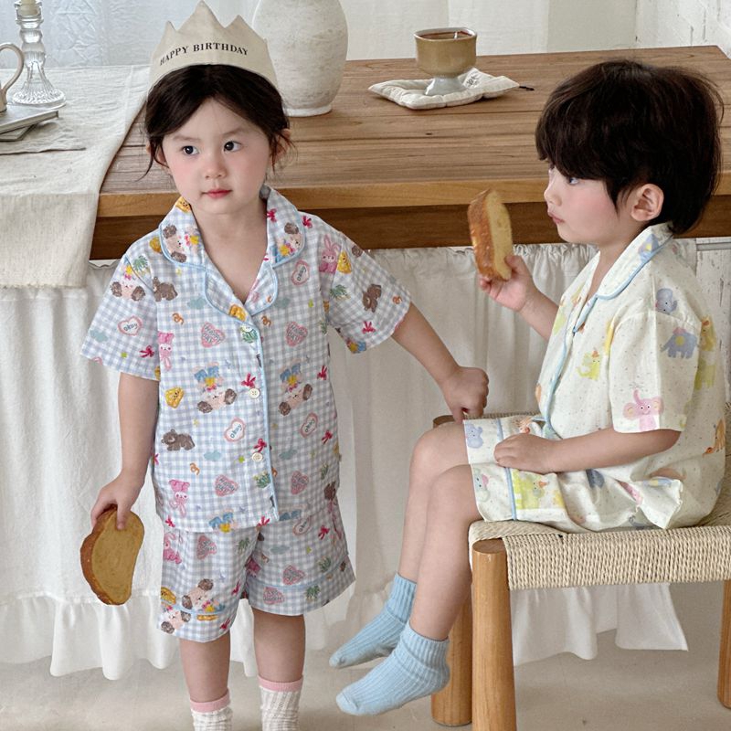 (总)妍景家居生活馆 2025新款儿童翻领斜纹棉夏季短袖套装