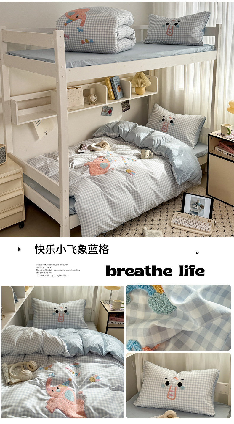 当前位置: 91家纺网 > 商品网购 > 床品套件 > 四件套 > 磨毛活性四件套 > 2025新款 985学姐推荐新款学生季宿舍可爱水洗棉毛巾绣四件套 快乐小飞象蓝格
