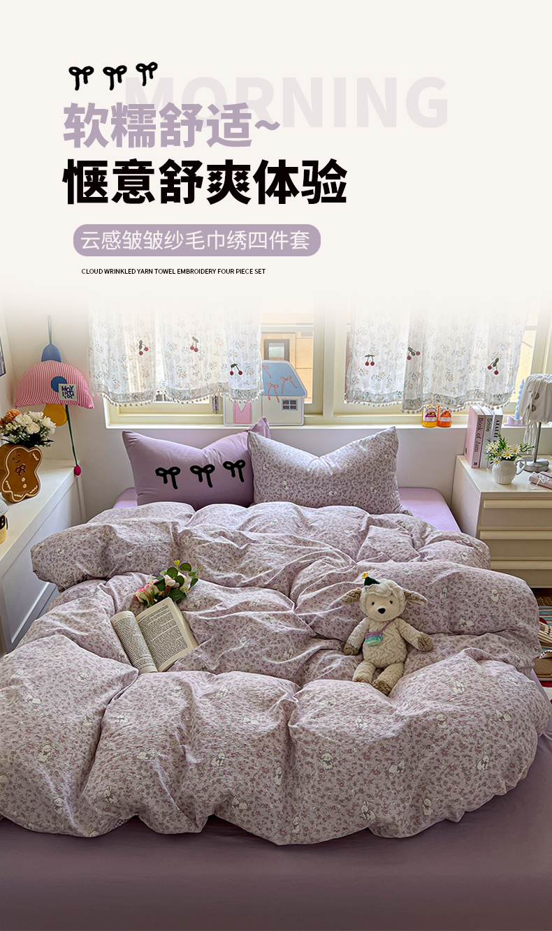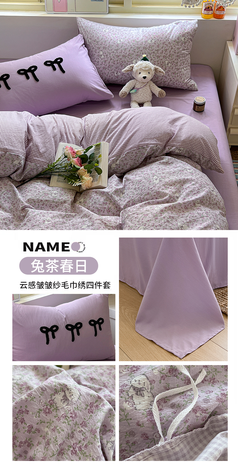 当前位置: 91家纺网 > 商品网购 > 床品套件 > 四件套 > 毛巾绣四件套 > 三元色 2025新款软糯云感毛巾绣四件套 兔茶春日