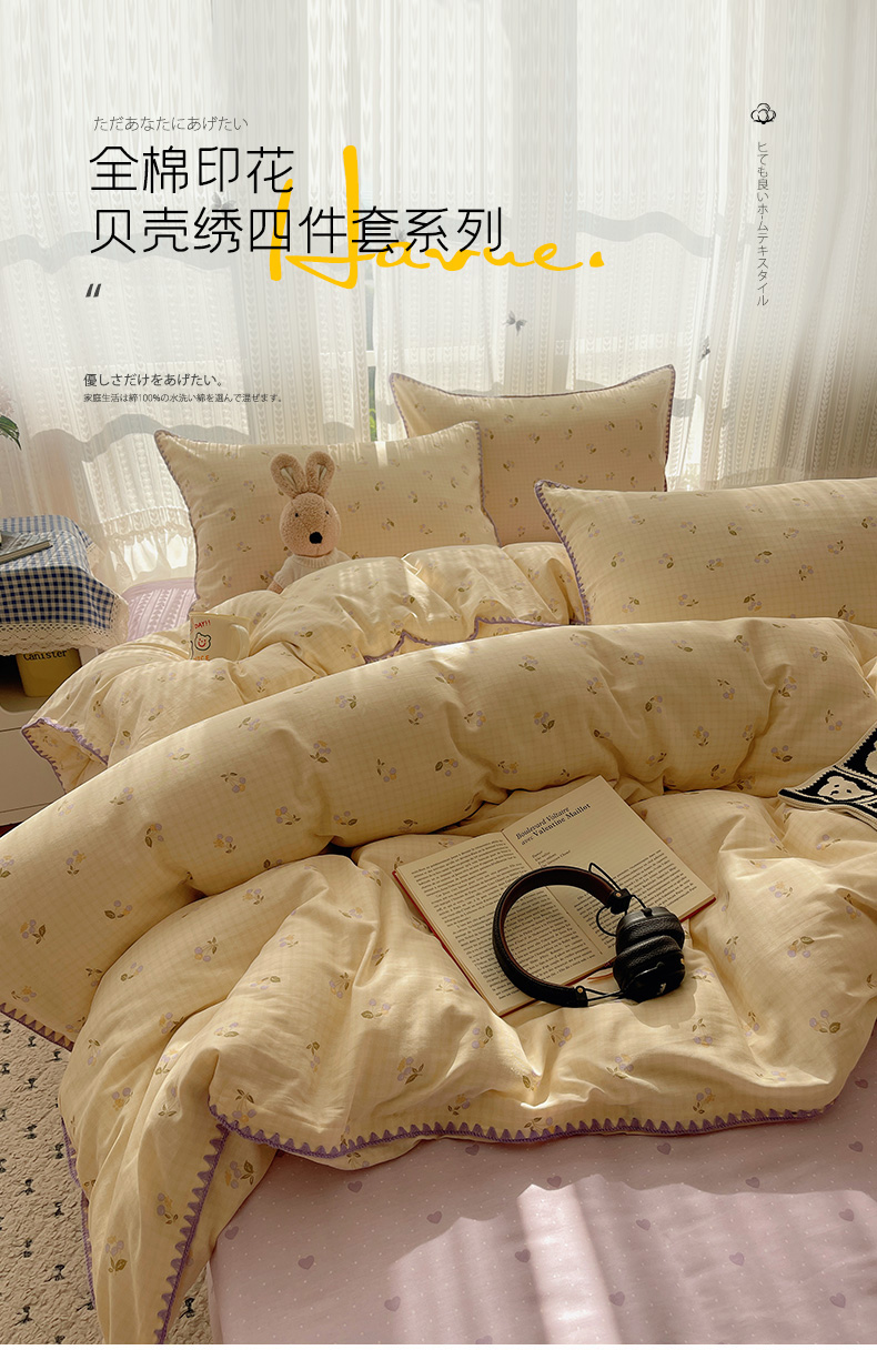 (总)瑞莱 2025新款全棉轻奢水洗棉贝壳绣四件套,豆沙,粉玉,米白,米黄,浅灰,浅蓝,深灰,深蓝,水绿,星蓝
