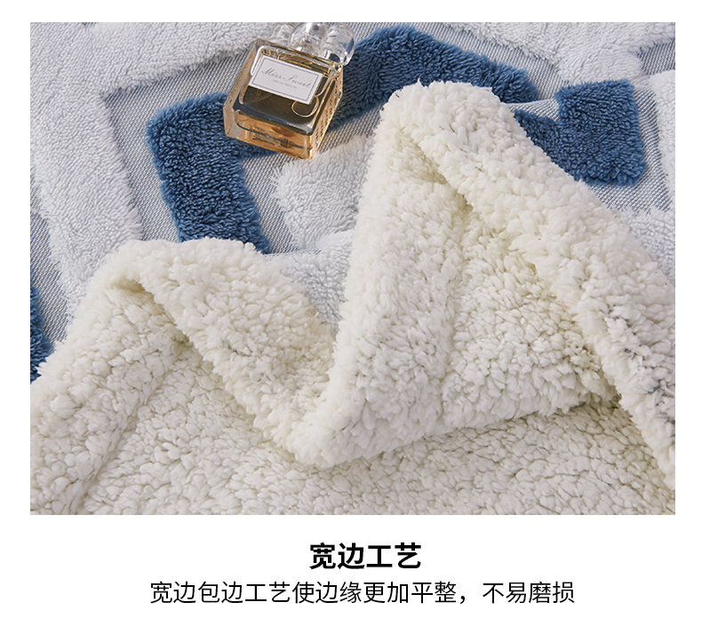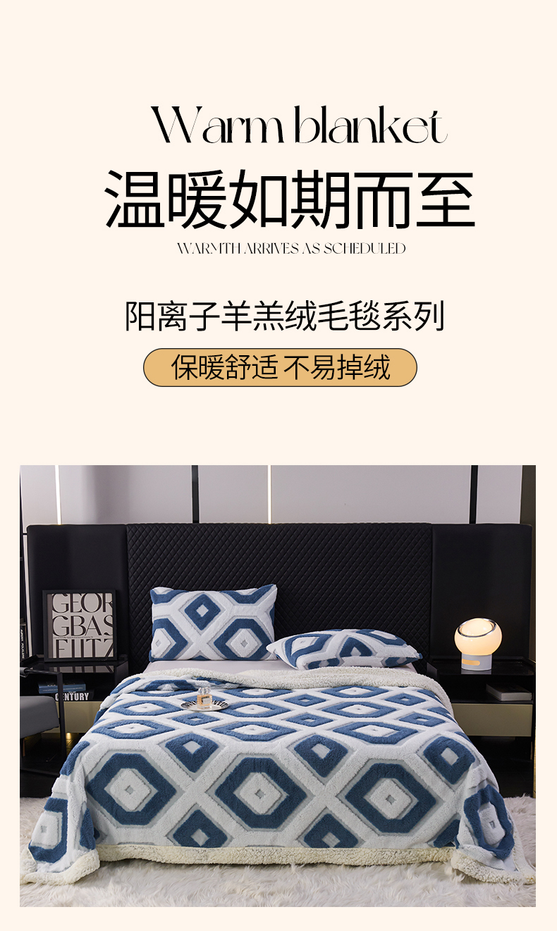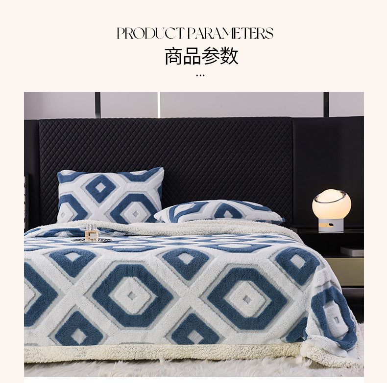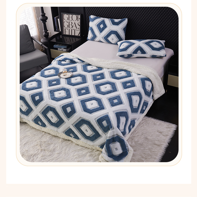 商品名称:枋梢家纺 2025新款几何空间阳离子提花镂空塔芙绒羊羔绒保暖午睡双层毛毯办公室盖毯 几何-海蓝