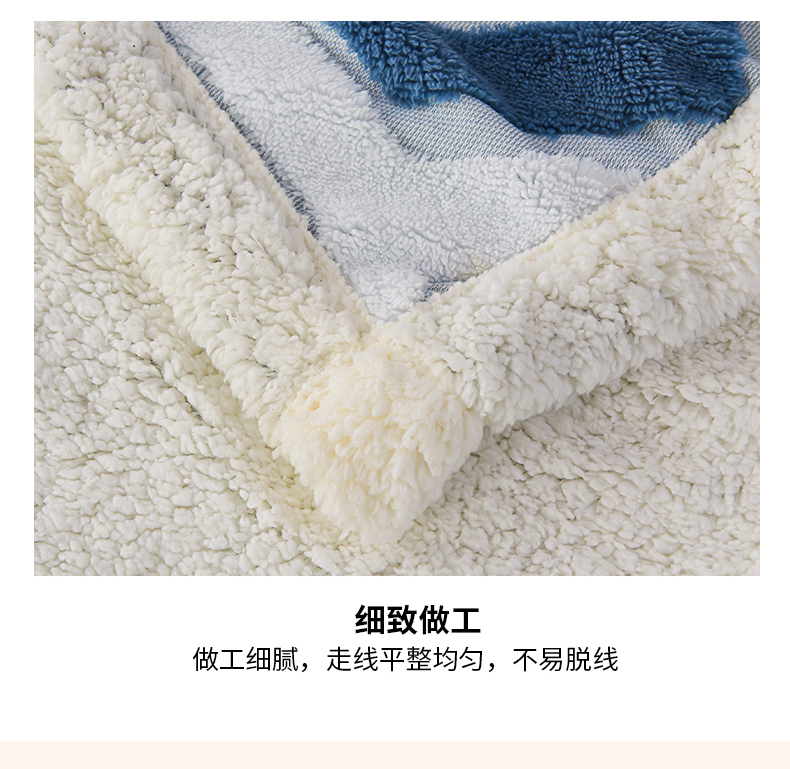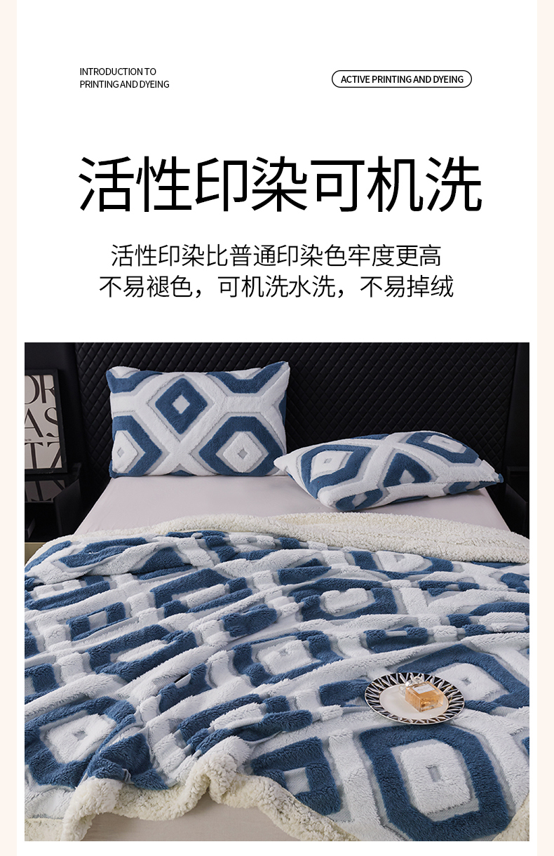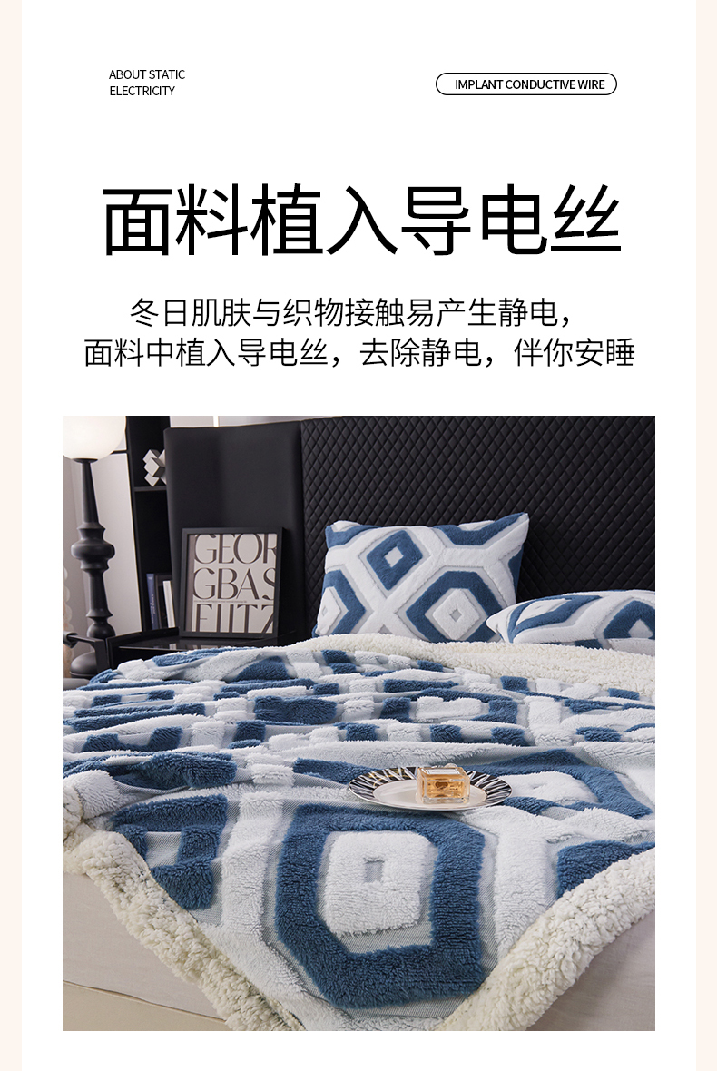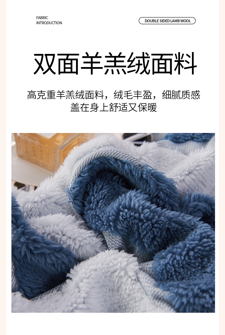 商品名称:枋梢家纺 2025新款几何空间阳离子提花镂空塔芙绒羊羔绒保暖午睡双层毛毯办公室盖毯 几何-海蓝