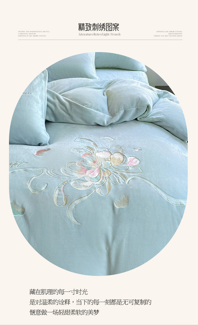 商品名称:莱凯家纺 2025新款牛奶绒刺绣四件套 花间醉(浅蓝)