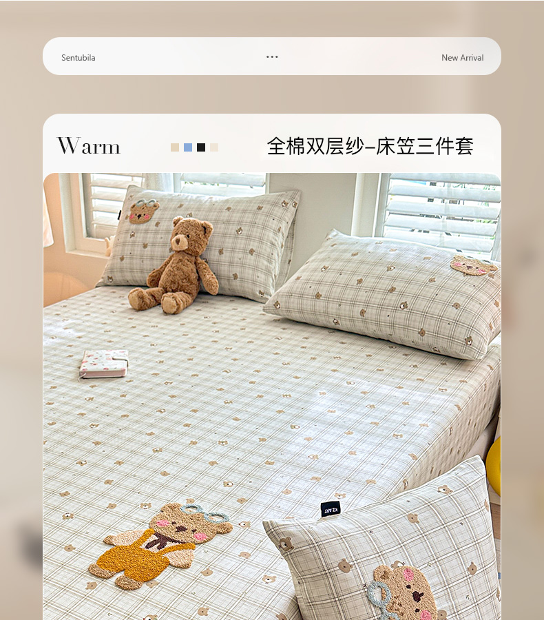• 91家纺网 家纺一手货源 找家纺 卡姿家纺 2025秋冬全棉双层纱-床笠三件套 床笠-熊仔宝贝