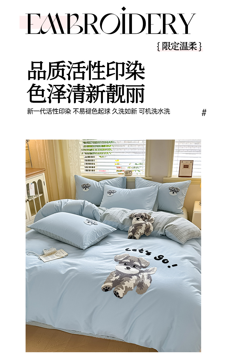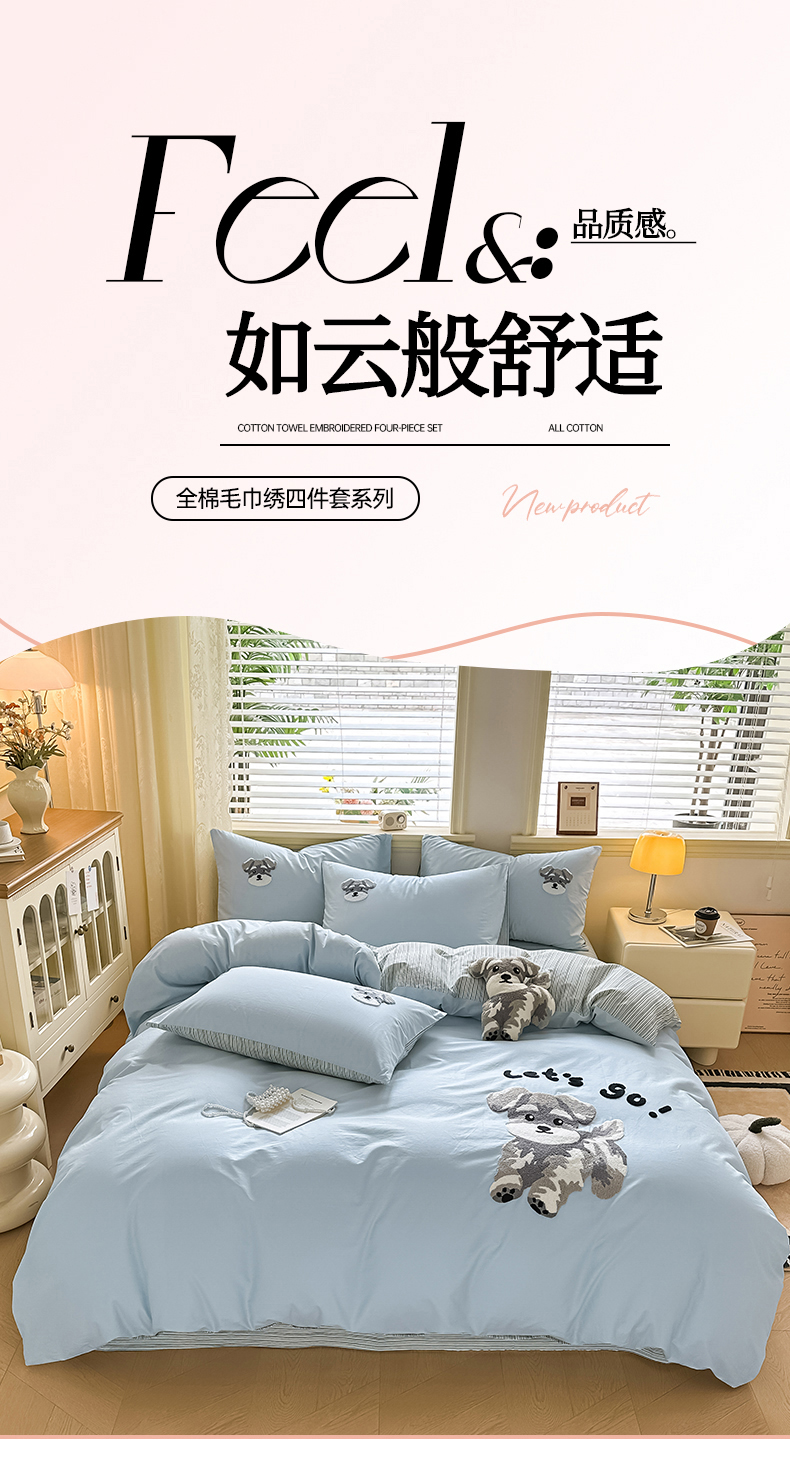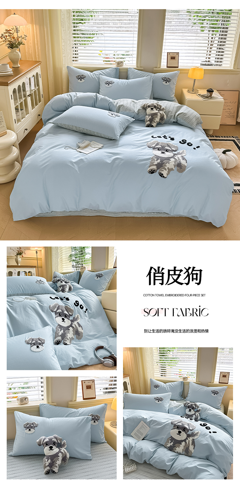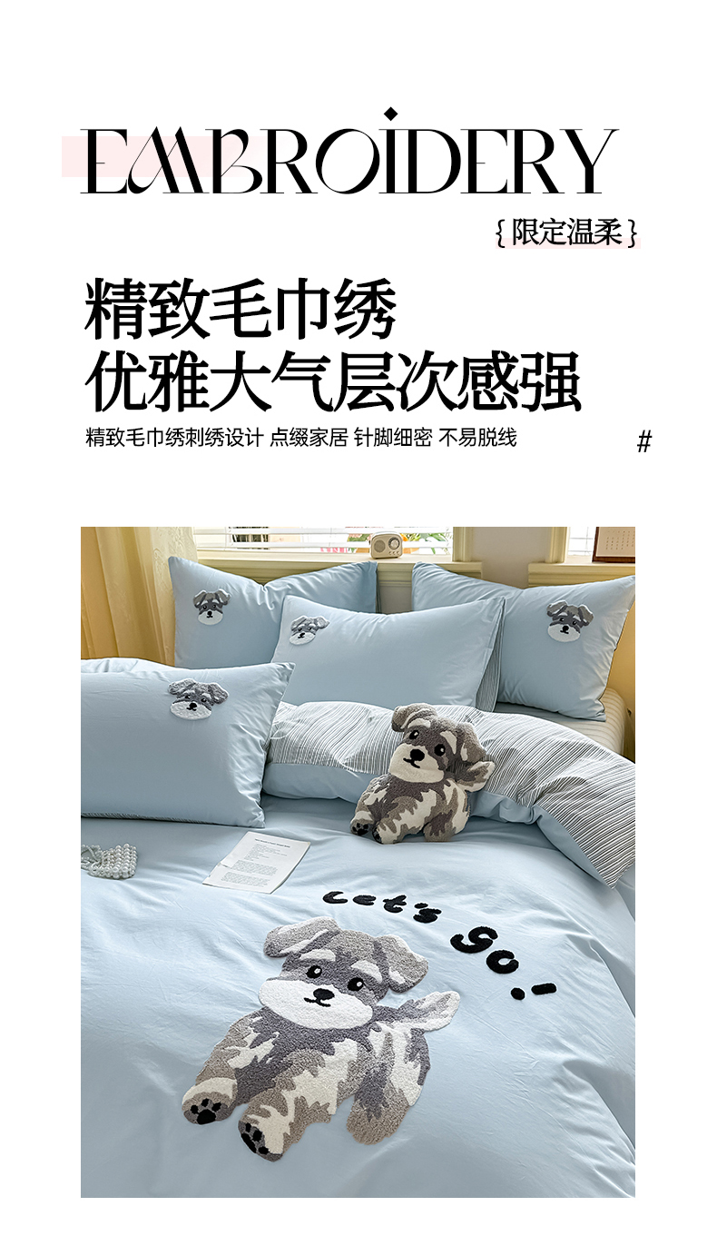 当前位置: 91家纺网 > 商品网购 > 床品套件 > 四件套 > 全棉普通四件套 > 寐居家纺 2025新款全棉纯棉13372毛巾绣四件套 俏皮狗