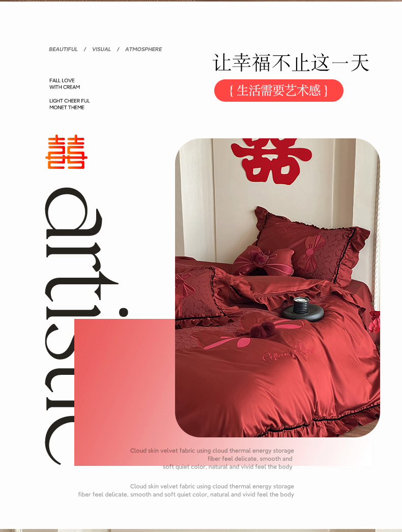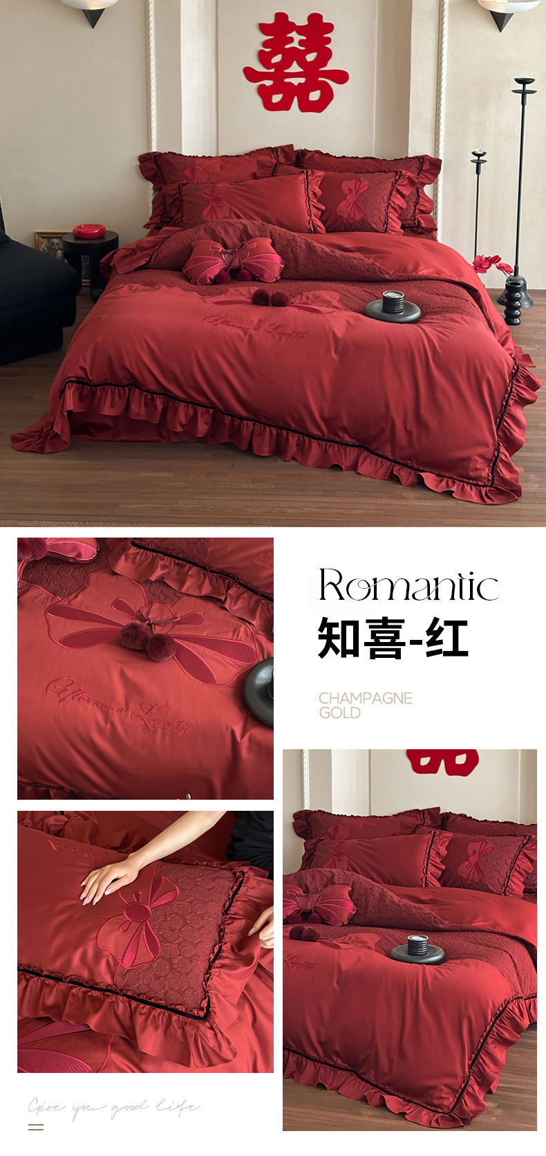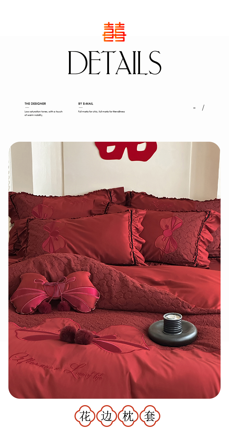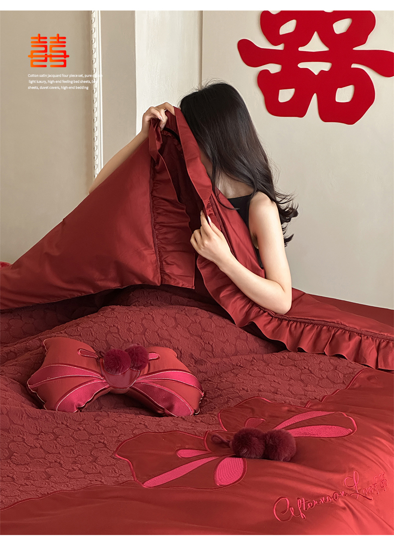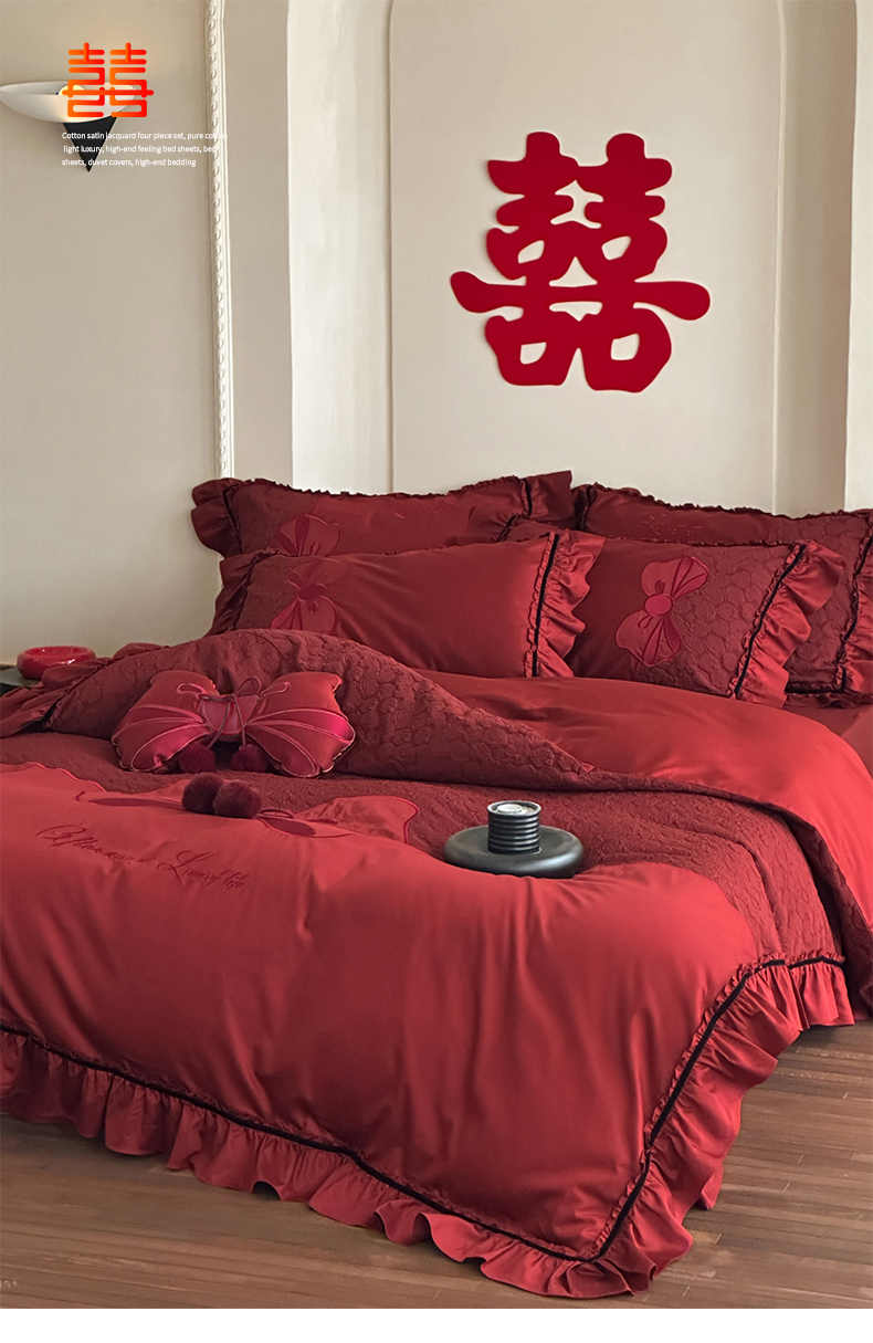 当前位置: 91家纺网 > 商品网购 > 床品套件 > 四件套 > 全棉普通四件套 > 宏羽纺家纺 2025新款100s全棉纯棉贡缎法式刺绣花边四件套 纯棉时尚-知喜-红