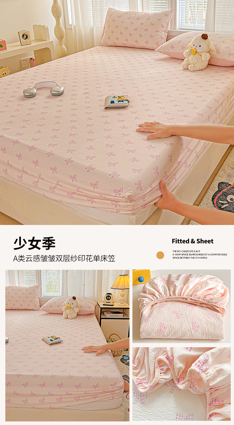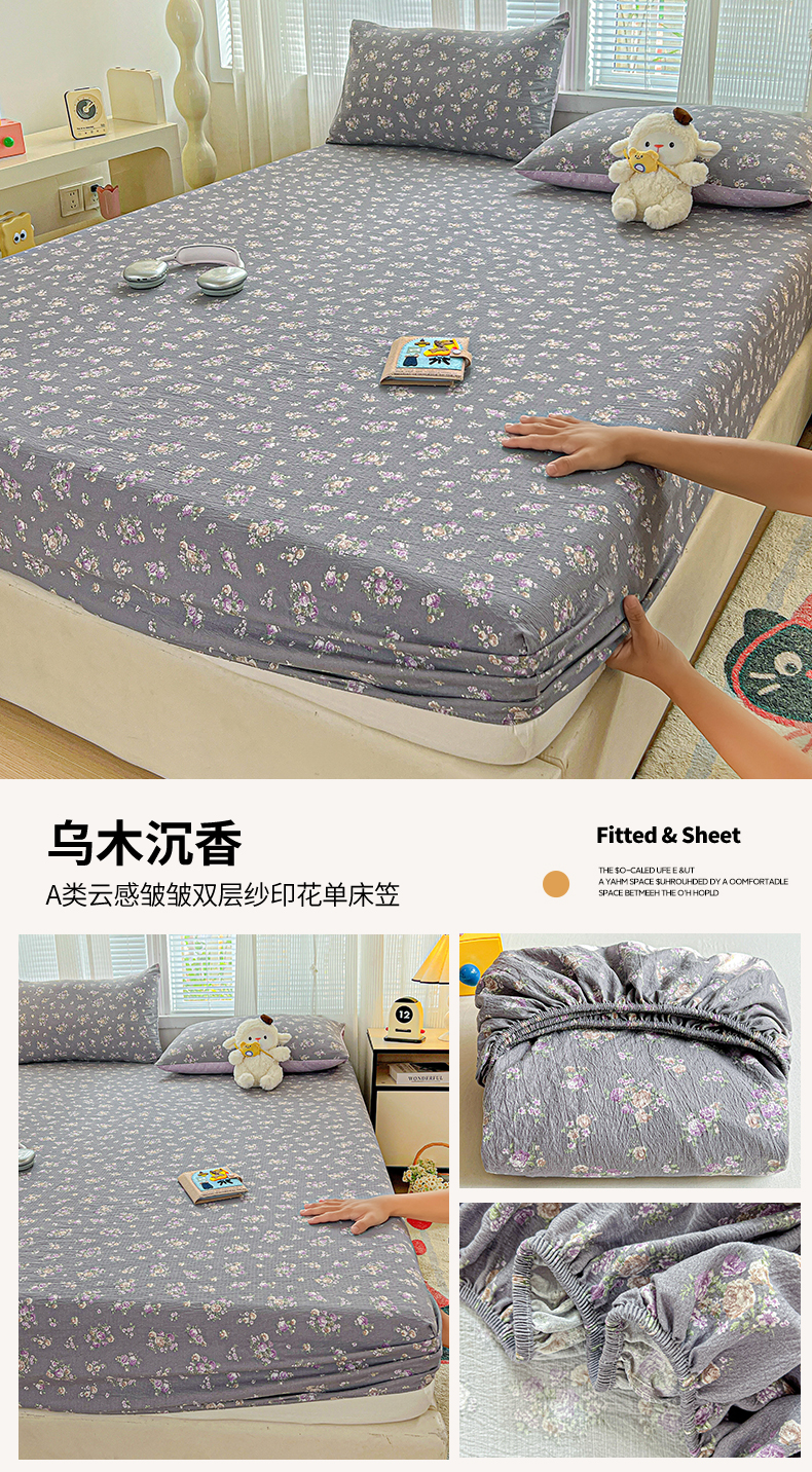 格真 2025秋冬新款110克高克重提花加厚皱皱纱双层纱印花单床笠 波点-丁香紫