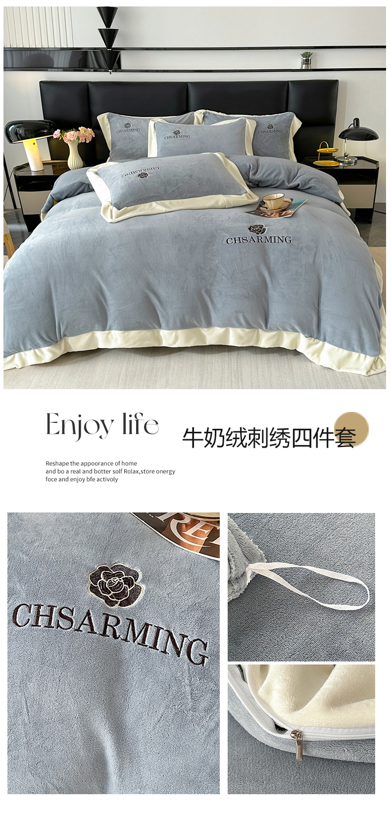 商品名称:爱洛 2025新款牛奶绒四件套牛奶绒刺绣四件套纯色牛奶绒四件套 山茶花-灰色
