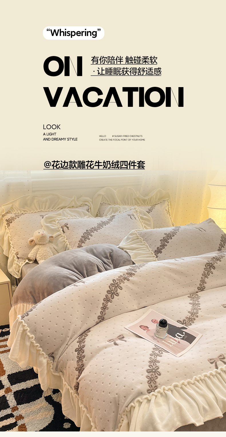 商品名称:利欧 2025新款褶皱边雕花牛奶绒四件套 少女结-灰