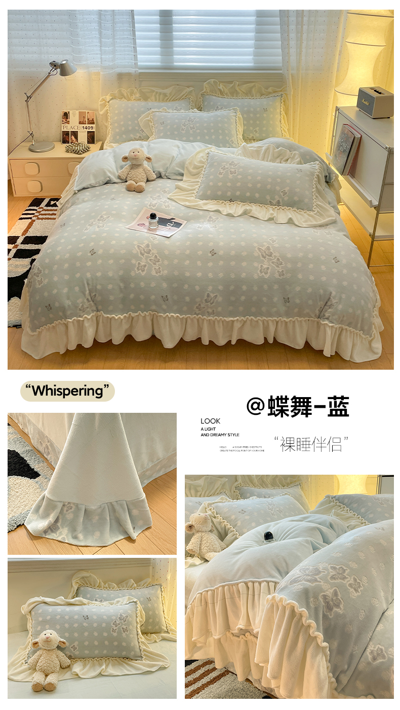 (总)利欧 2025新款褶皱边雕花牛奶绒四件套,玫影-紫,蝶舞-蓝,蝶舞-绿,玫影-橙,少女结-粉,少女结-灰,少女结-蓝,舞蝶-粉