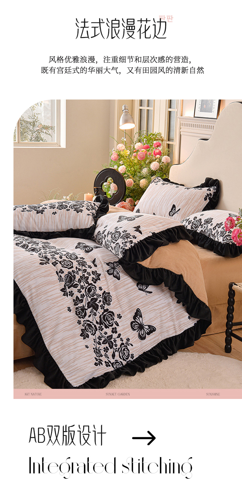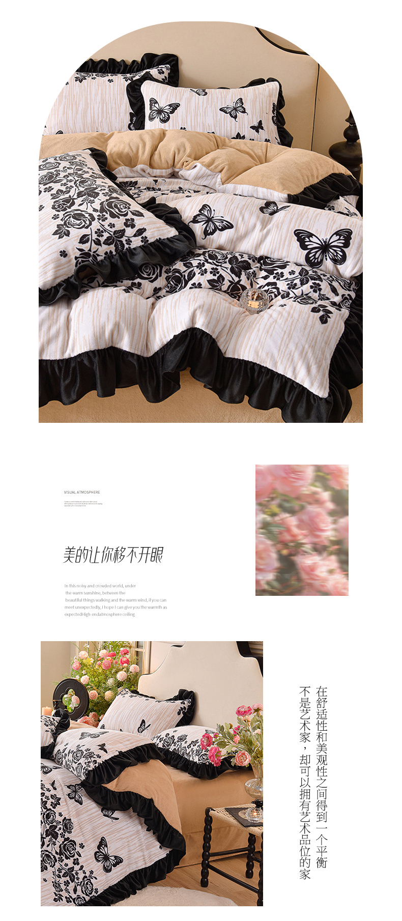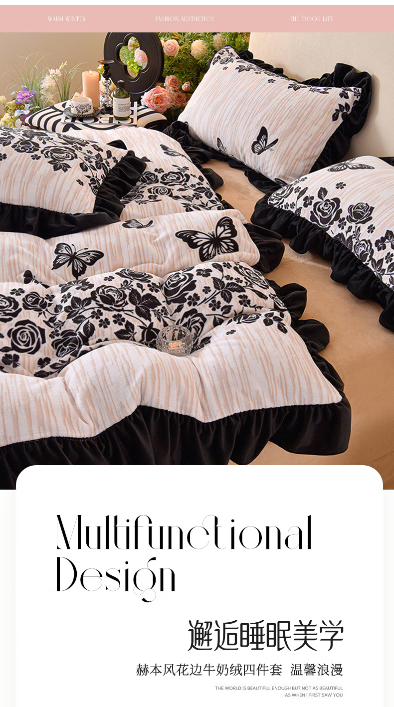 商品名称:牵依 2025新款赫本风水花边牛奶绒四件套 法式-蝶舞
