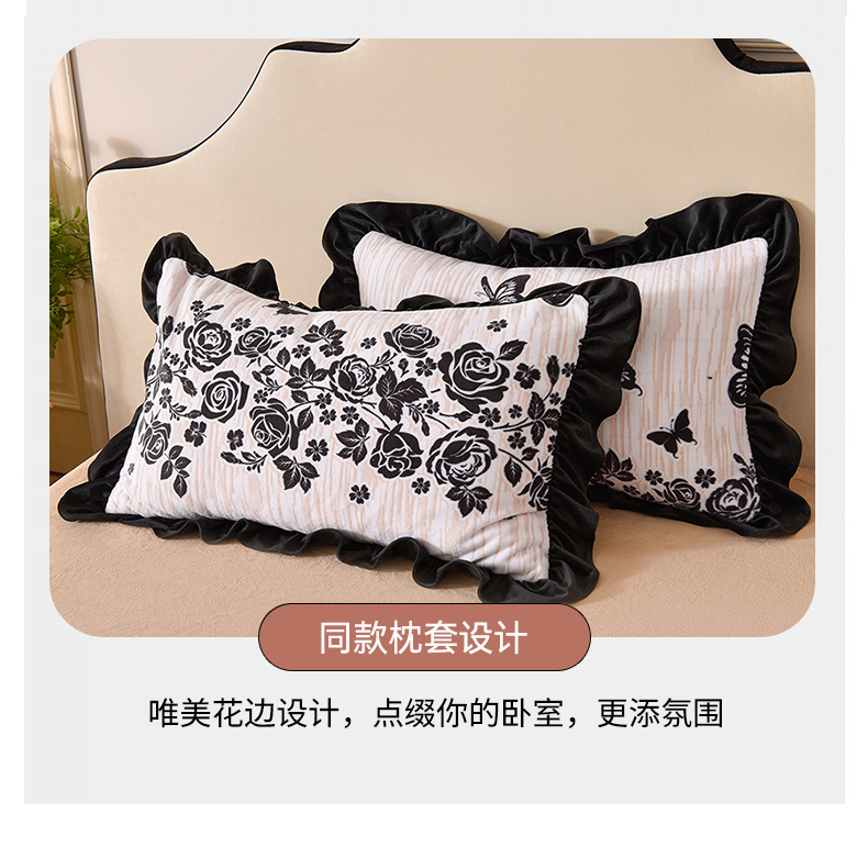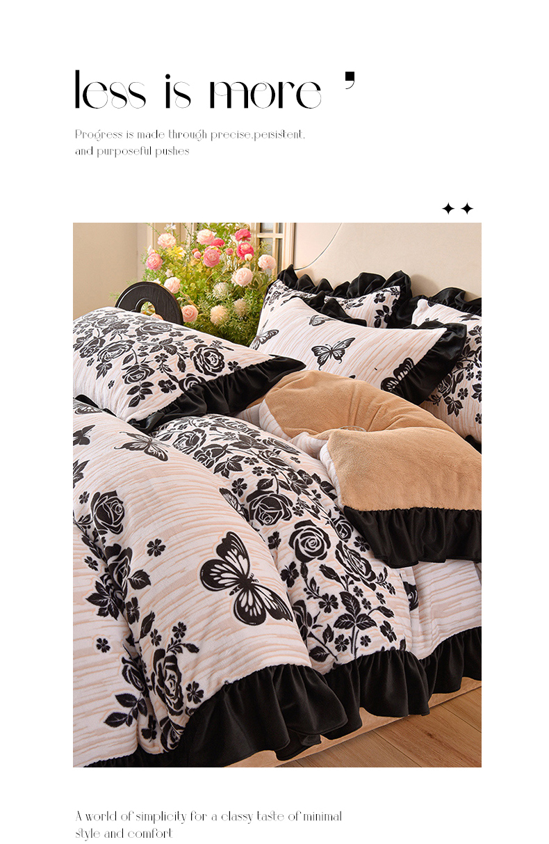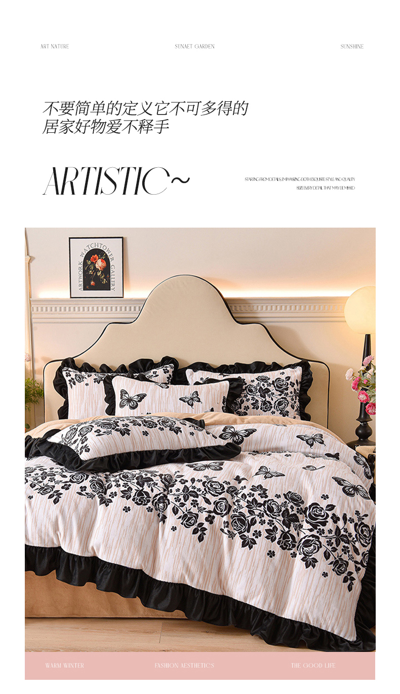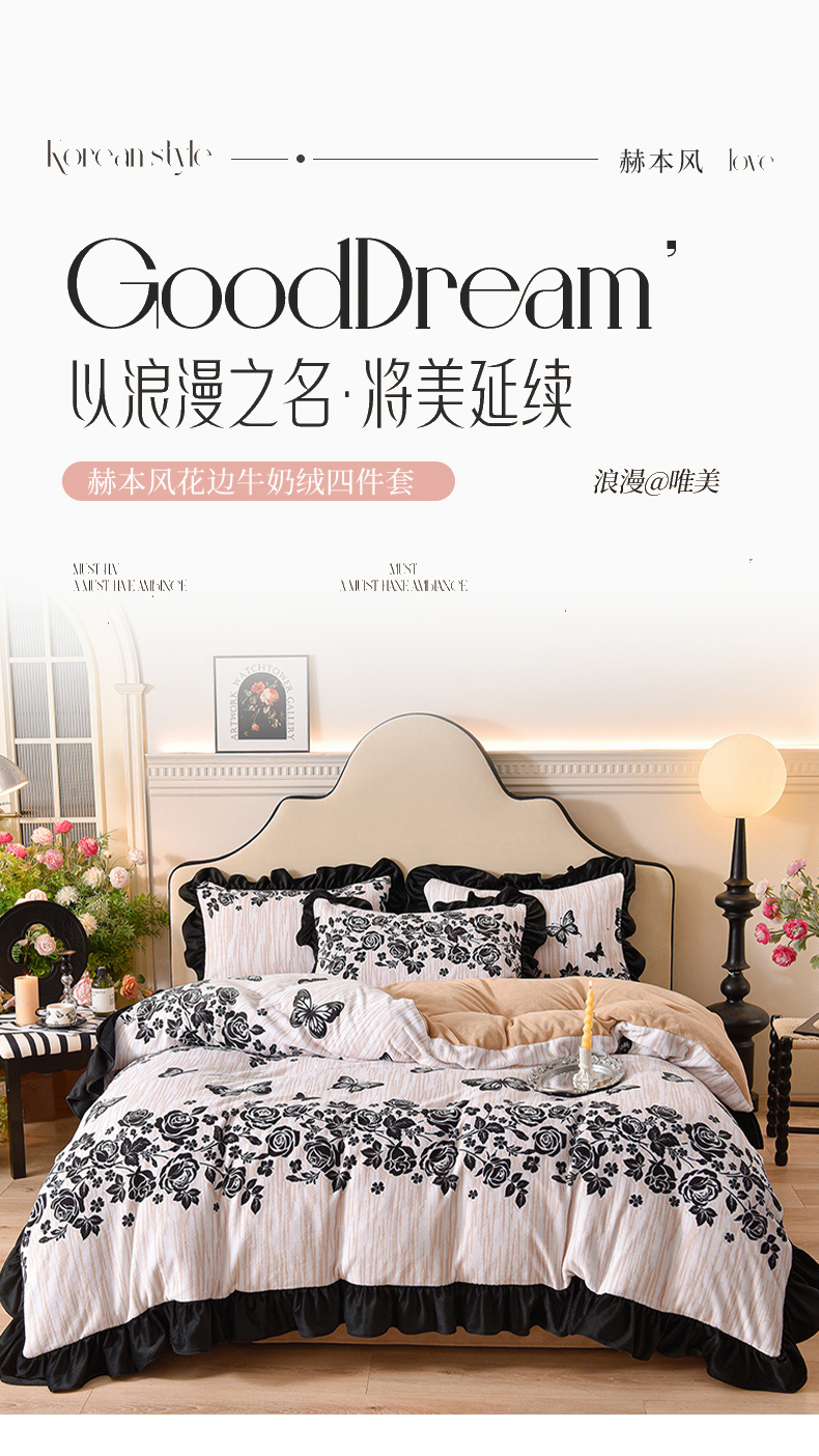 商品名称:牵依 2025新款赫本风水花边牛奶绒四件套 法式-蝶舞