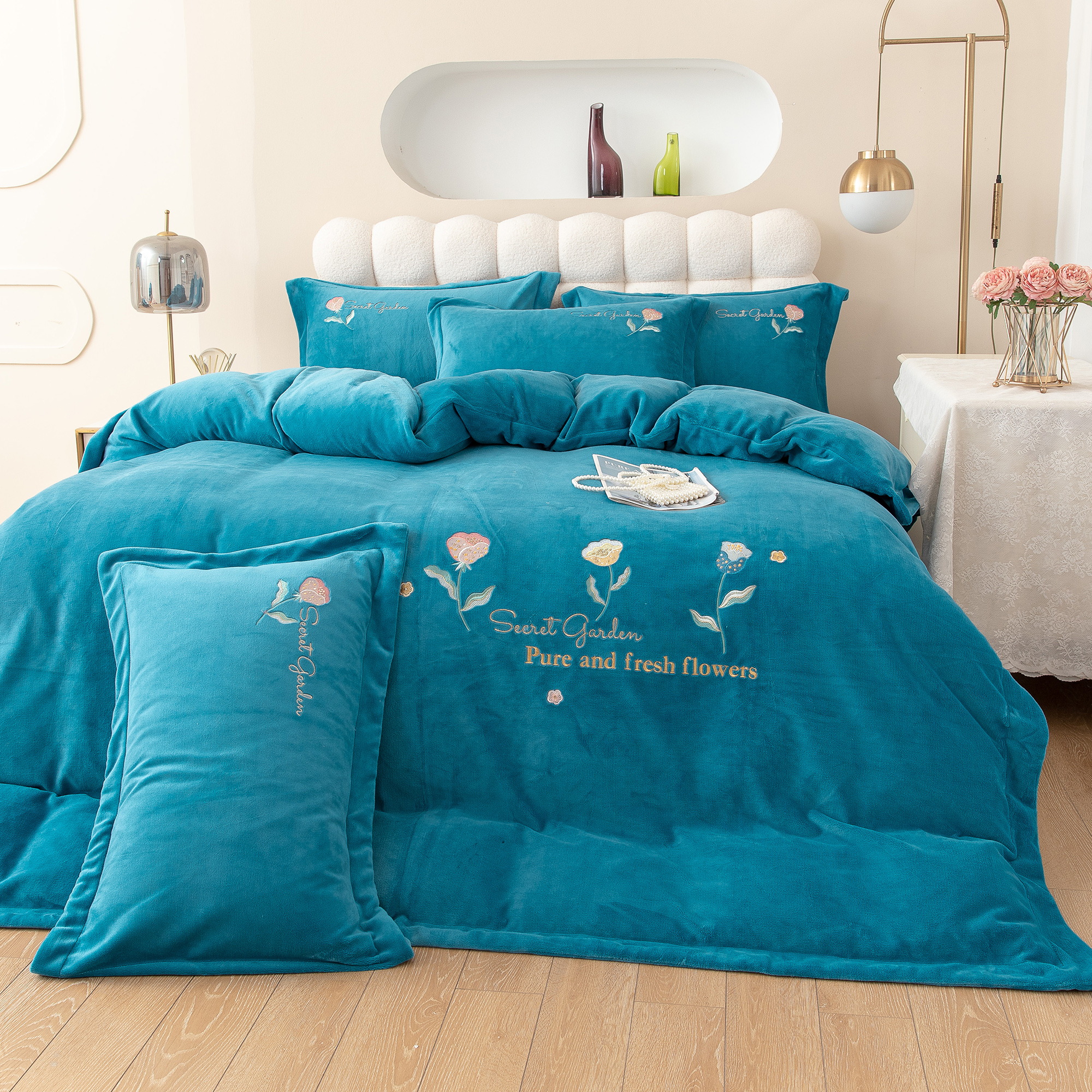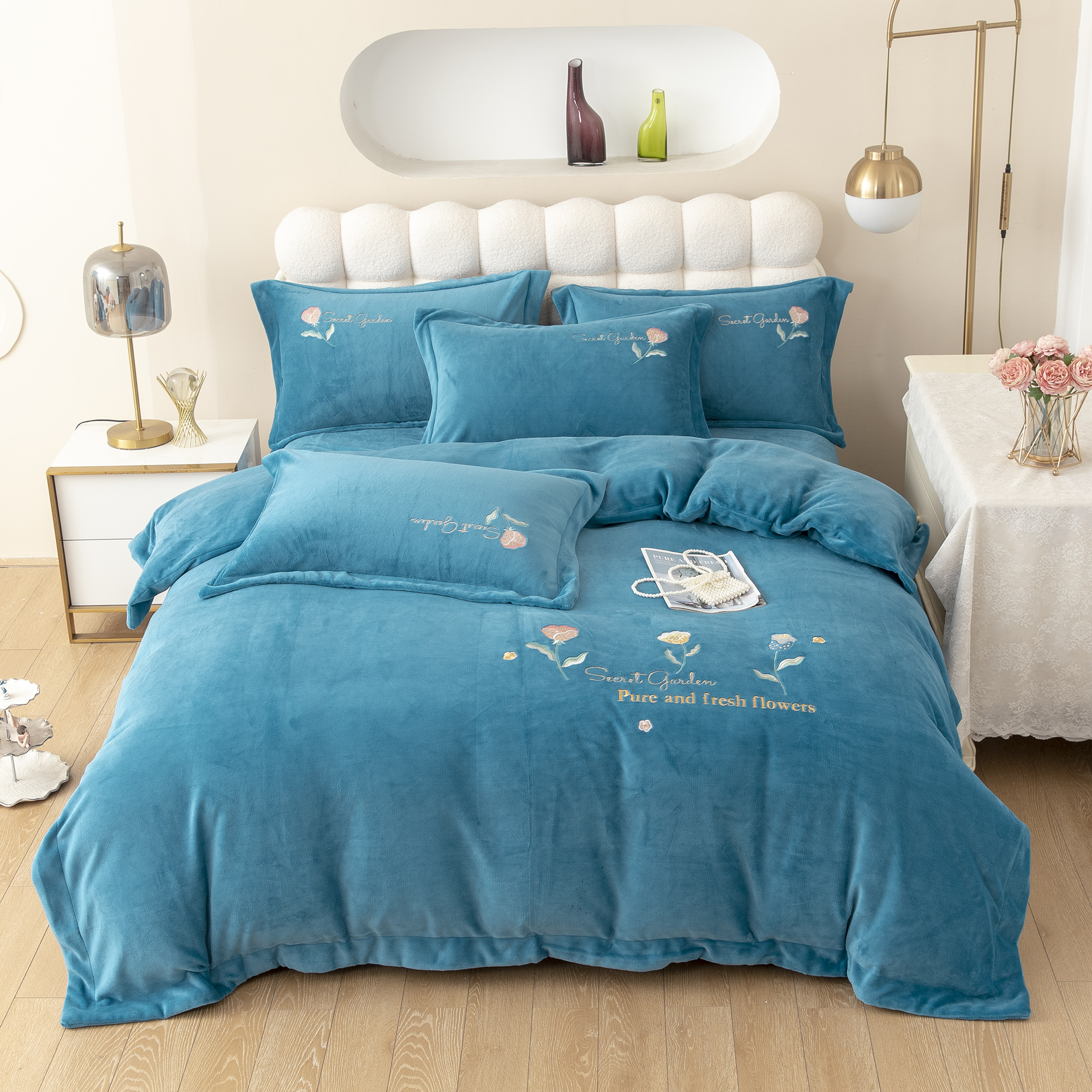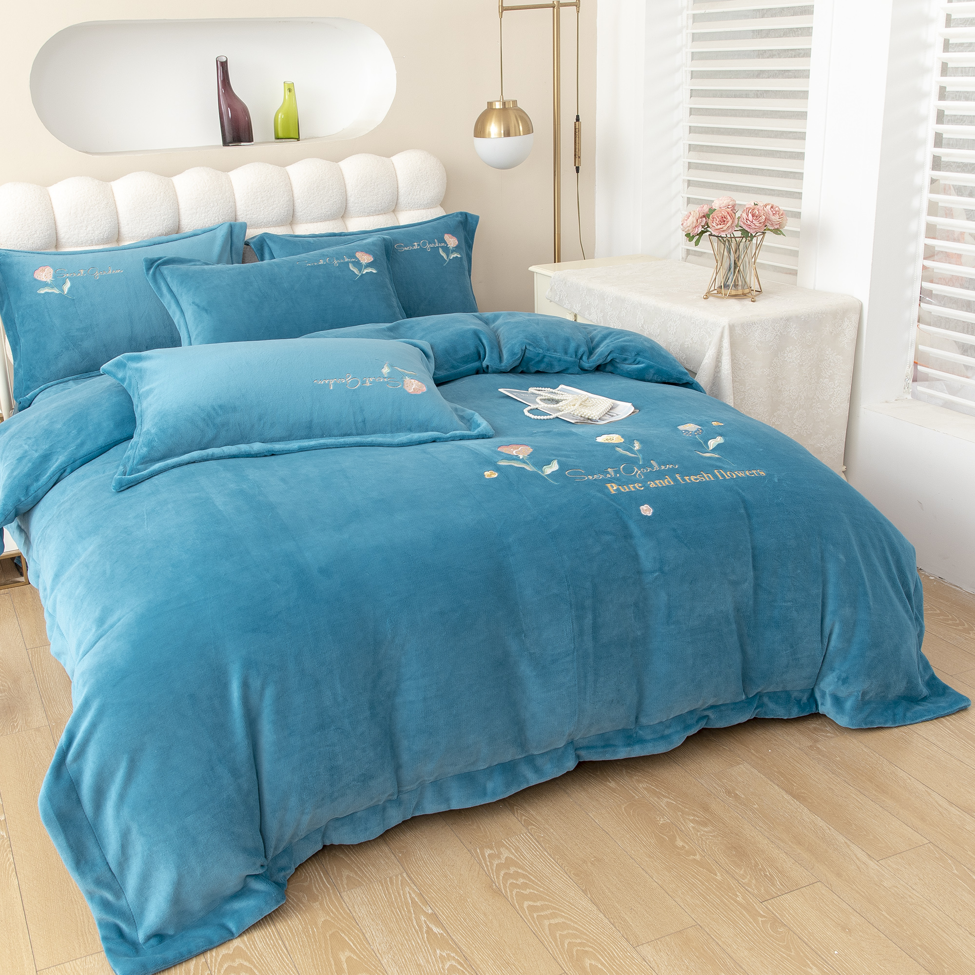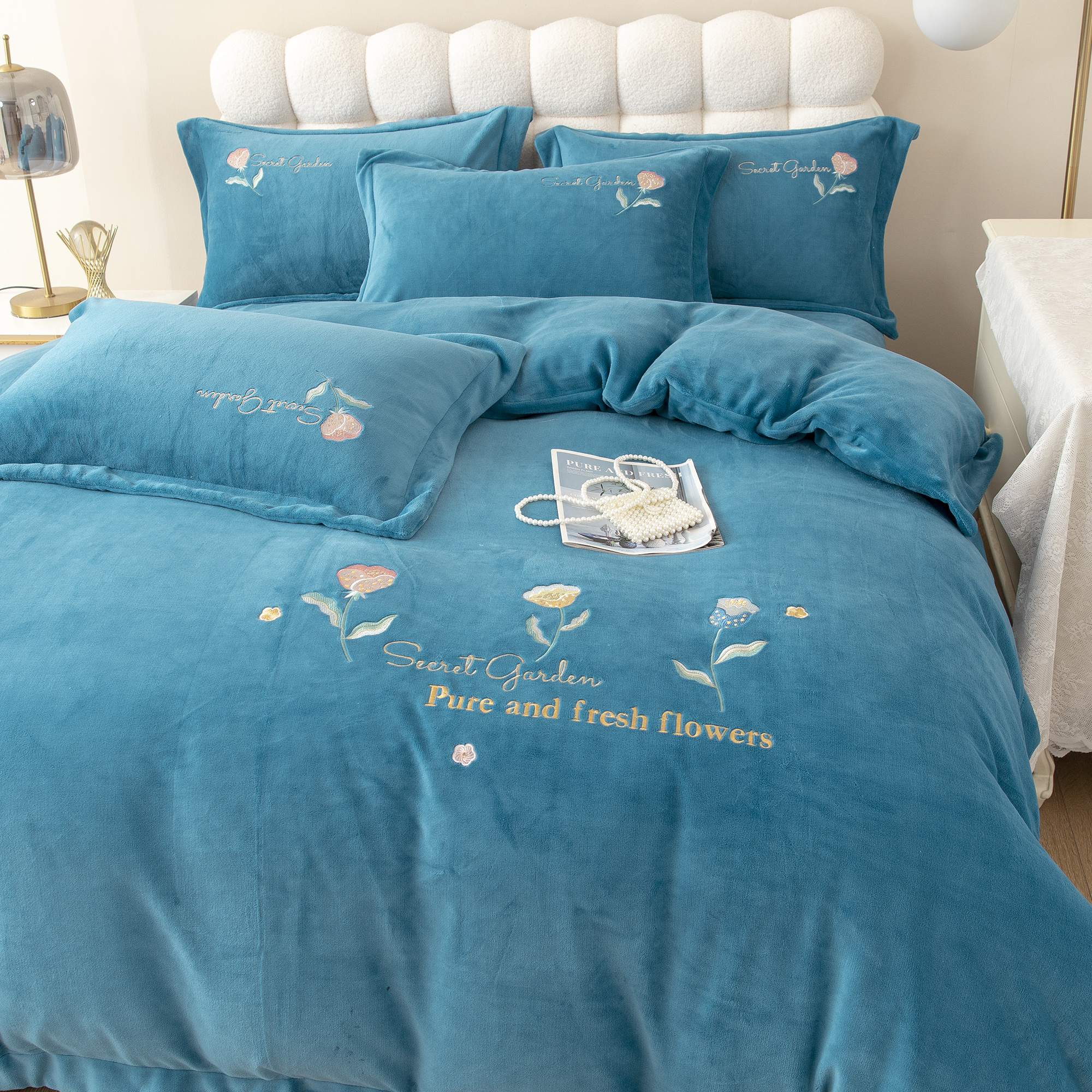 贝尔 2025新款纯色高克重牛奶绒刺绣四件套-羽魅 羽魅-蓝色,羽魅-蓝色