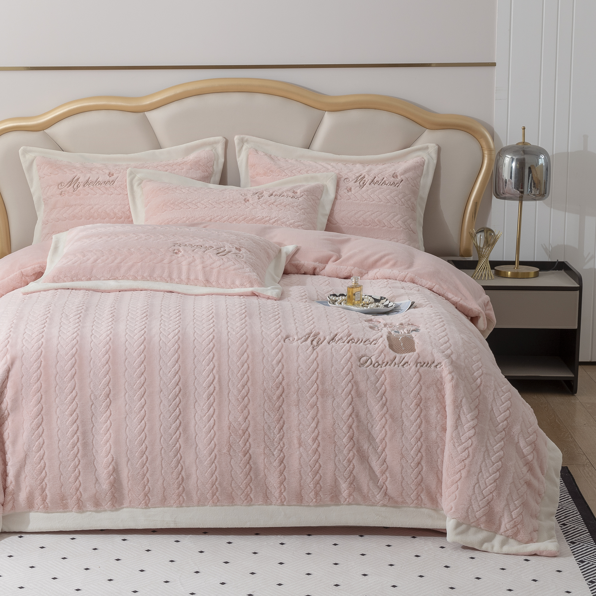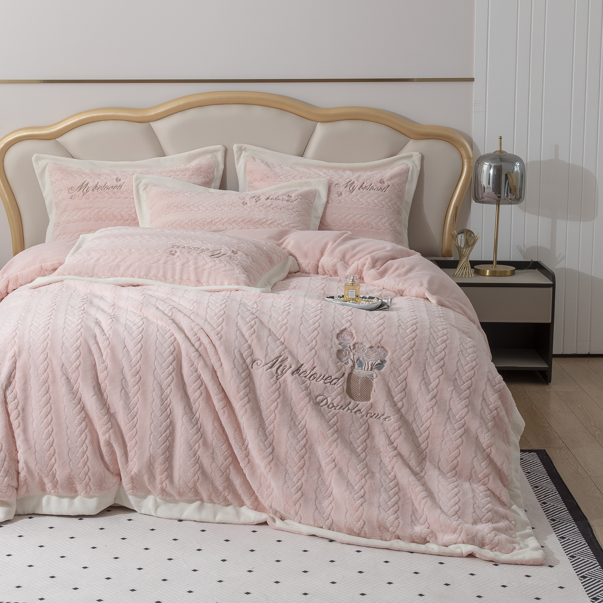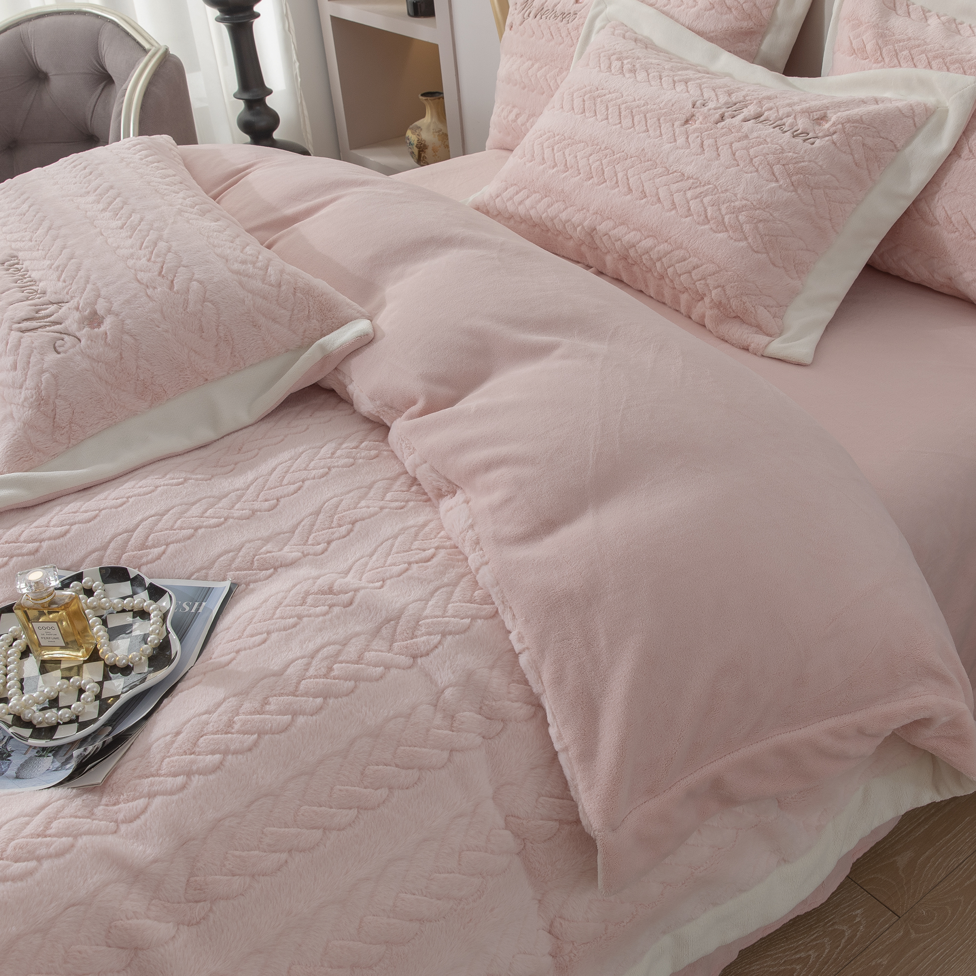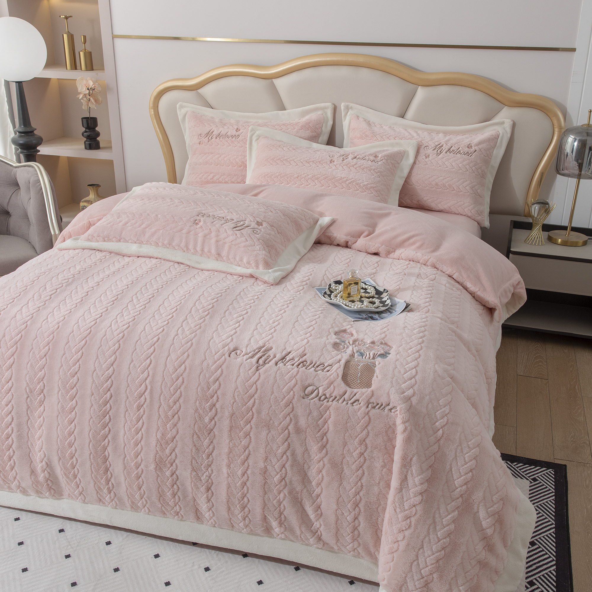 商品名称:贝尔 2025新款10斤重花时光-兔毛绒拼角刺绣纯色高克重四件套(赠送拎袋) 粉色