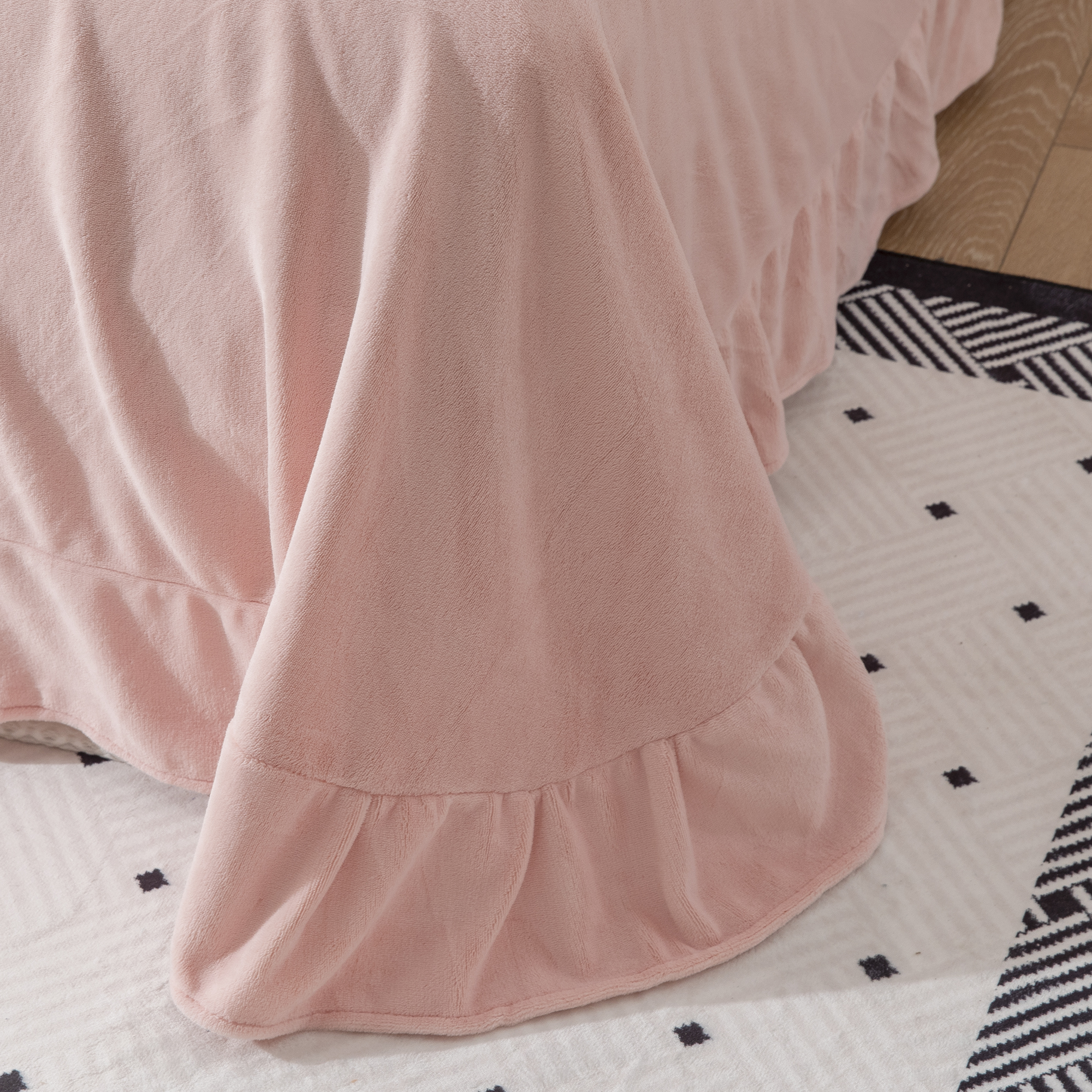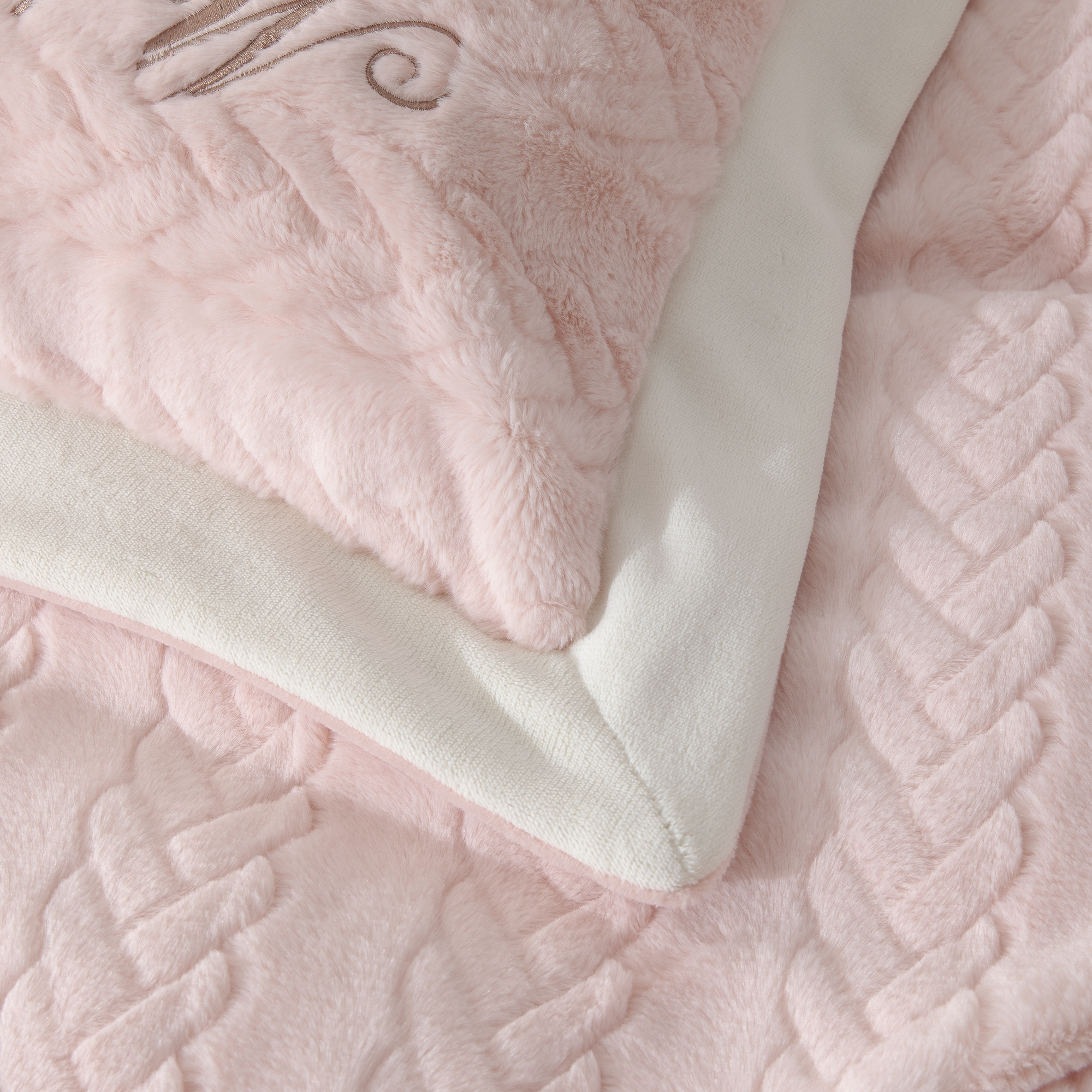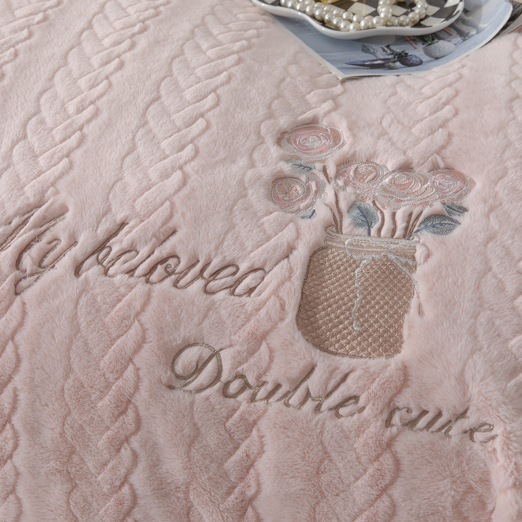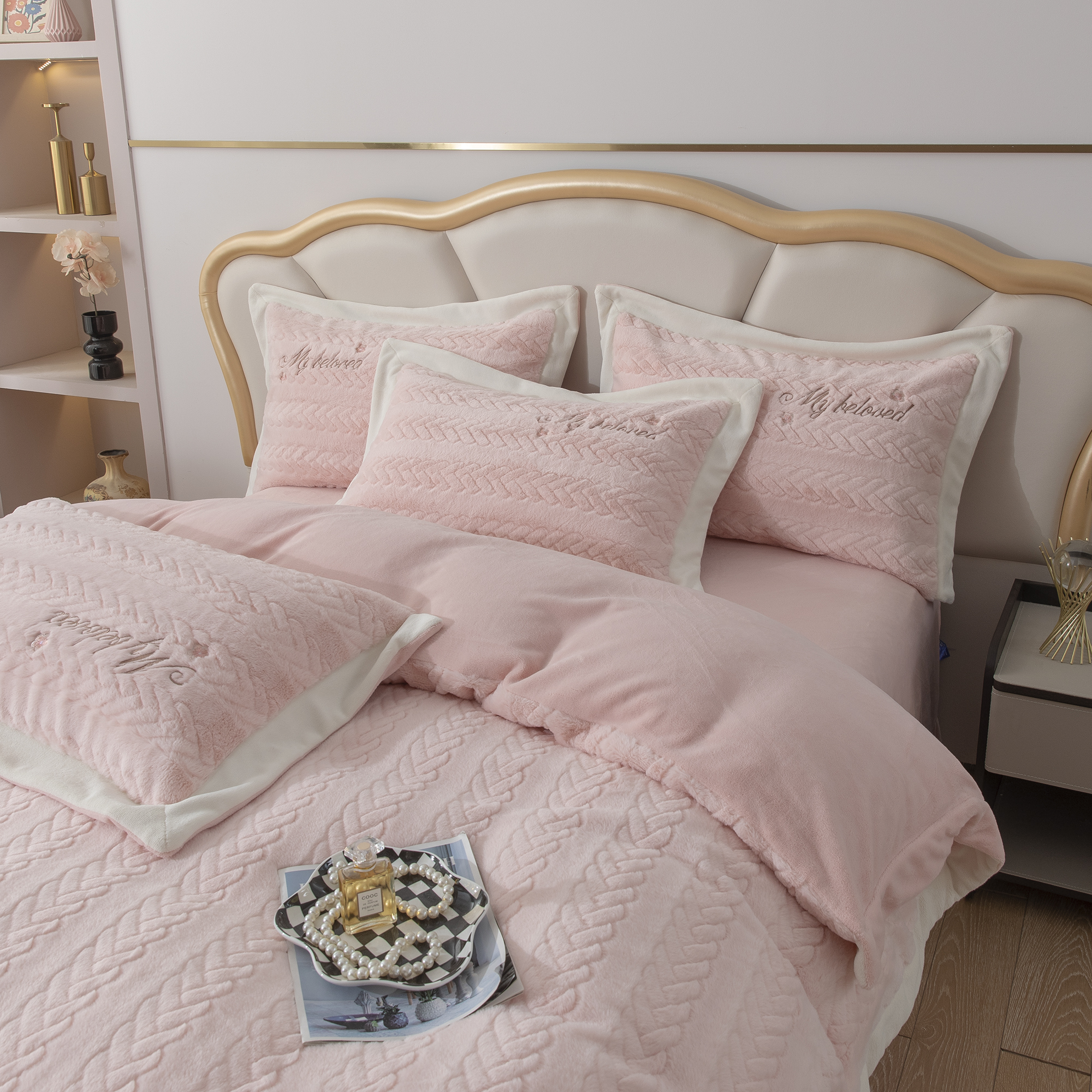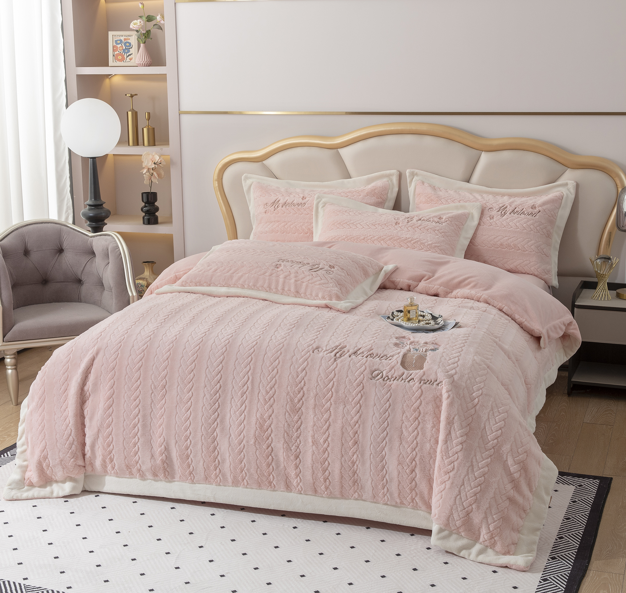 商品名称:贝尔 2025新款10斤重花时光-兔毛绒拼角刺绣纯色高克重四件套(赠送拎袋) 粉色