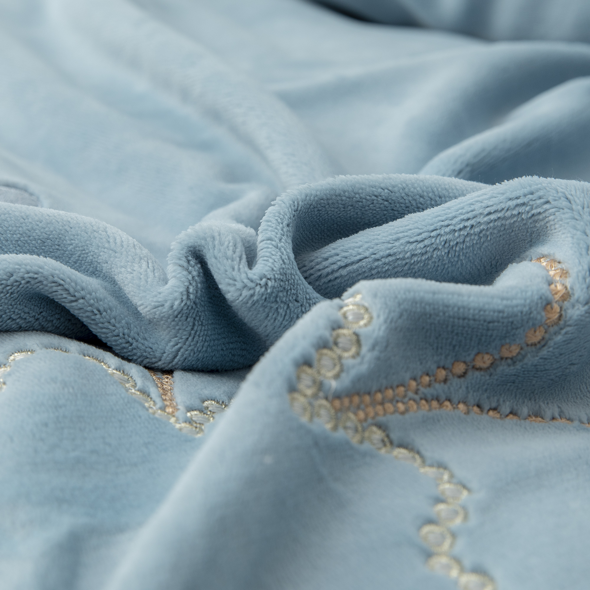 商品名称:贝尔 2025新款花之语-纯色高克重全消光蚕丝绒(赠送拎袋)-段角刺绣四件套 浅蓝