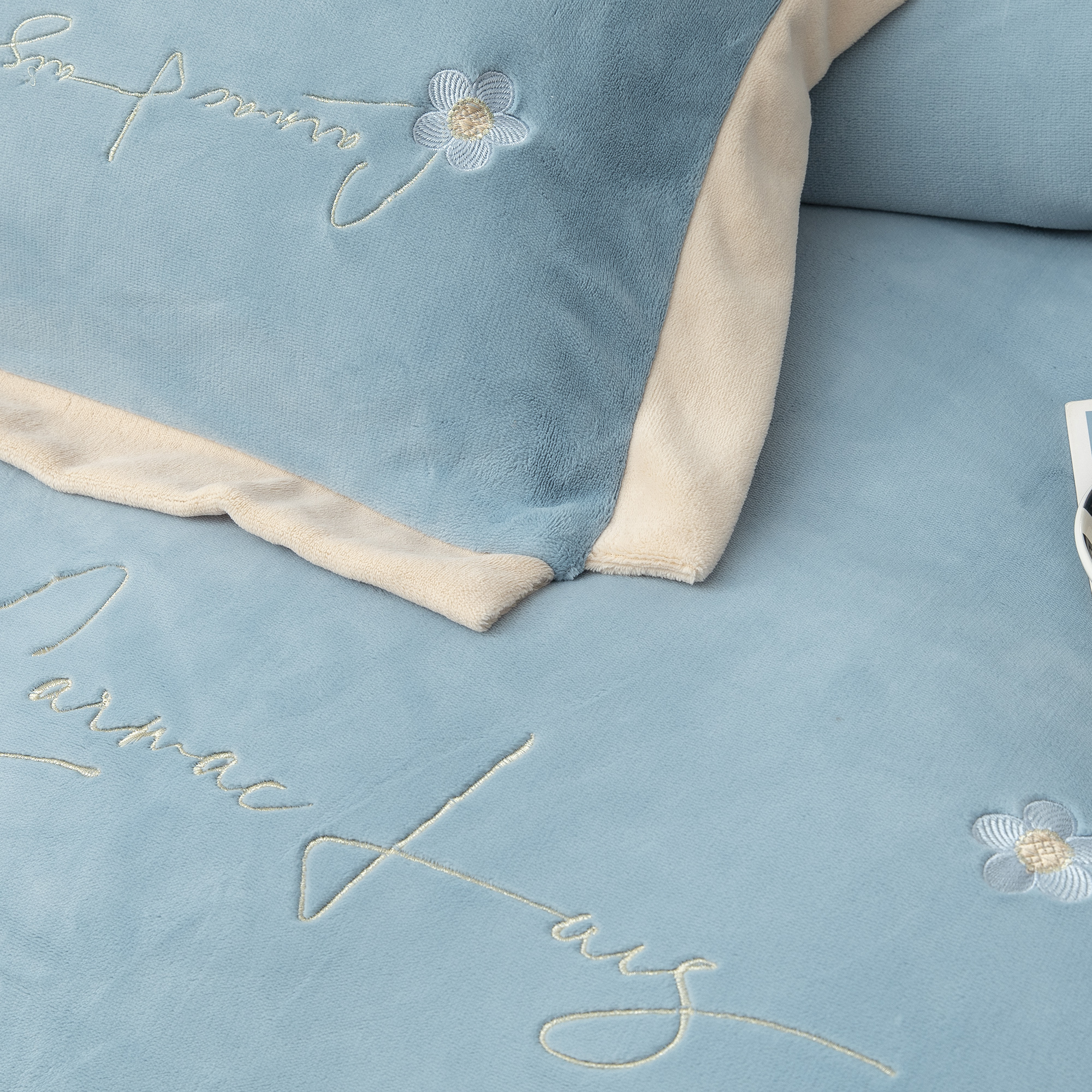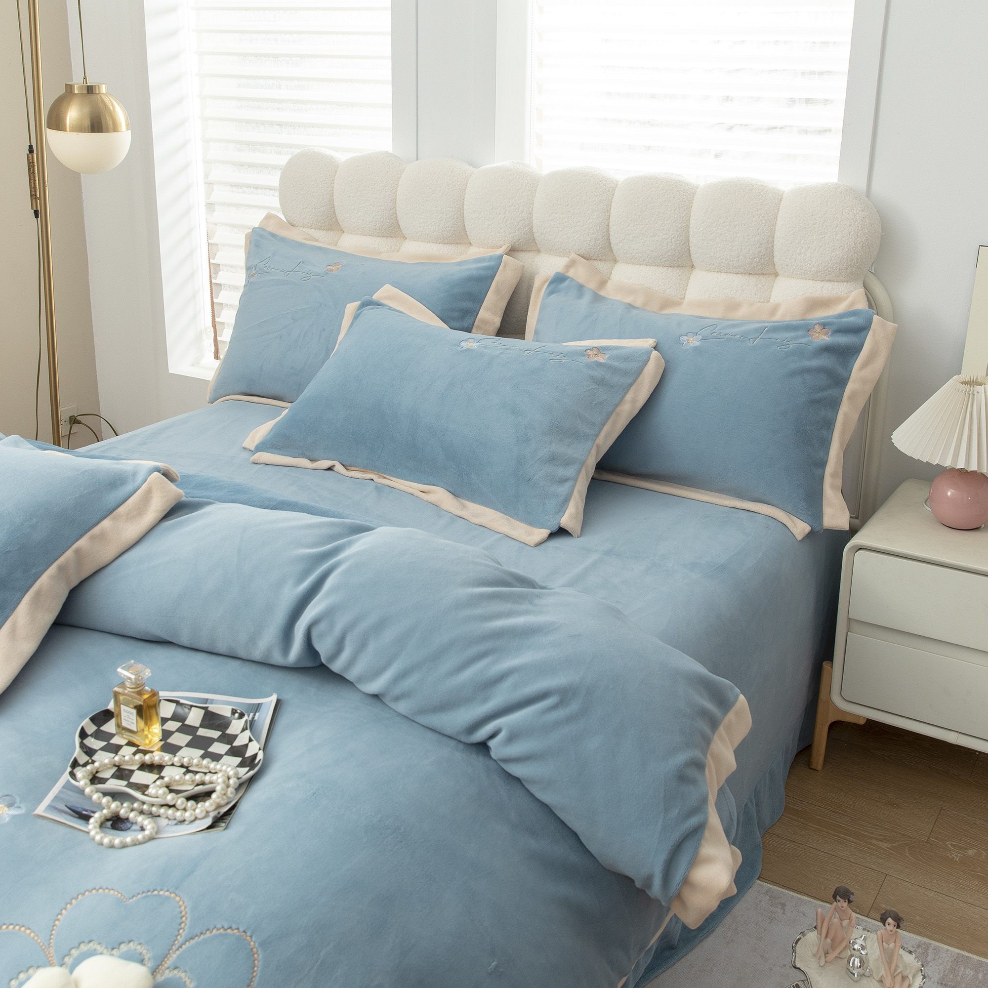 贝尔 2025新款纯色高克重牛奶绒刺绣四件套-羽魅 羽魅-蓝色,羽魅-蓝色