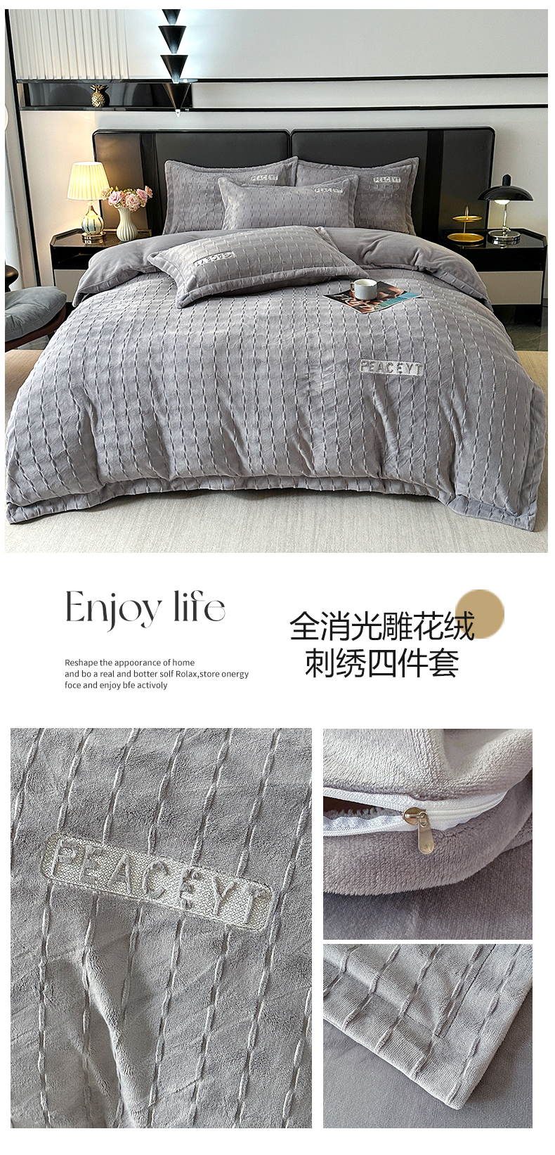 商品名称:梓之赫 2025新款全消光雕花绒牛奶绒刺绣四件套-甜梦 甜梦-灰色