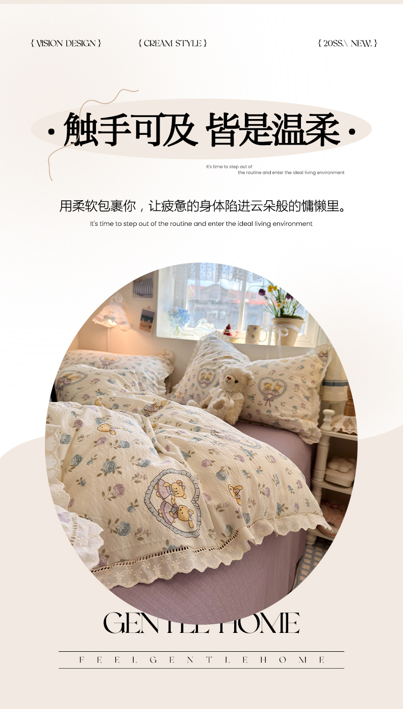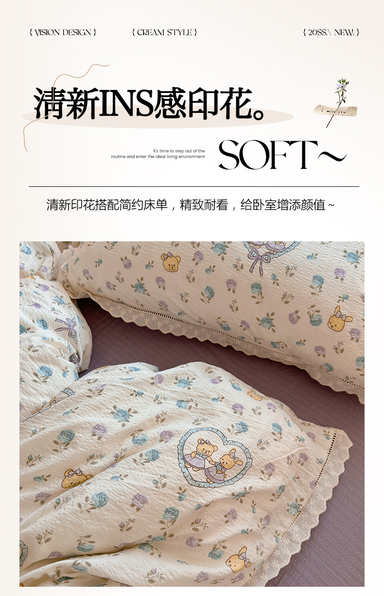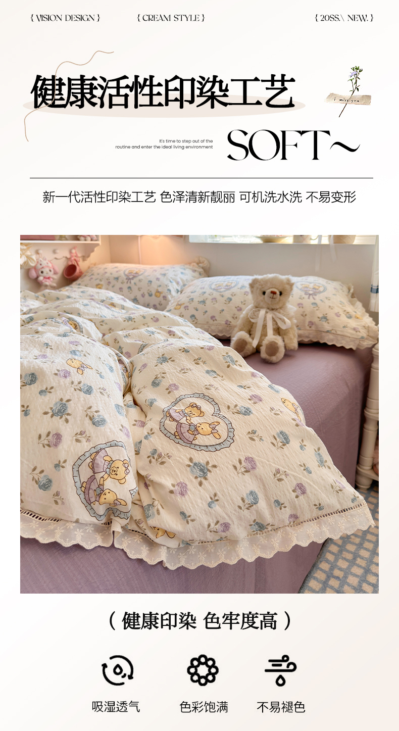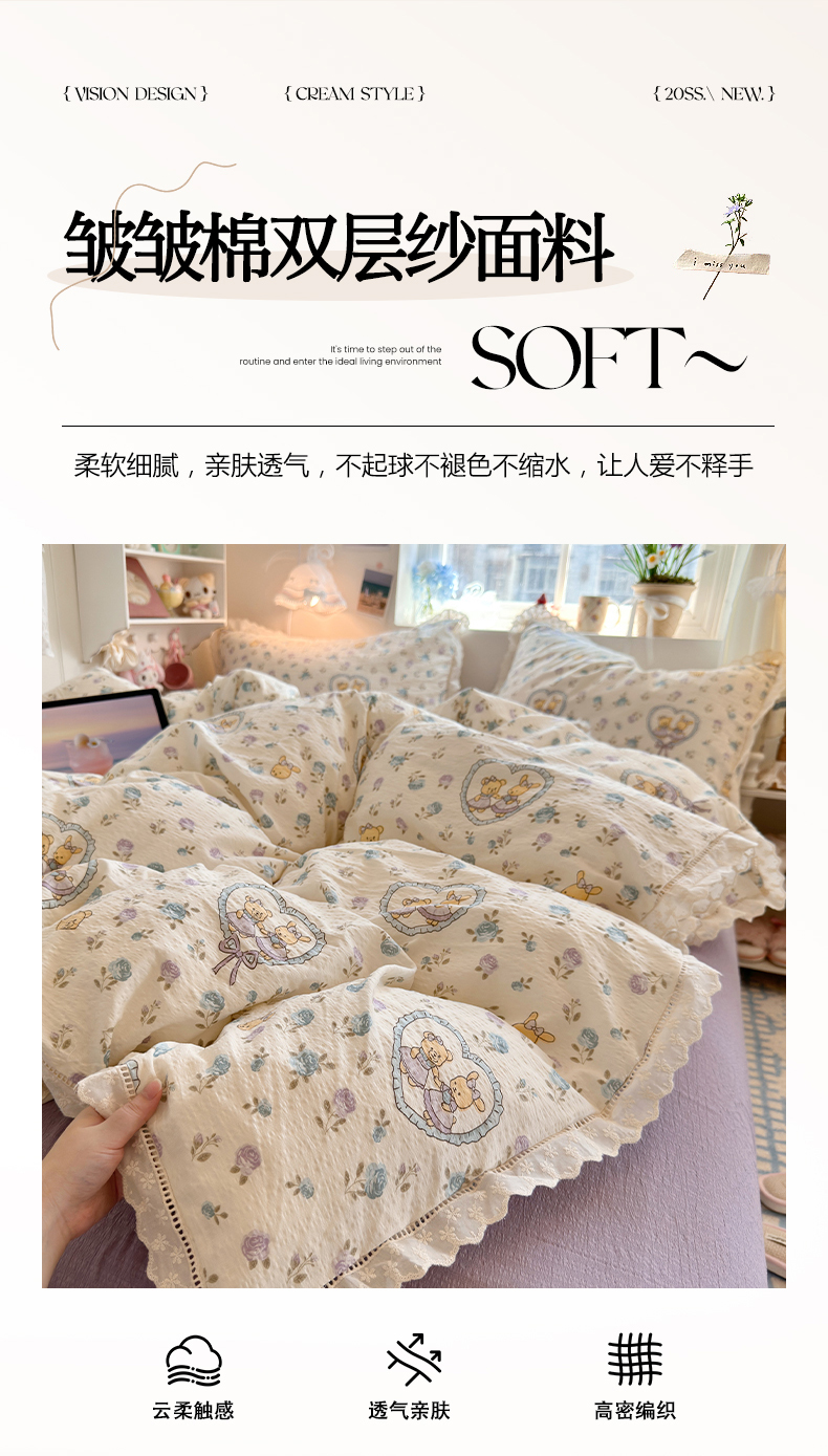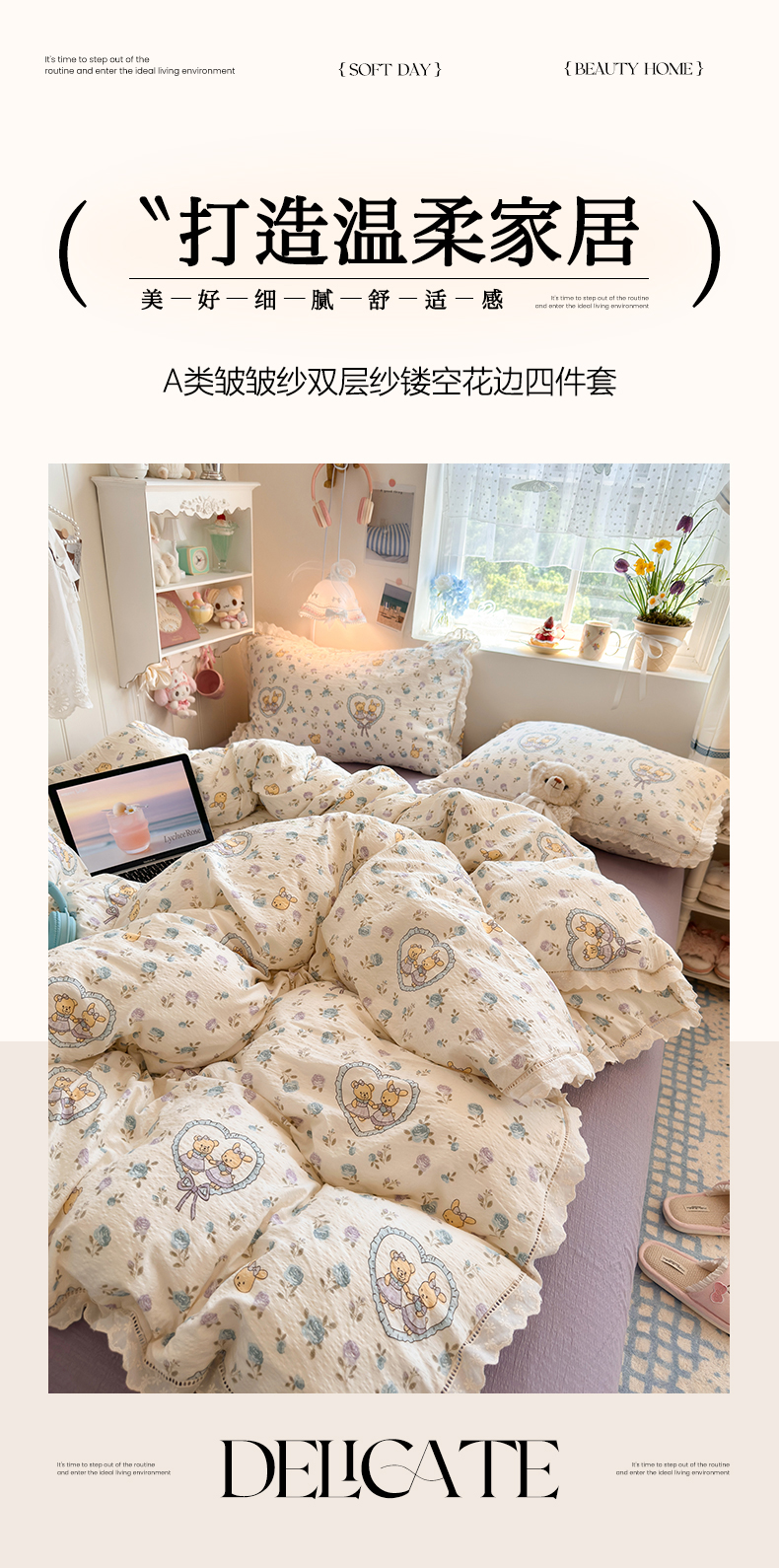 当前位置: 91家纺网 > 商品网购 > 床品套件 > 四件套 > 双层纱四件套 > 优卡迪家纺馆 2025新款A类全棉镂空花边皱皱棉双层纱四件套 花香浮梦