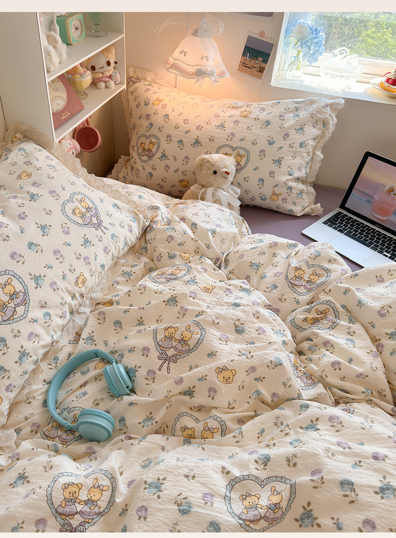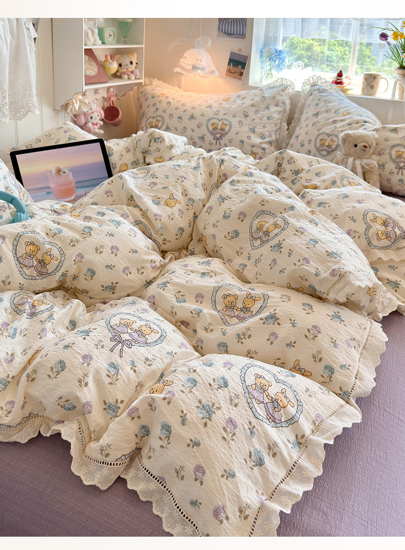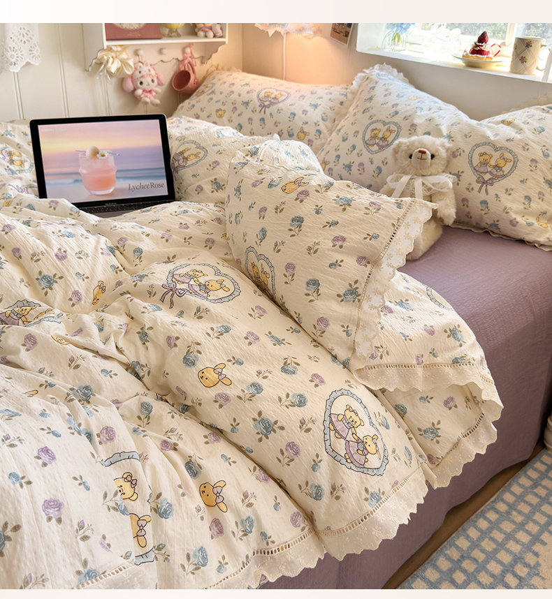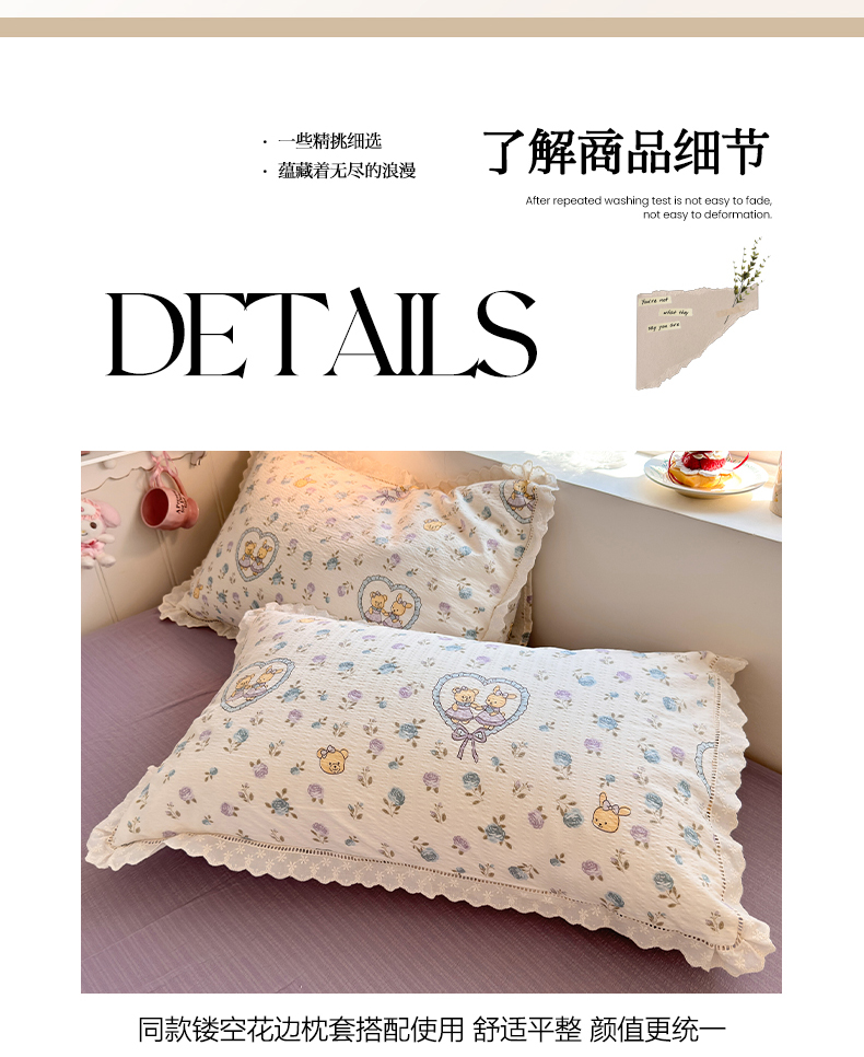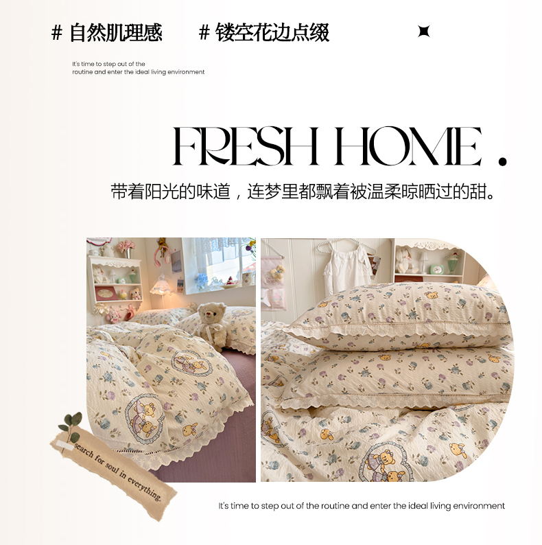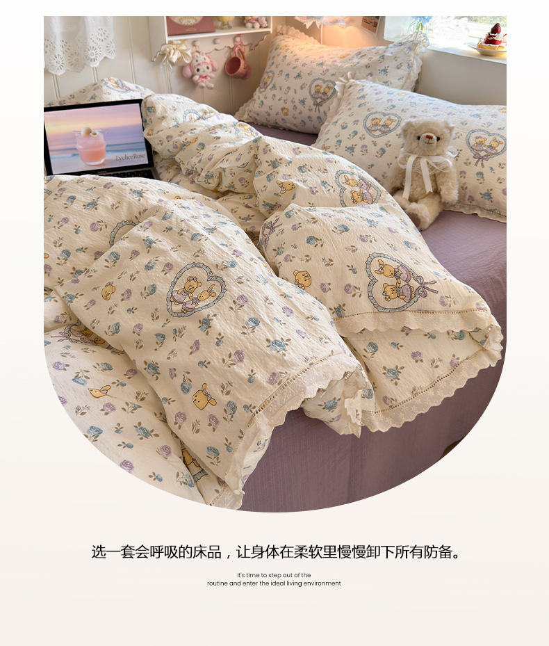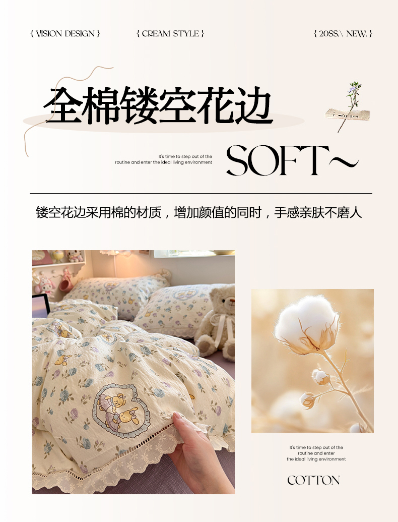 当前位置: 91家纺网 > 商品网购 > 床品套件 > 四件套 > 双层纱四件套 > 优卡迪家纺馆 2025新款A类全棉镂空花边皱皱棉双层纱四件套 花香浮梦