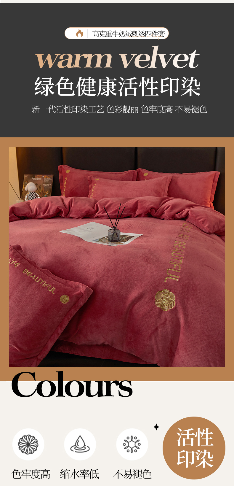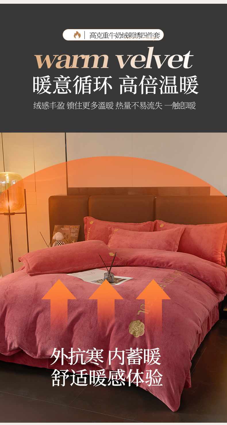 商品名称:悦织湾家纺 2025新款绣花200克重牛奶绒四件套刺绣3.5万针7斤重高密加厚保暖跨境专供外贸出口电商热销款 山茶花-豆沙红