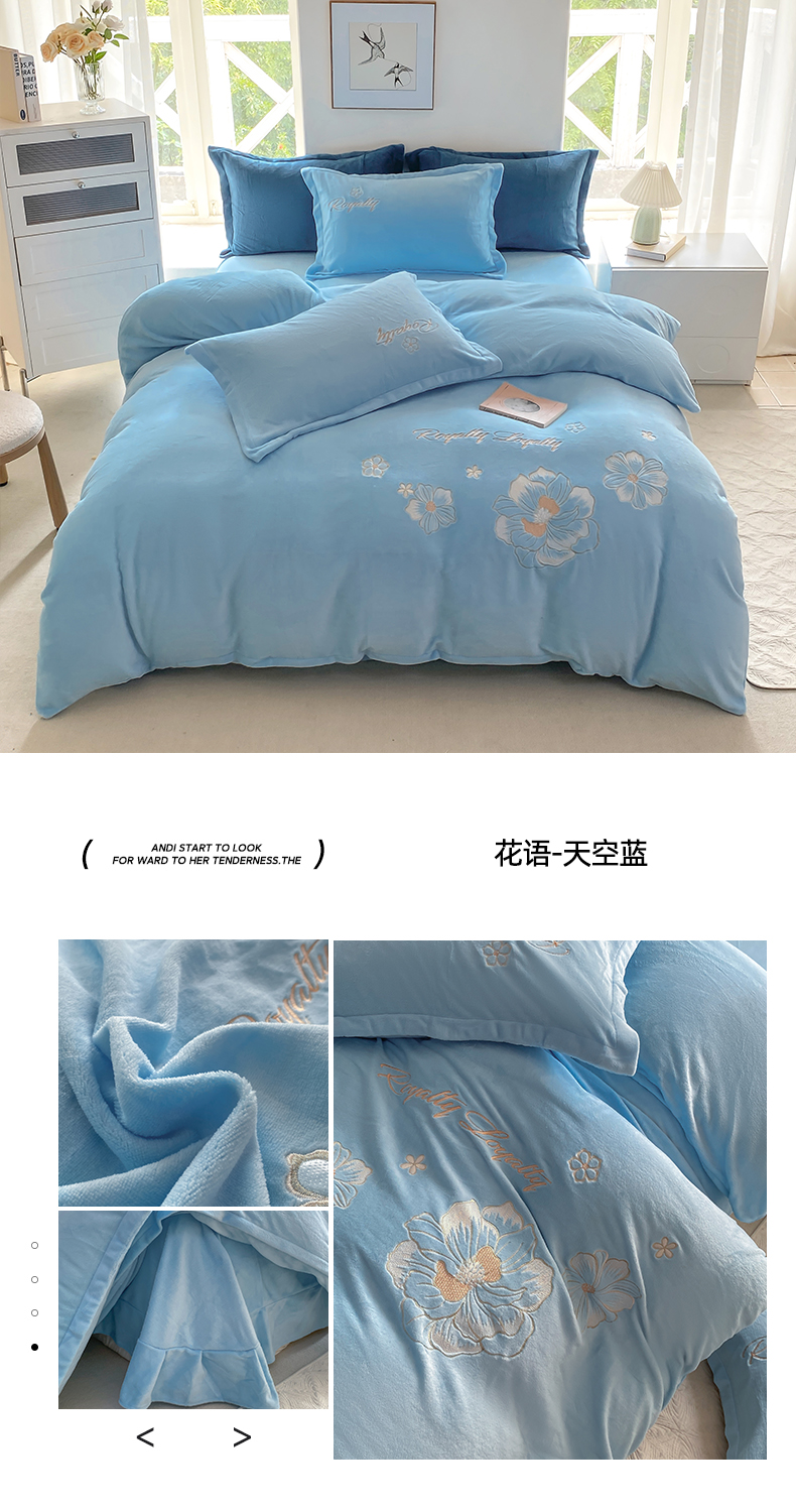 悦织湾家纺 2025新款绣花200克重牛奶绒四件套刺绣3.5万针7斤重高密加厚保暖跨境专供外贸出口电商热销款 山茶花-豆沙红