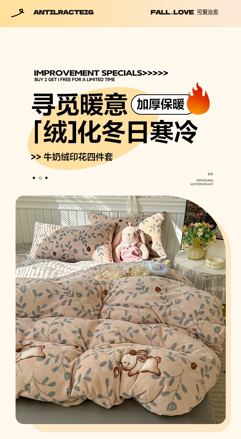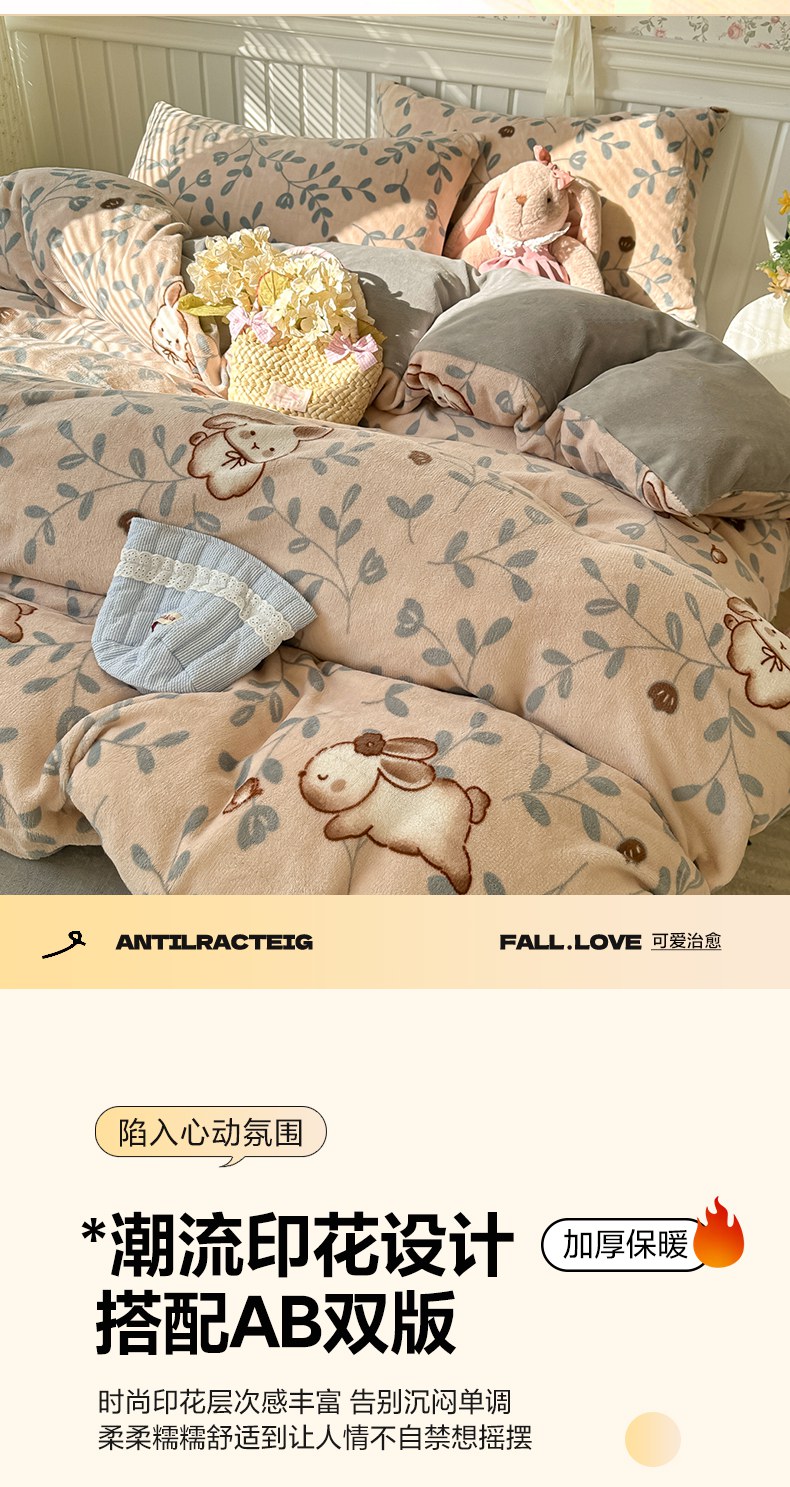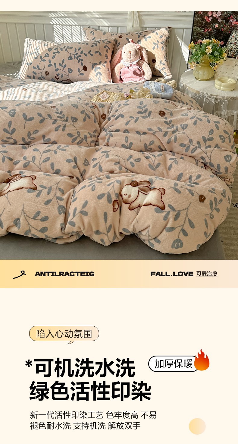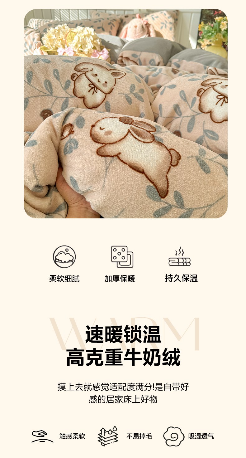 当前位置: 91家纺网 > 商品网购 > 床品套件 > 四件套 > 牛奶绒四件套 > 韩巢家纺 2025新款高克重印花牛奶绒床品四件套 叶子萌兔