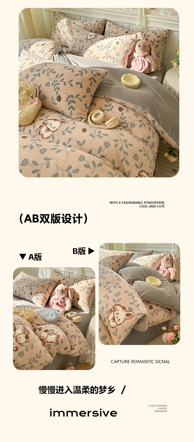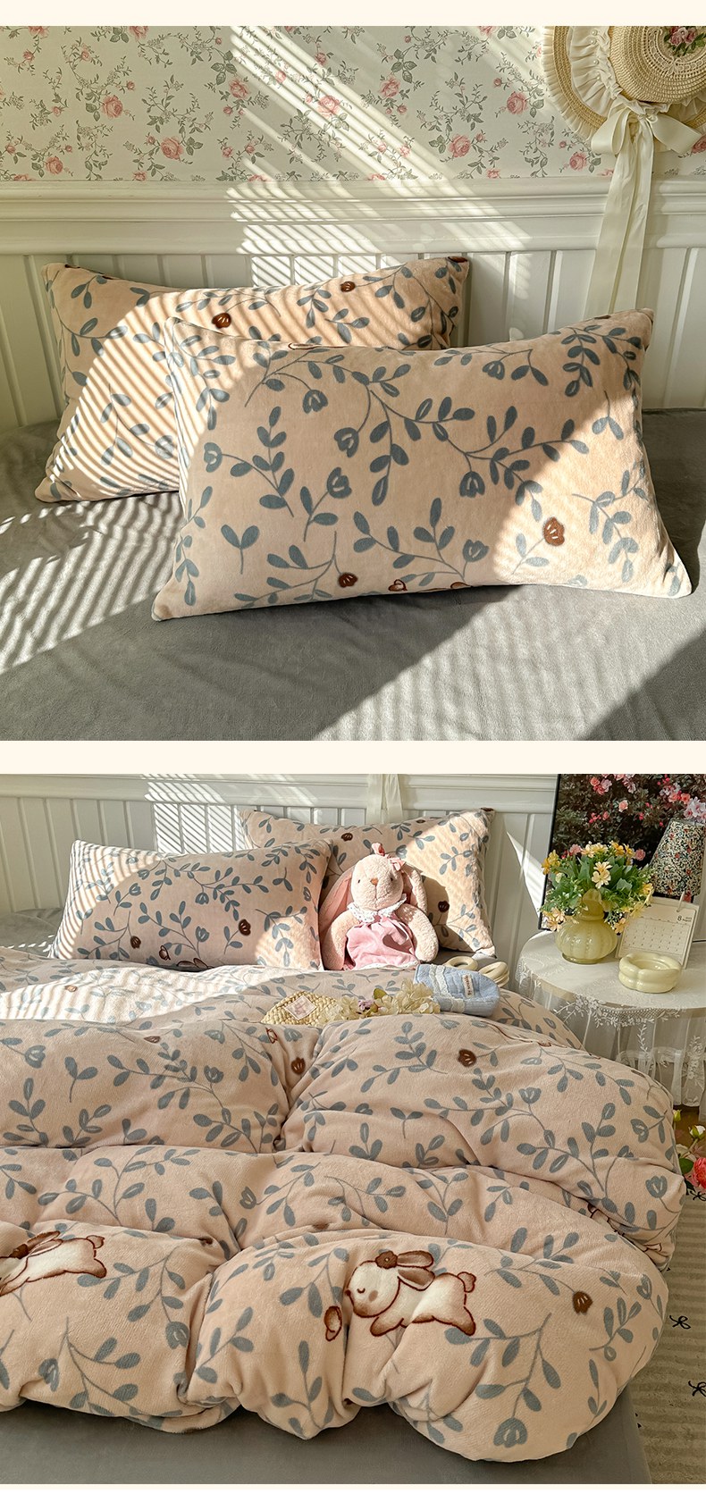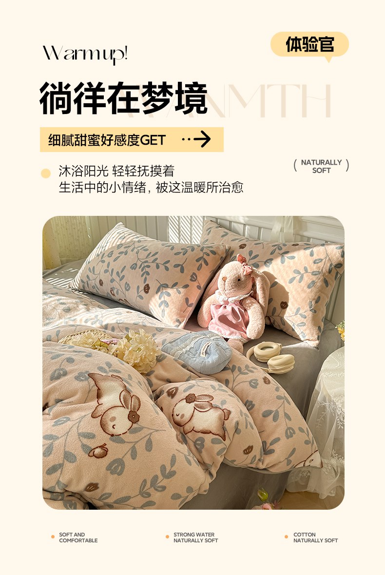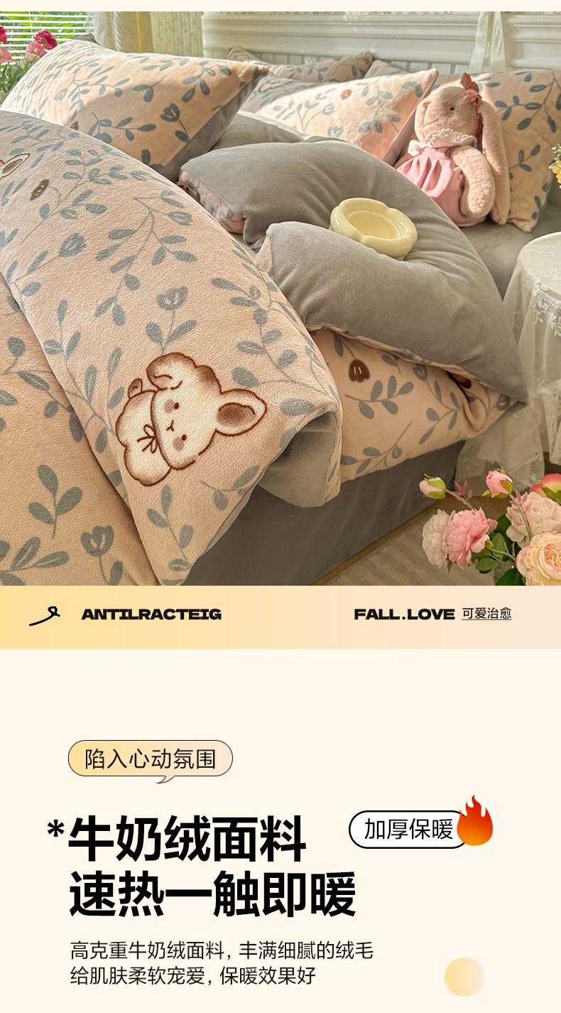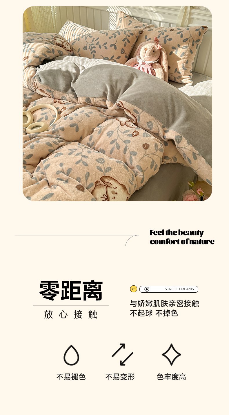 当前位置: 91家纺网 > 商品网购 > 床品套件 > 四件套 > 牛奶绒四件套 > 韩巢家纺 2025新款高克重印花牛奶绒床品四件套 叶子萌兔