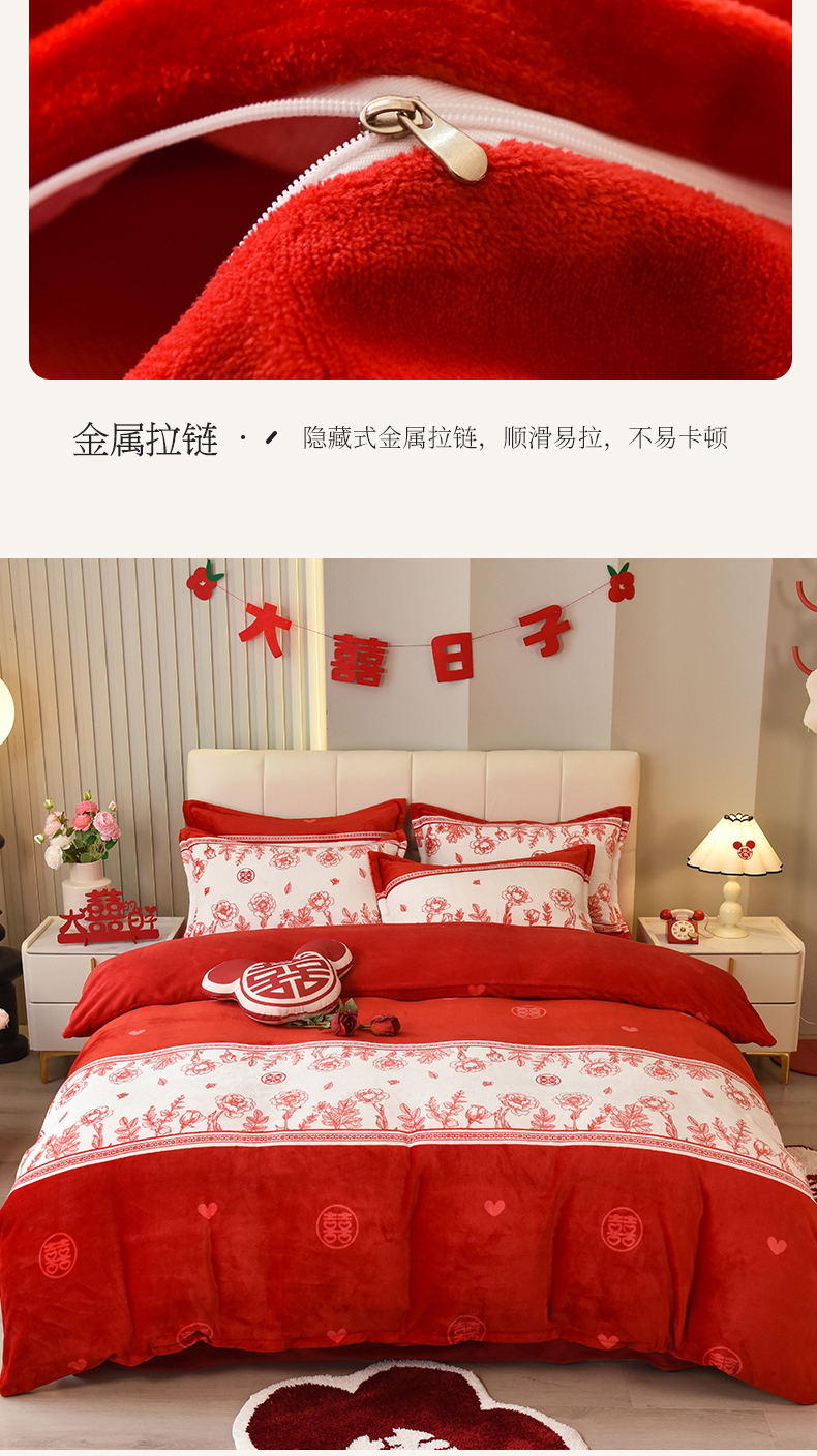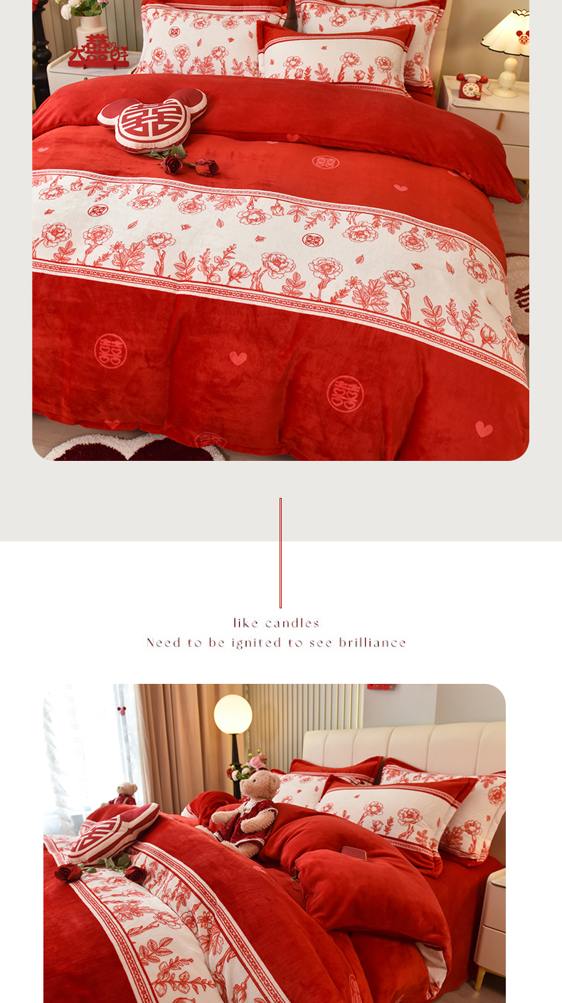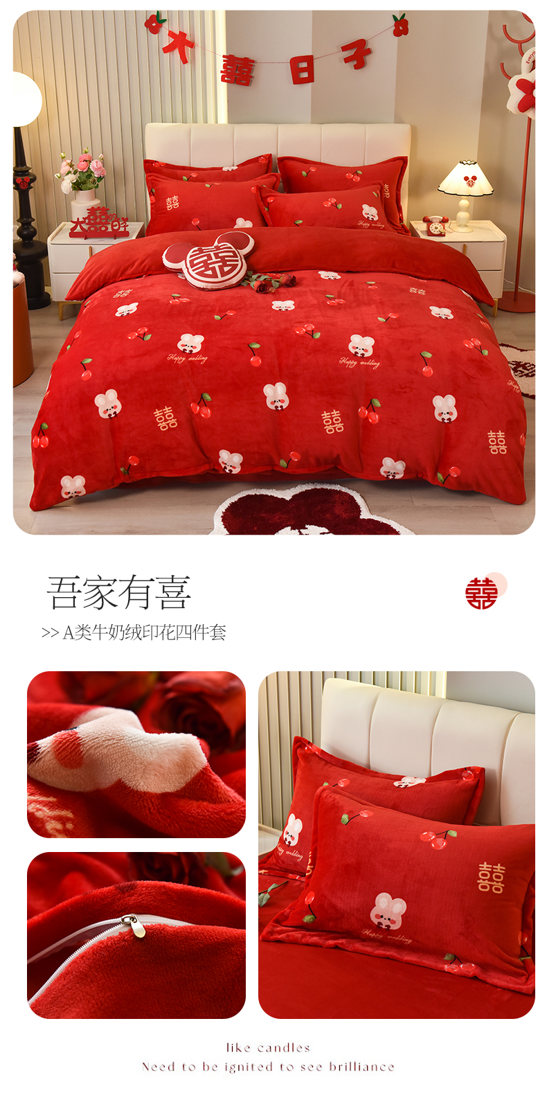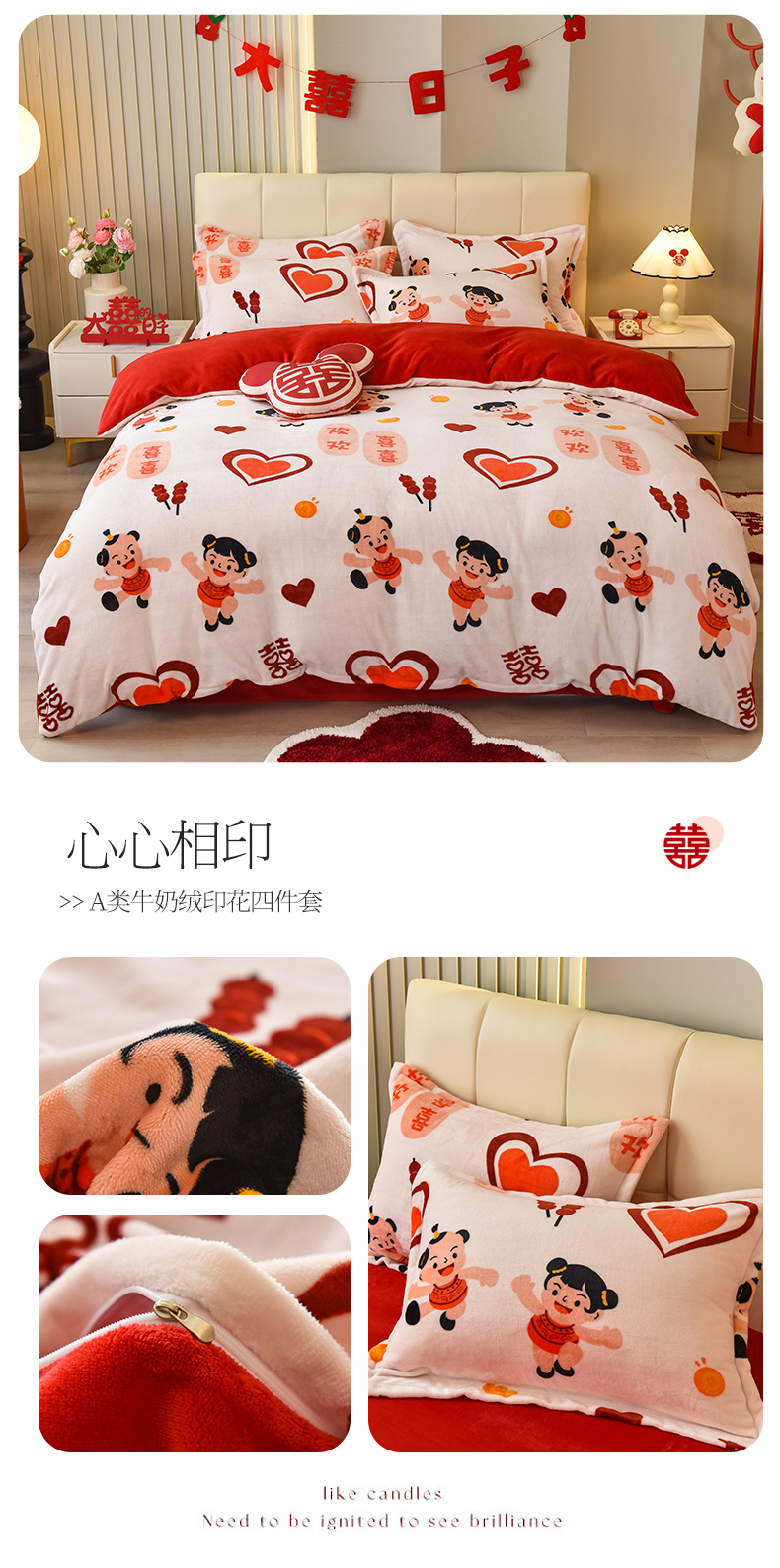 商品名称:曲之慕 2025新款高克重牛奶绒简约婚庆四件套 吾家有喜