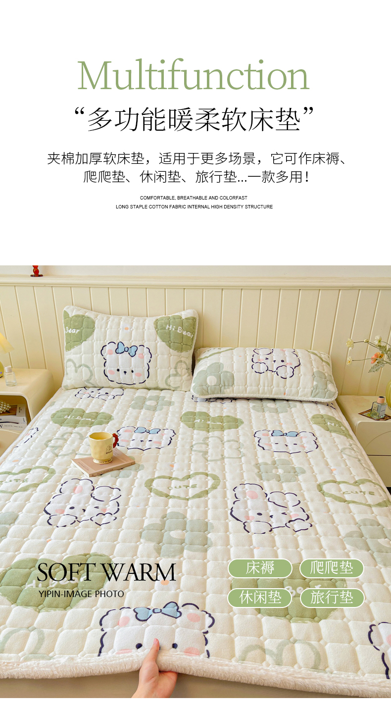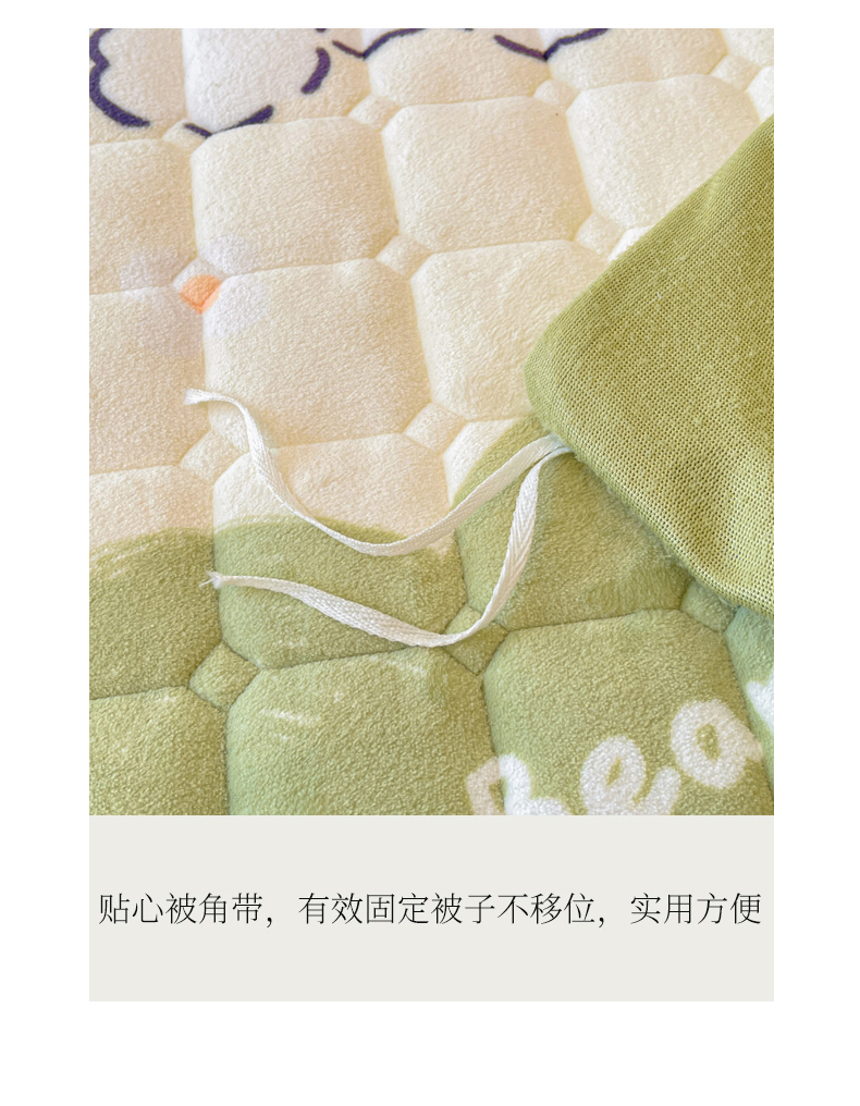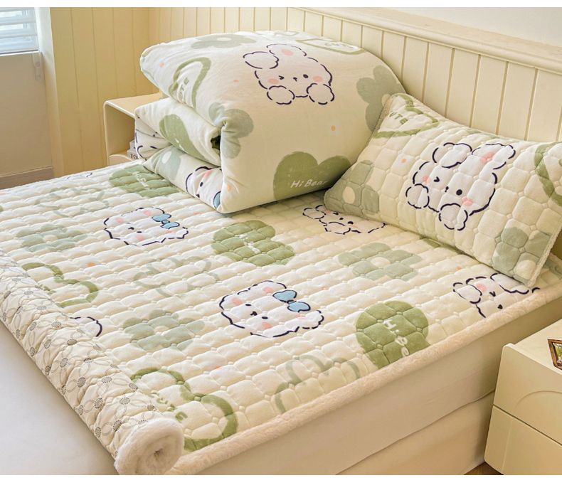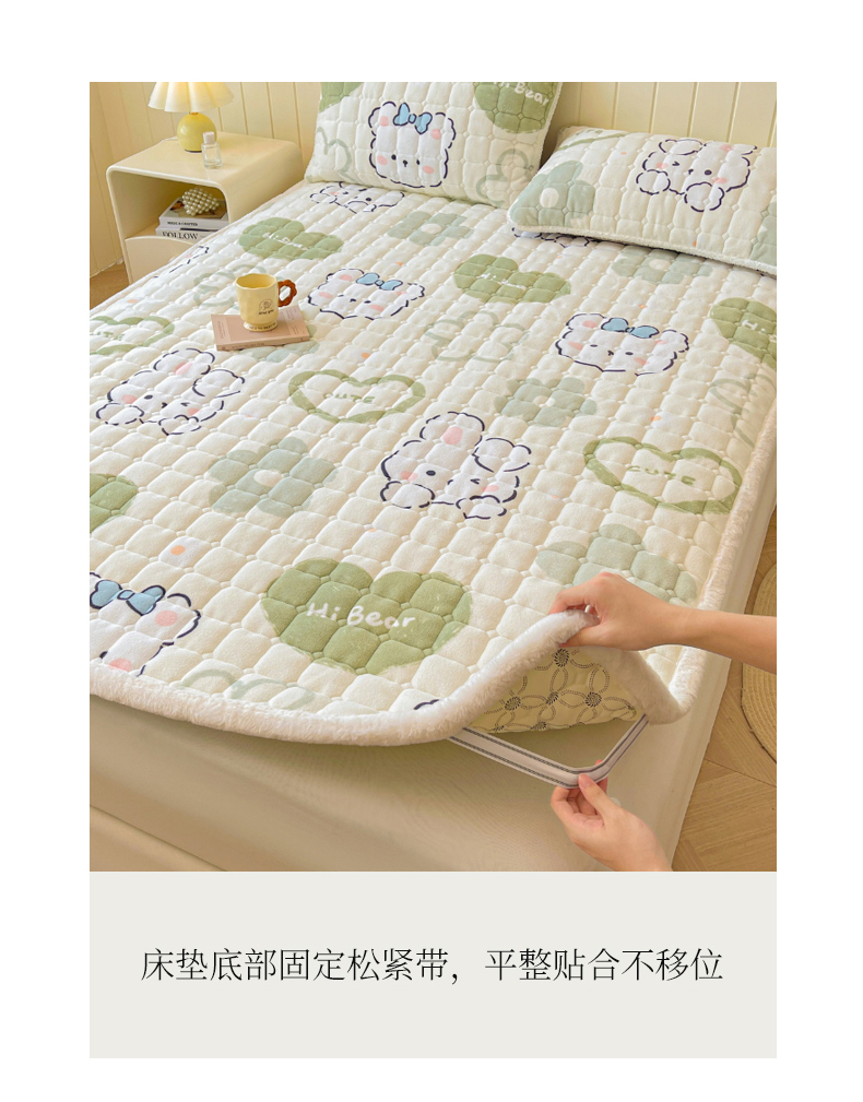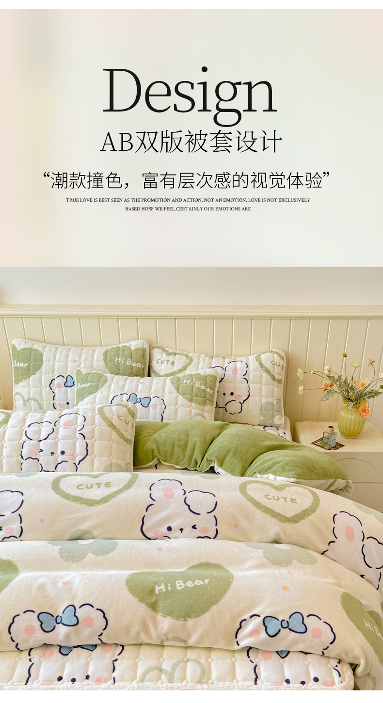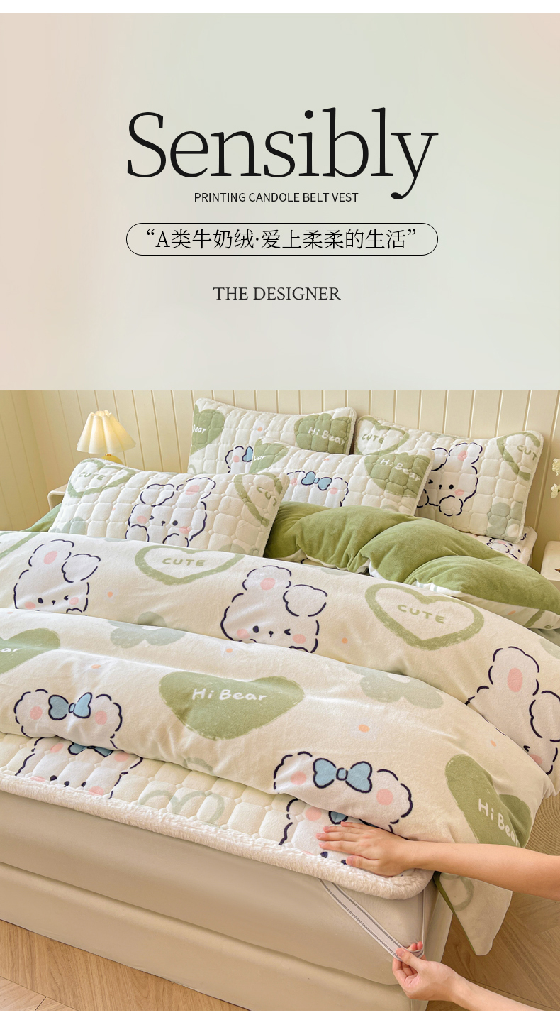 商品名称:LIFE.丽芙 2025秋冬新款A类牛奶绒加厚夹棉床褥垫+被套组合四件套 爱心小宠-绿