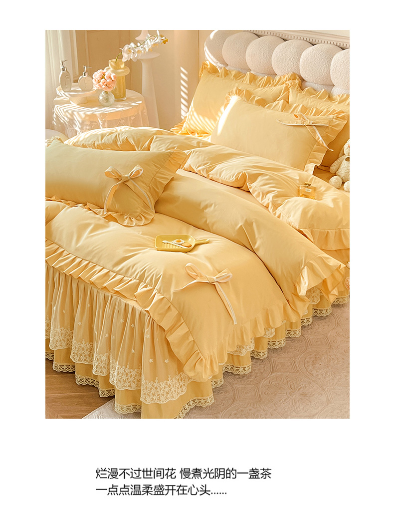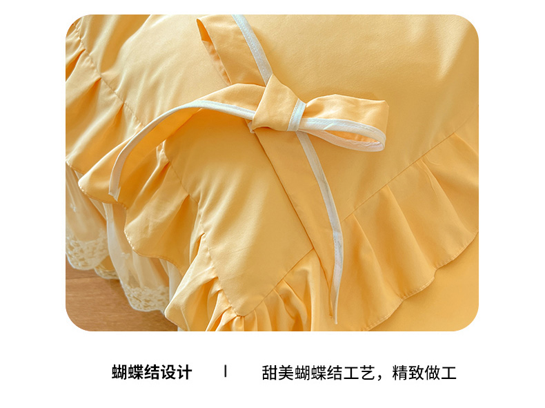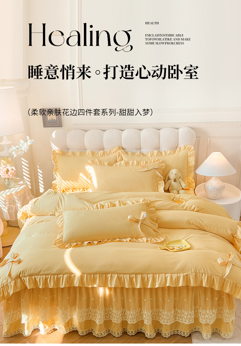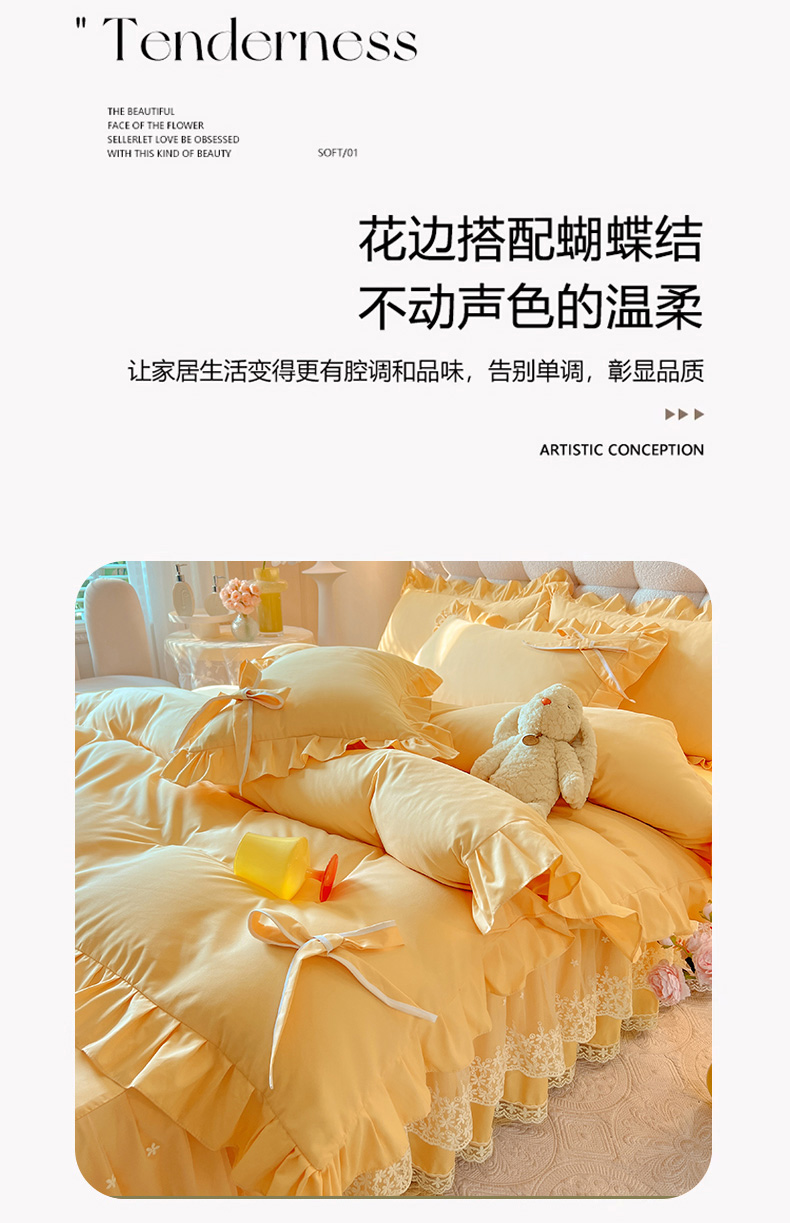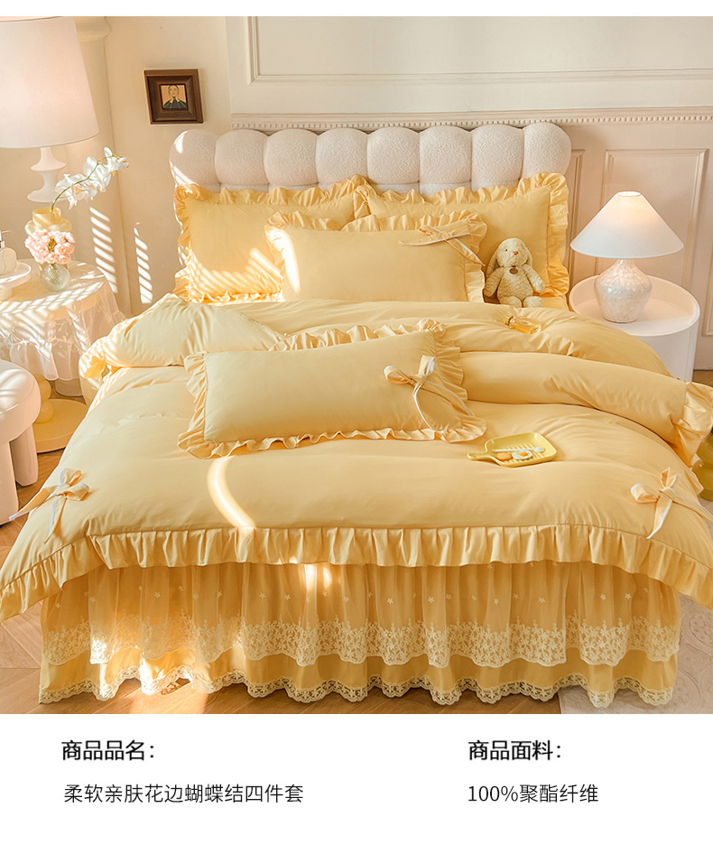 后庭寝室 2025新款亲肤舒适柔软亲肤花边蝴蝶结四件套-如愿 如愿-嫩黄