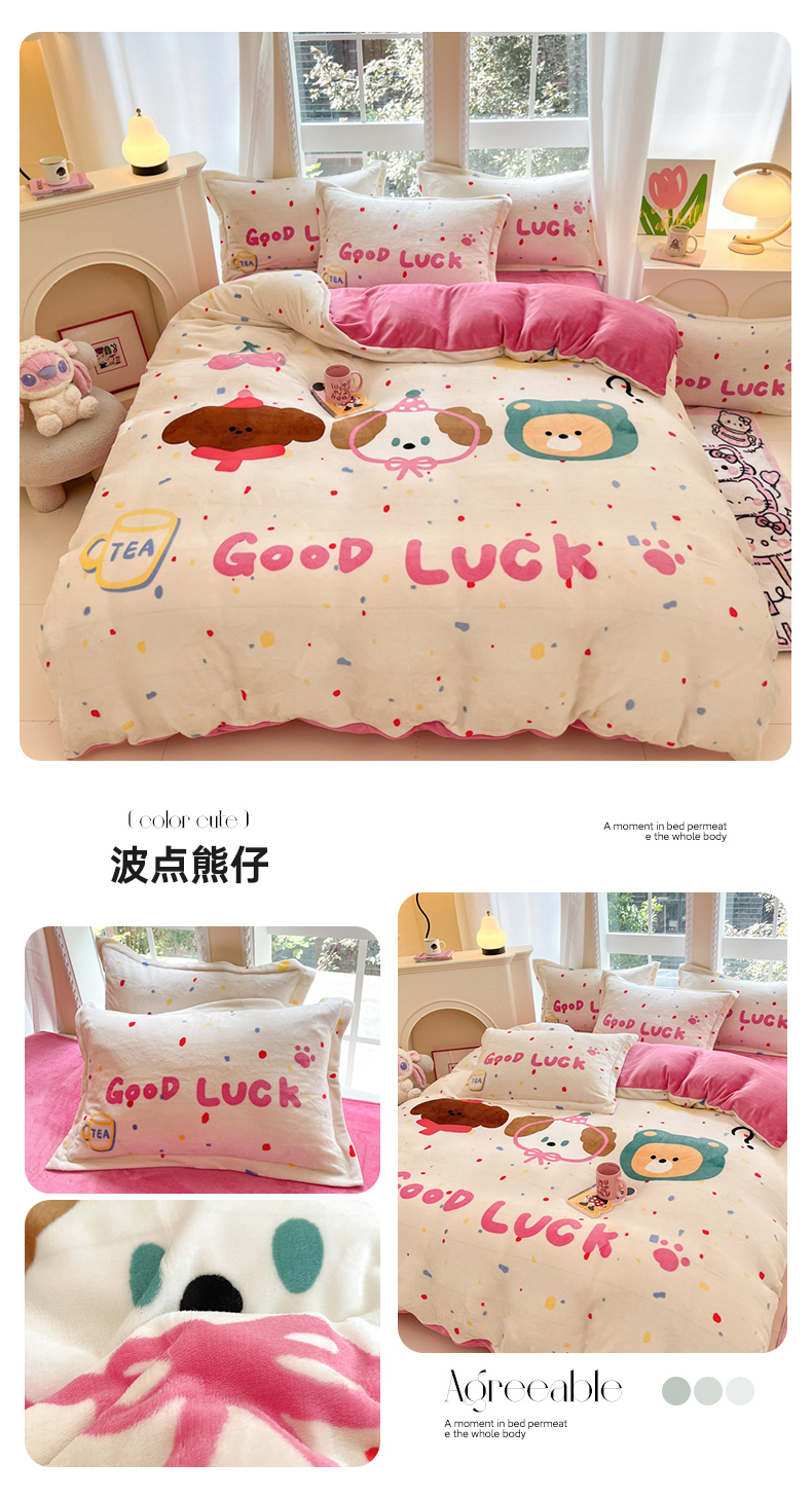 (总)喜梦缘-2025专版加厚高克重卡通大版 牛奶绒四件套大阪法莱绒现货充足,比耶狗(有三件套),波点熊仔,彩虹熊,草莓熊(有三件套),蛋仔,独角兽,公主兔,快乐猪仔,萌萌兔(有三件套),梦龙宝贝,太空漫步(有三件套),甜心公主,熊猫宝宝,熊先生,元气满满(有三件套),月亮熊,爱心草莓,花儿朵朵,花意,郁金香,腊肠派对,猫狗日记,旺旺小狗,阳光男孩(有三件套),小獭宝,小酷仔,甜梦,松鼠宝宝,喵咪,酷宝,潮兔