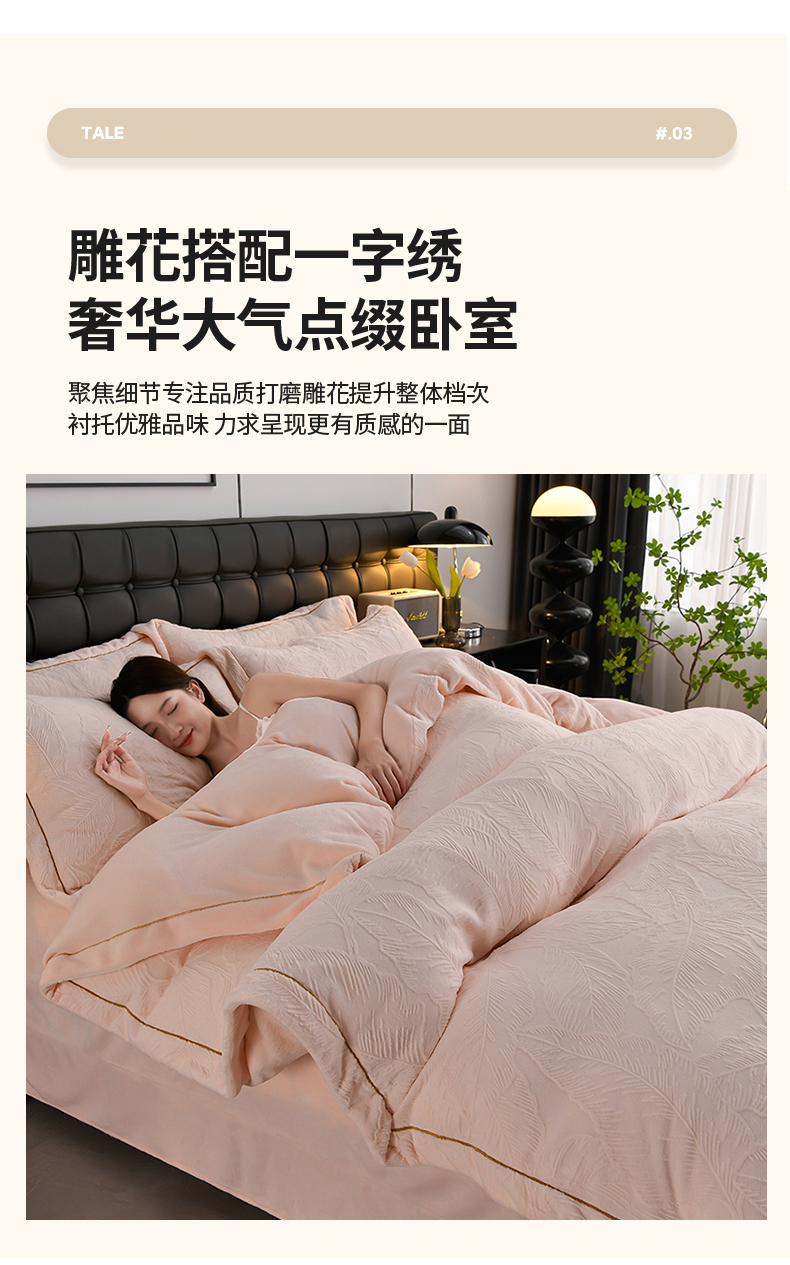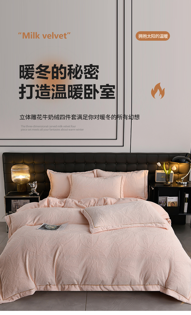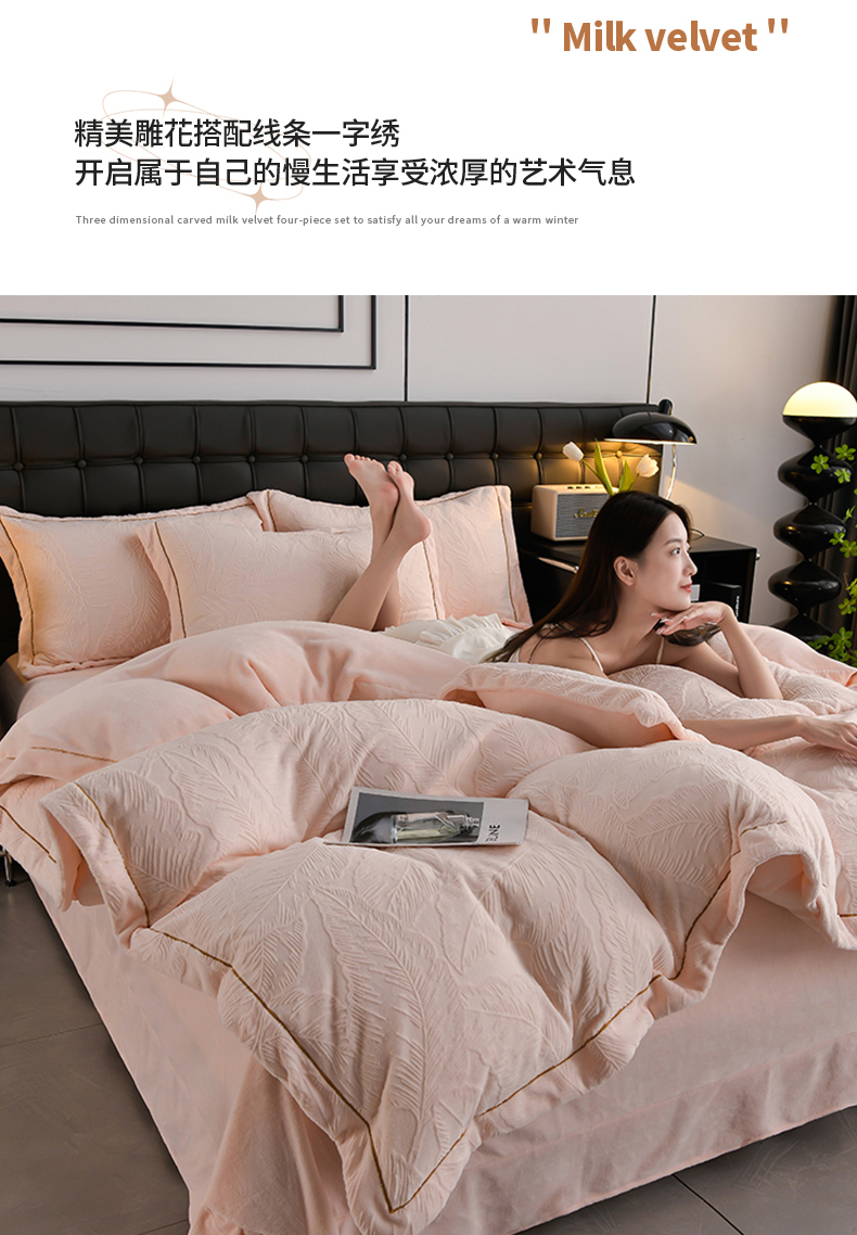 苏迪网销供货 2025新款牛奶绒四件套A类高克重全消光雕花一字绣工艺款 芭蕉叶-粉玉
