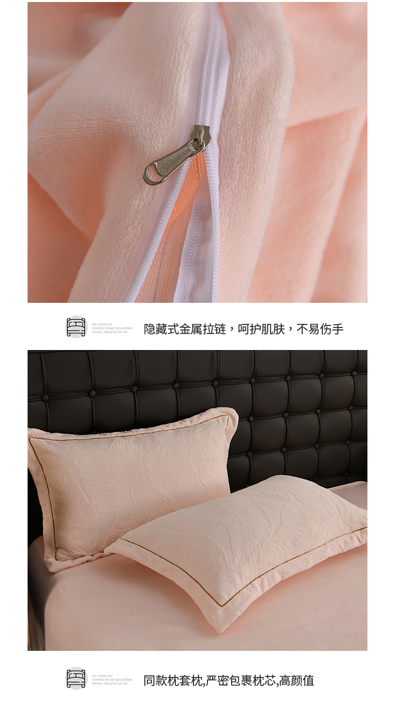 商品名称:苏迪网销供货 2025新款牛奶绒四件套A类高克重全消光雕花一字绣工艺款 芭蕉叶-粉玉
