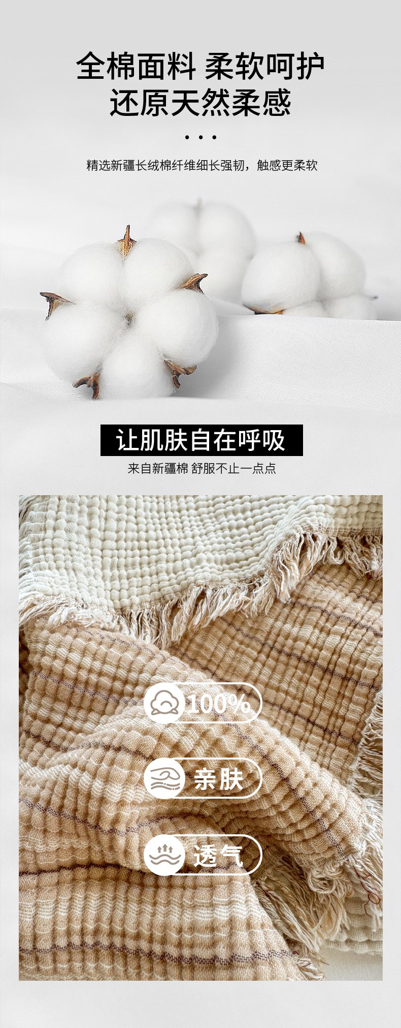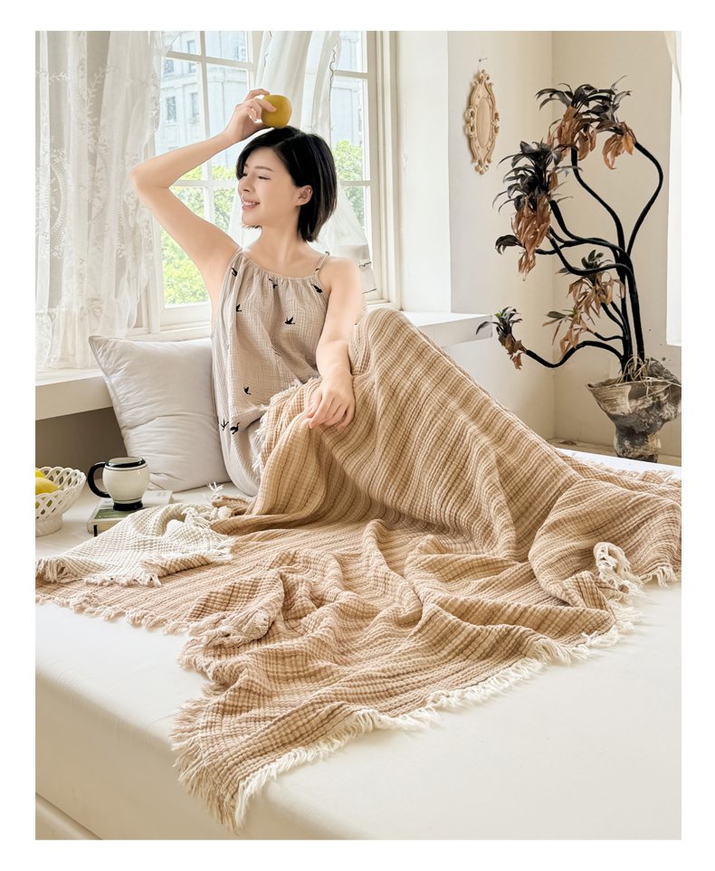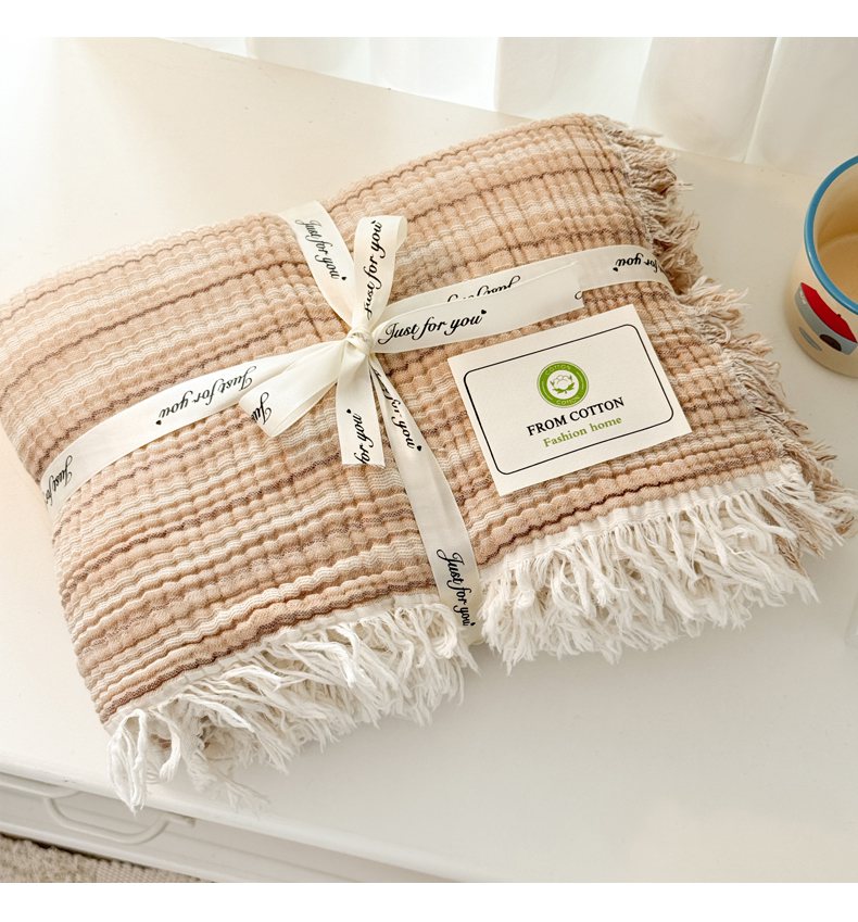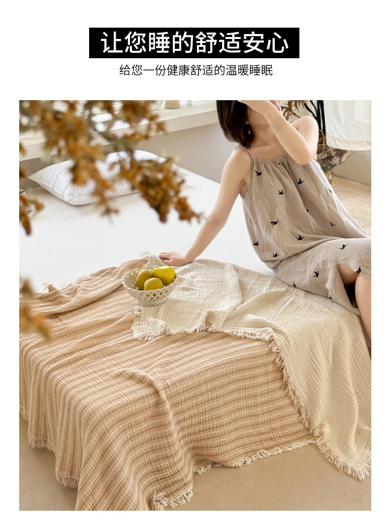 商品名称:梵克保罗 2025新款双层纱流苏全棉纯棉毯纯棉流苏款盖毯毯子夏被夏凉被空调被 条纹驼
